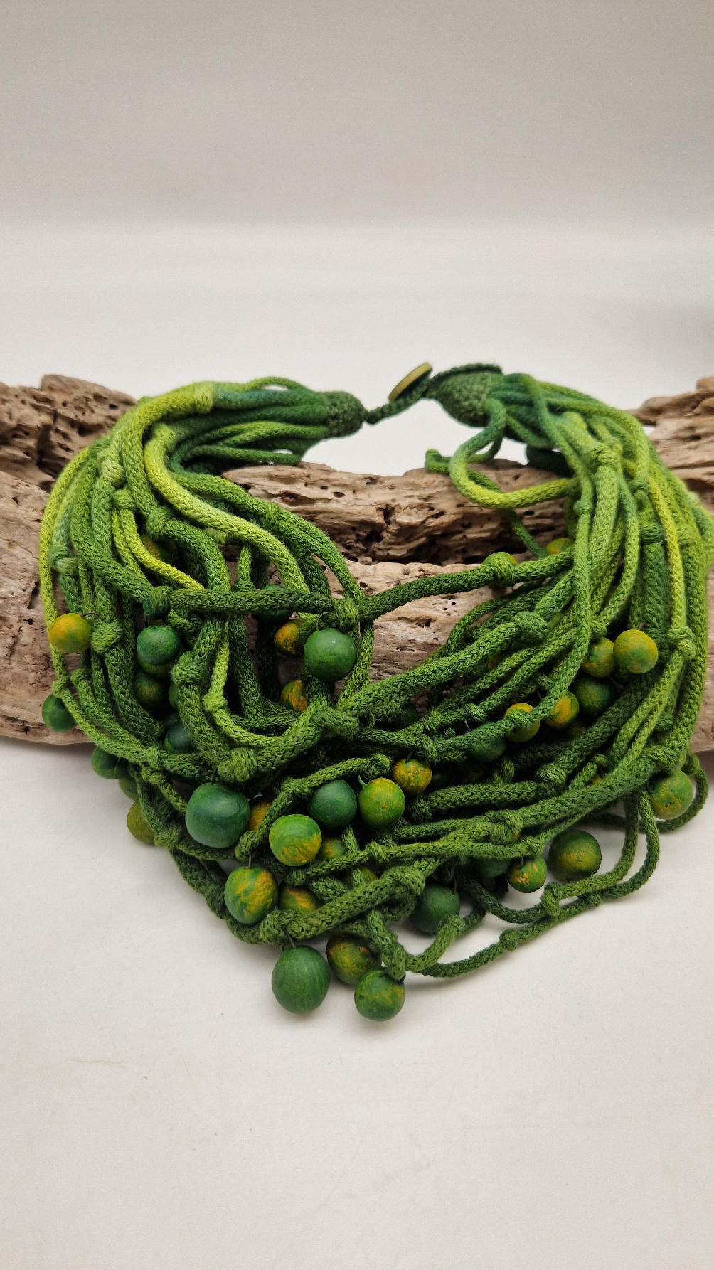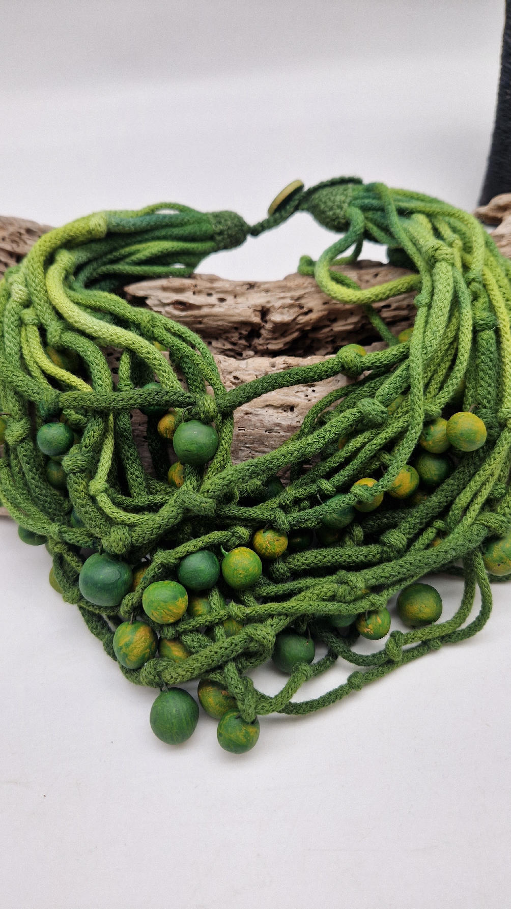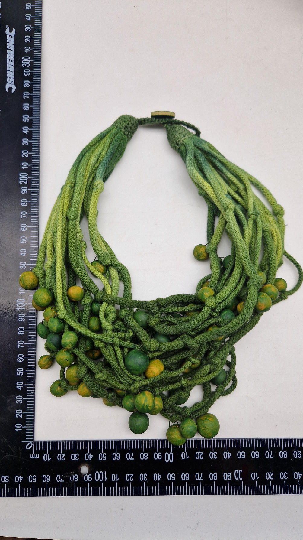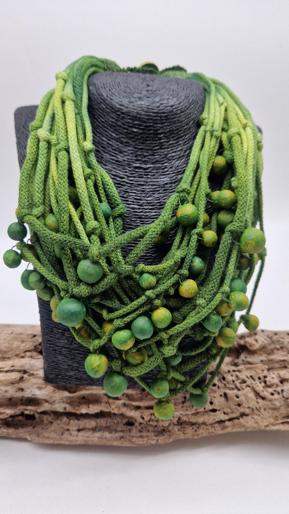 Naszyjnik, wykonany z bawełnianych, ręcznie farbowanych sznurków , w odcieniach soczystej zieleni , młodych liści, z cytrynami, letniego drzewa…, do których zostały przymocowane dziesiątki uformowanych ręcznie, wypalonych i zabarwionych niemal magicznie koralików.