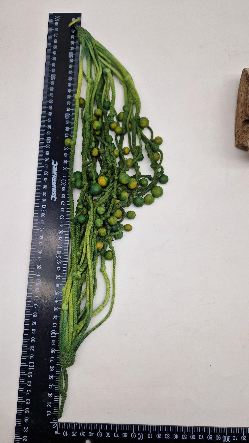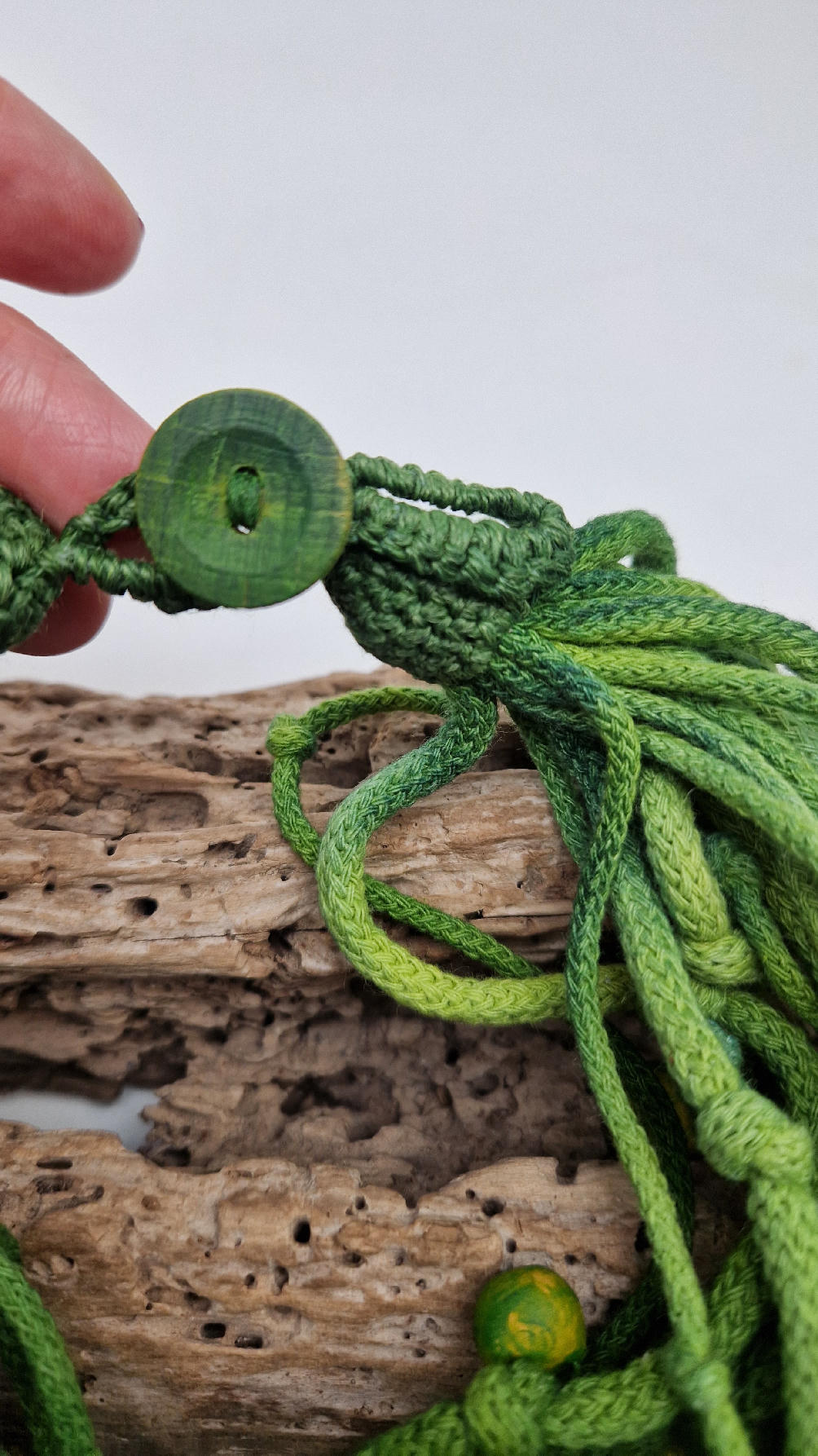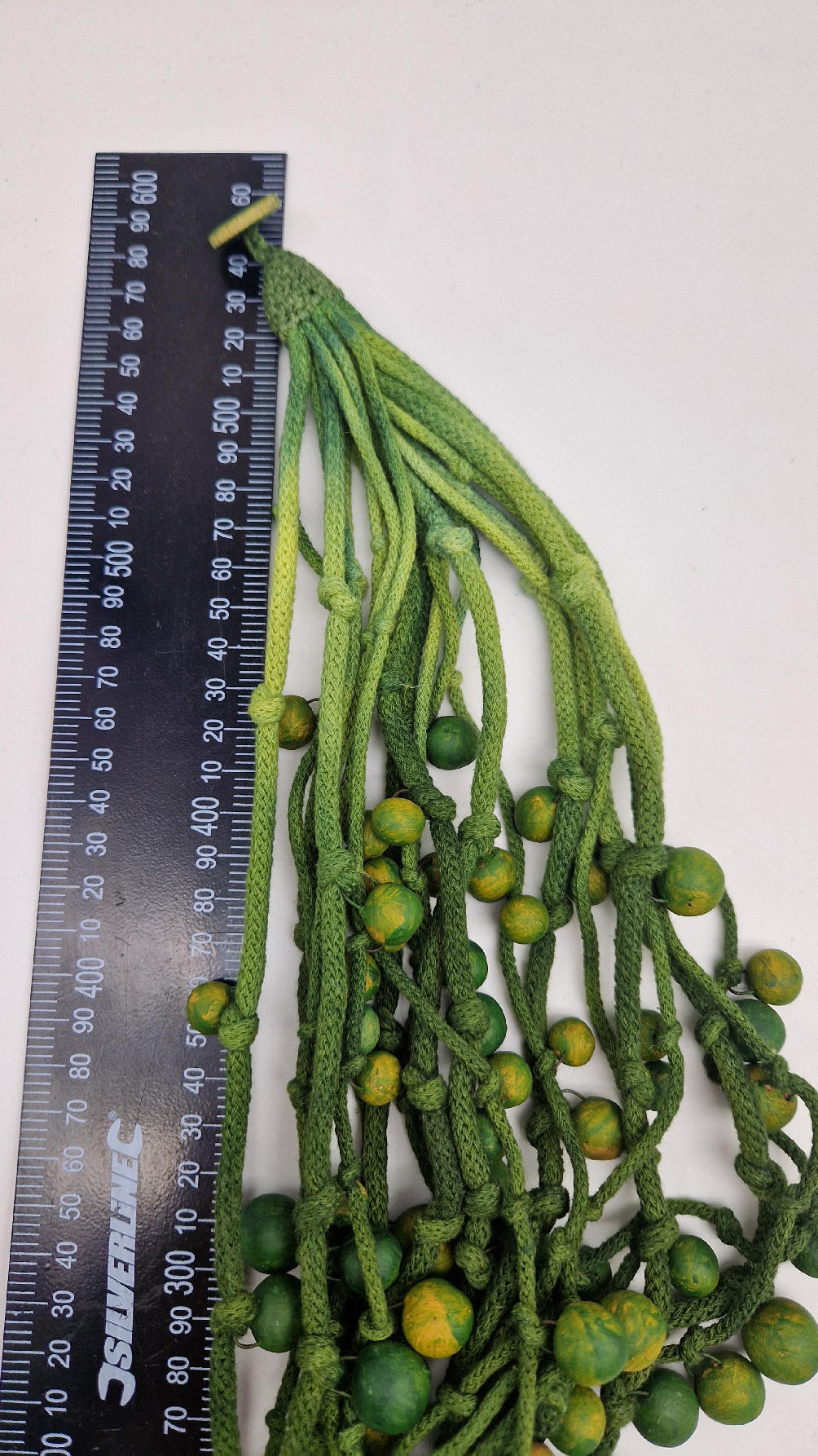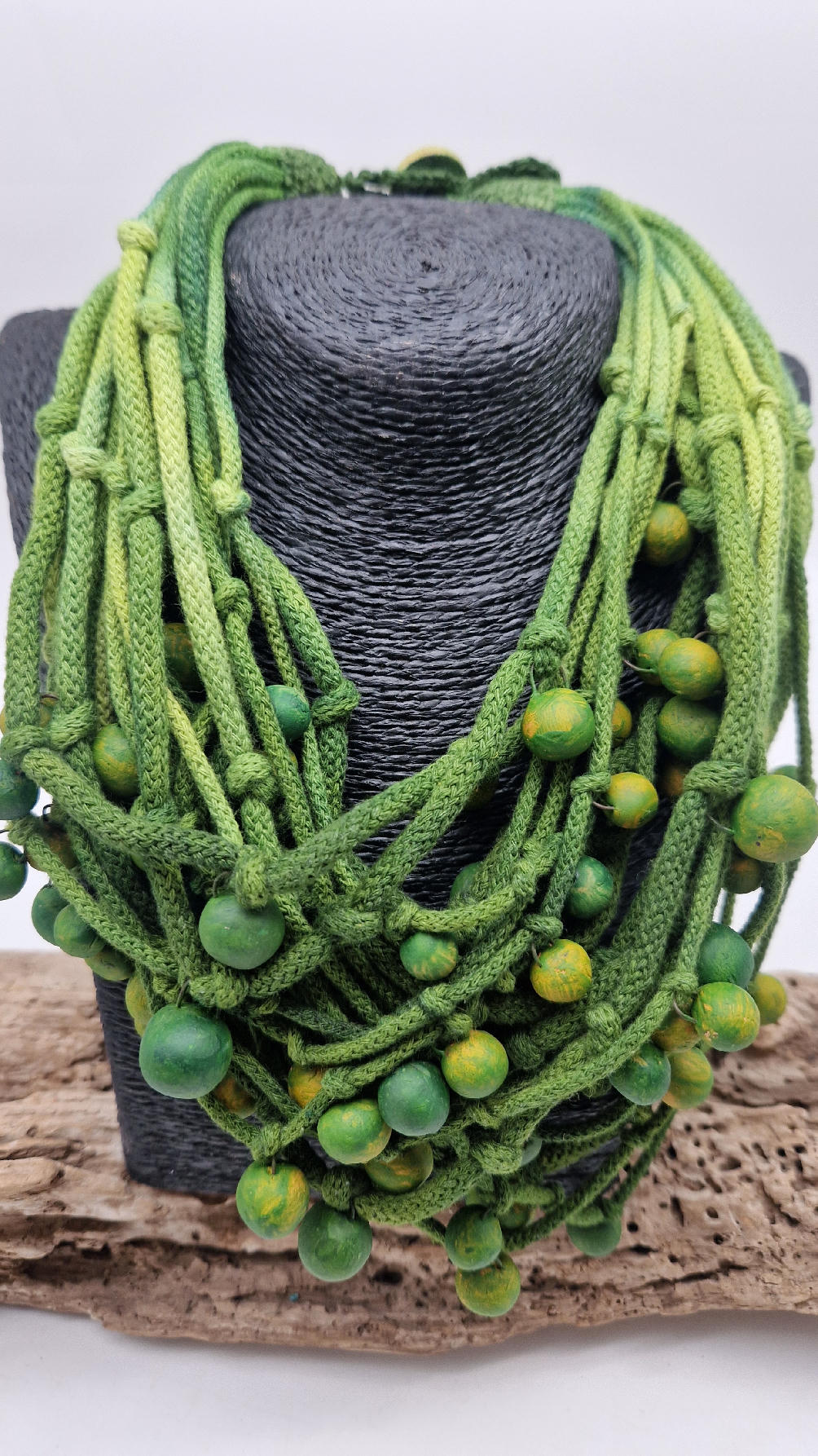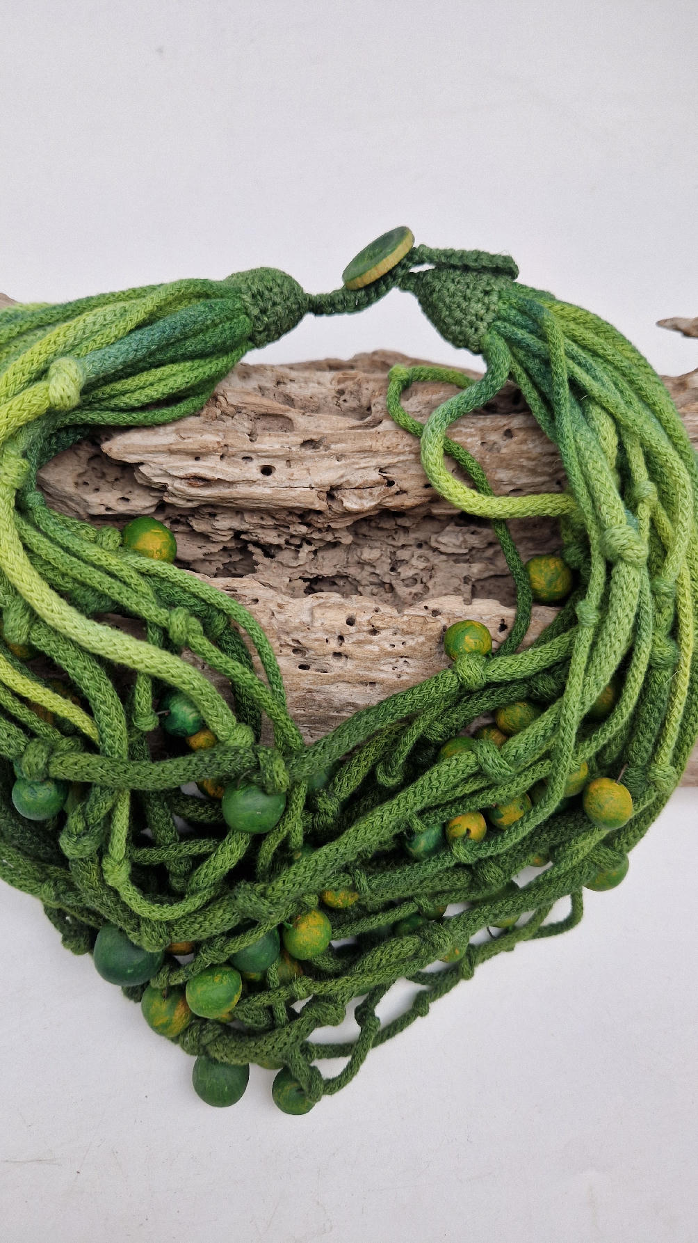Naszyjnik, wykonany z bawełnianych, ręcznie farbowanych sznurków , w odcieniach soczystej zieleni , młodych liści, z cytrynami, letniego drzewa…, do których zostały przymocowane dziesiątki uformowanych ręcznie, wypalonych i zabarwionych niemal magicznie koralików.