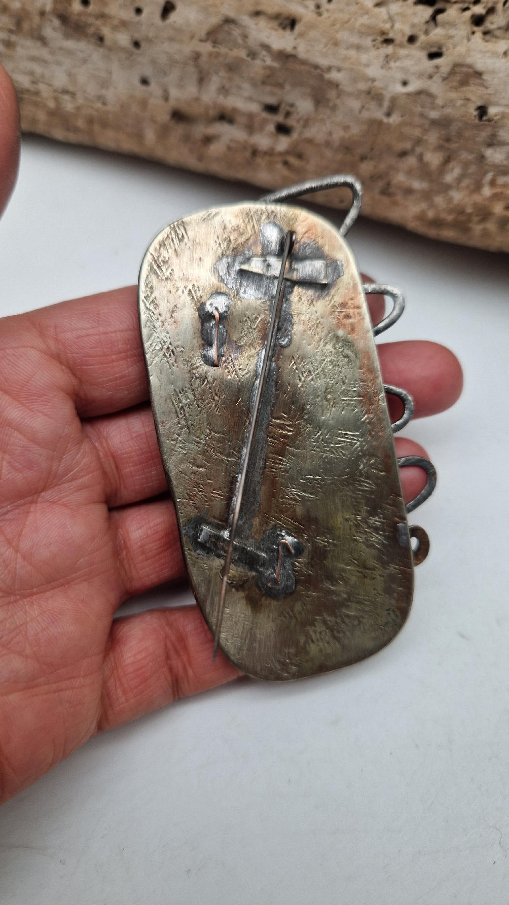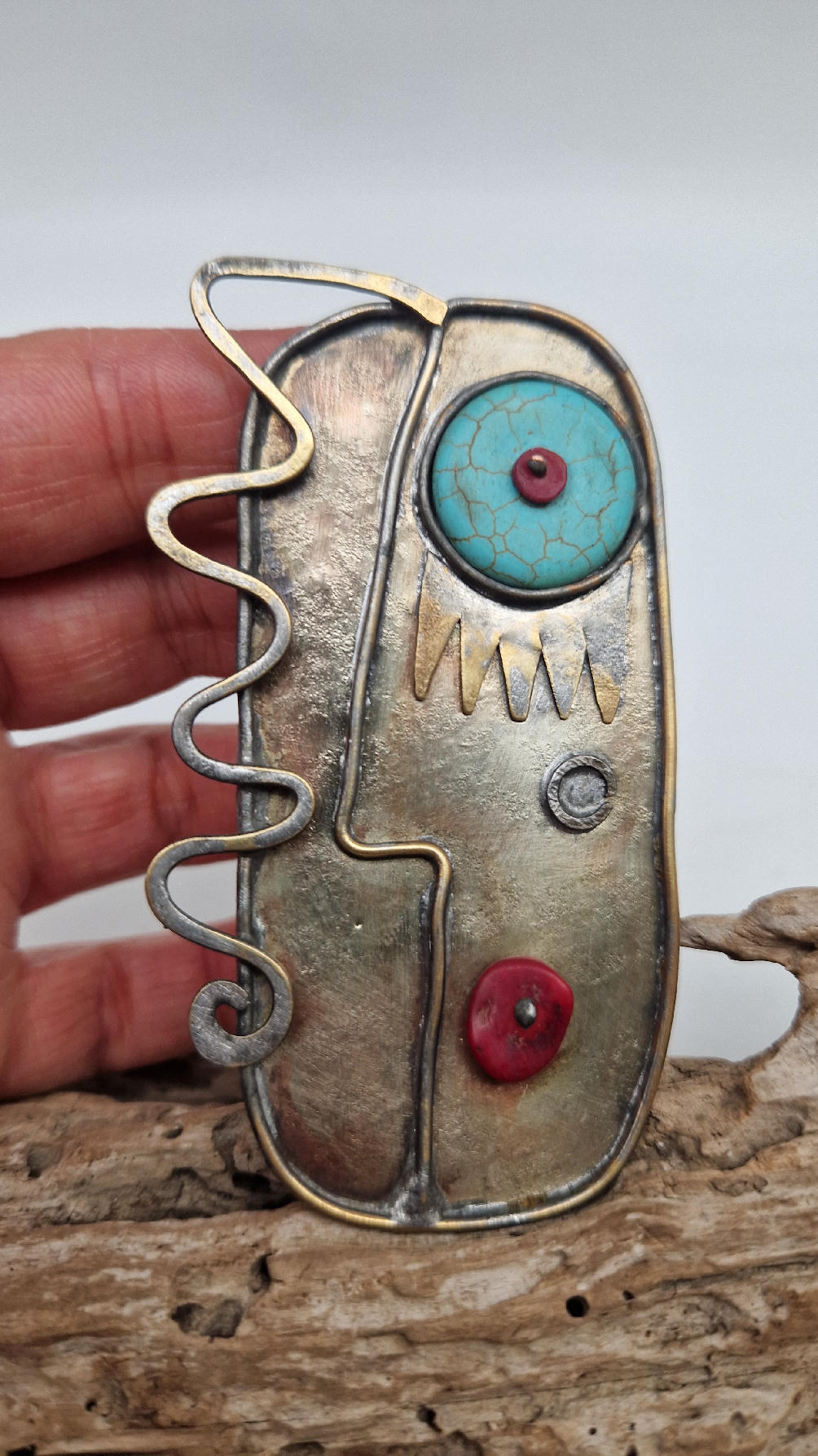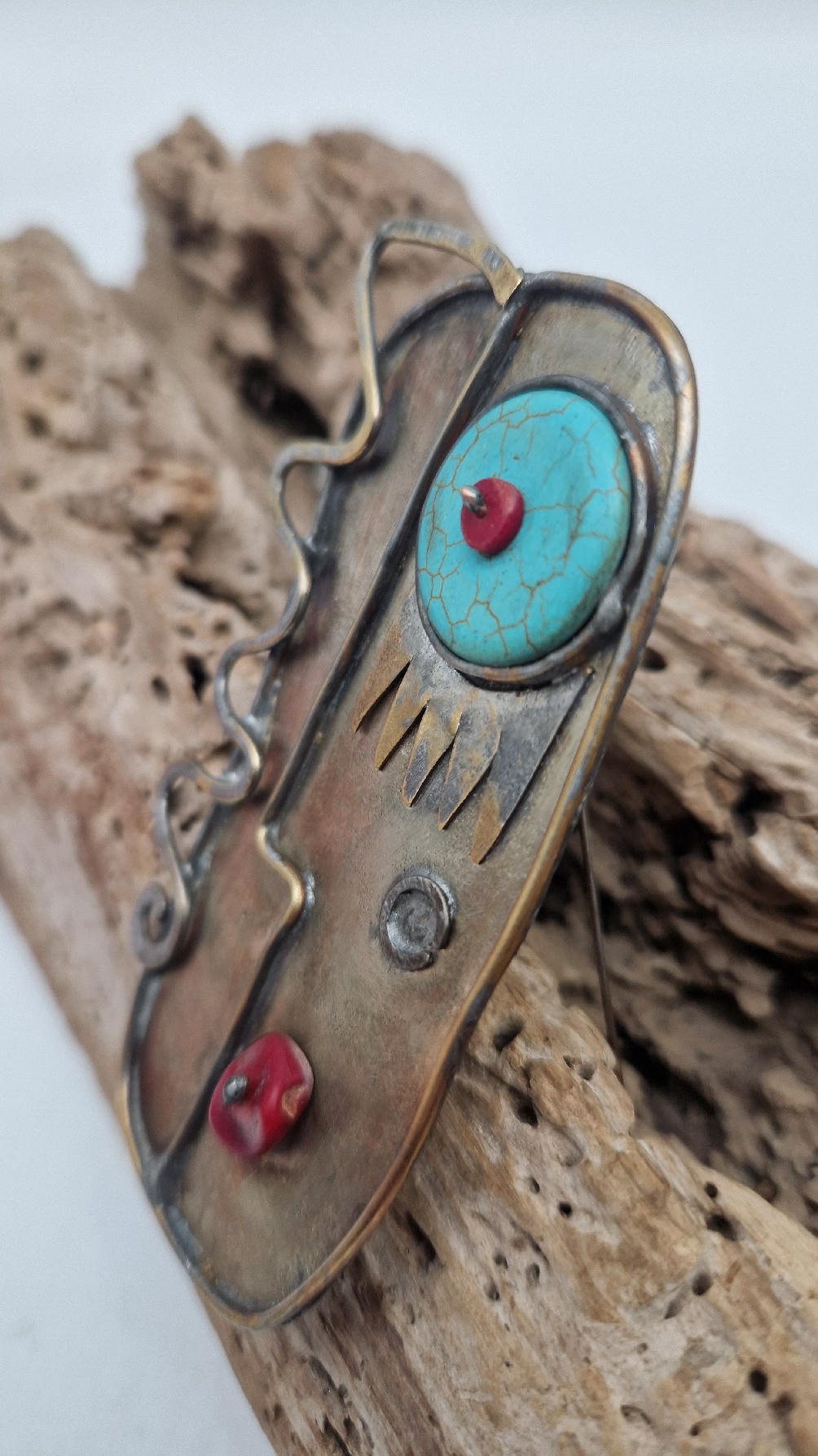 Brocha zrobiona jest z blachy alpakowej i mosiężnego drutu, zapinana na dużą szpilę, , oko z turkusu, usta z korala