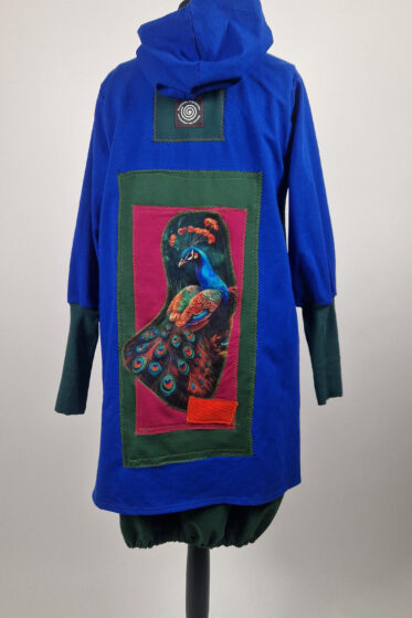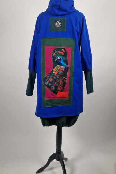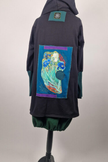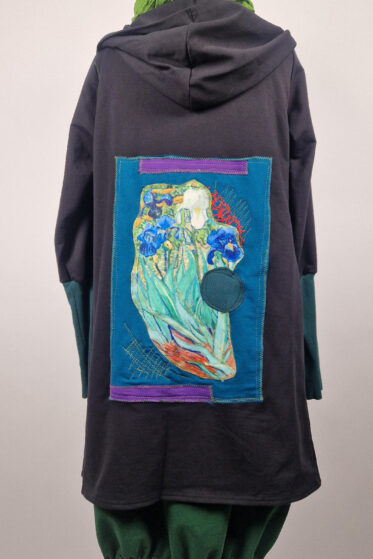 Uszyty z grubej bawełny „drapanej” cudny, ciepły otulak w odcieniu głębokiej butelkowej zieleni, z czarnymi mankietami i unikatową aplikacją na plecach.