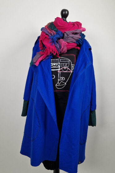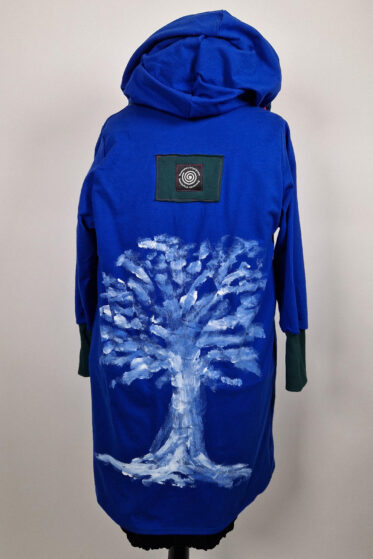 Uszyty z grubej bawełny „drapanej” cudny, ciepły otulak w odcieniu głębokiej butelkowej zieleni, z czarnymi mankietami i unikatową aplikacją na plecach.