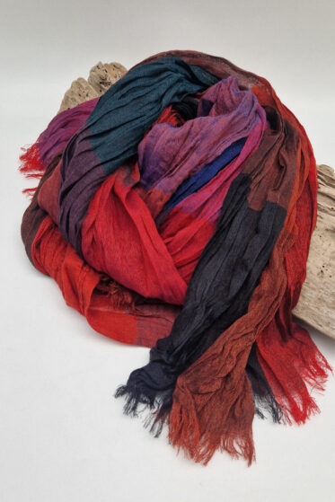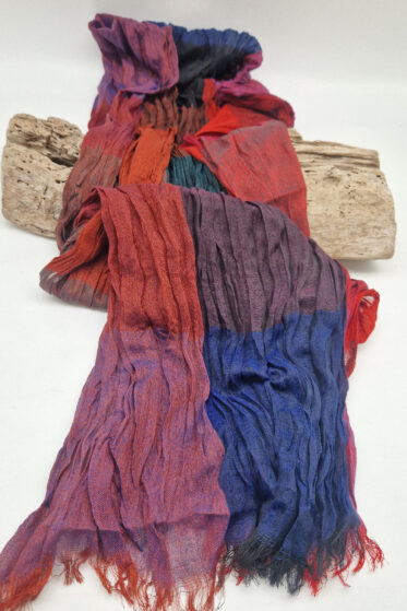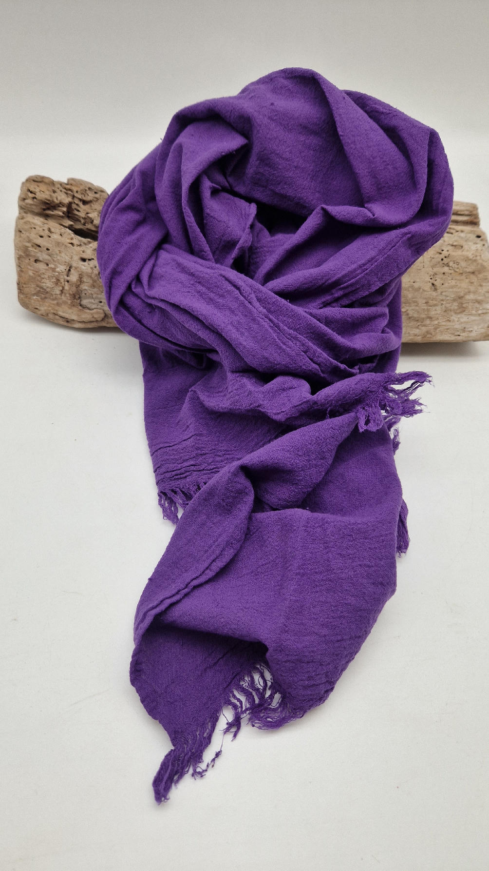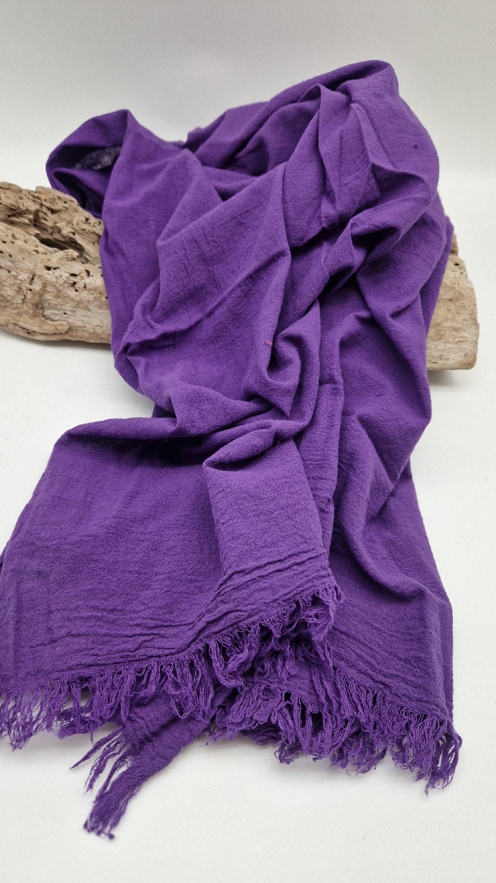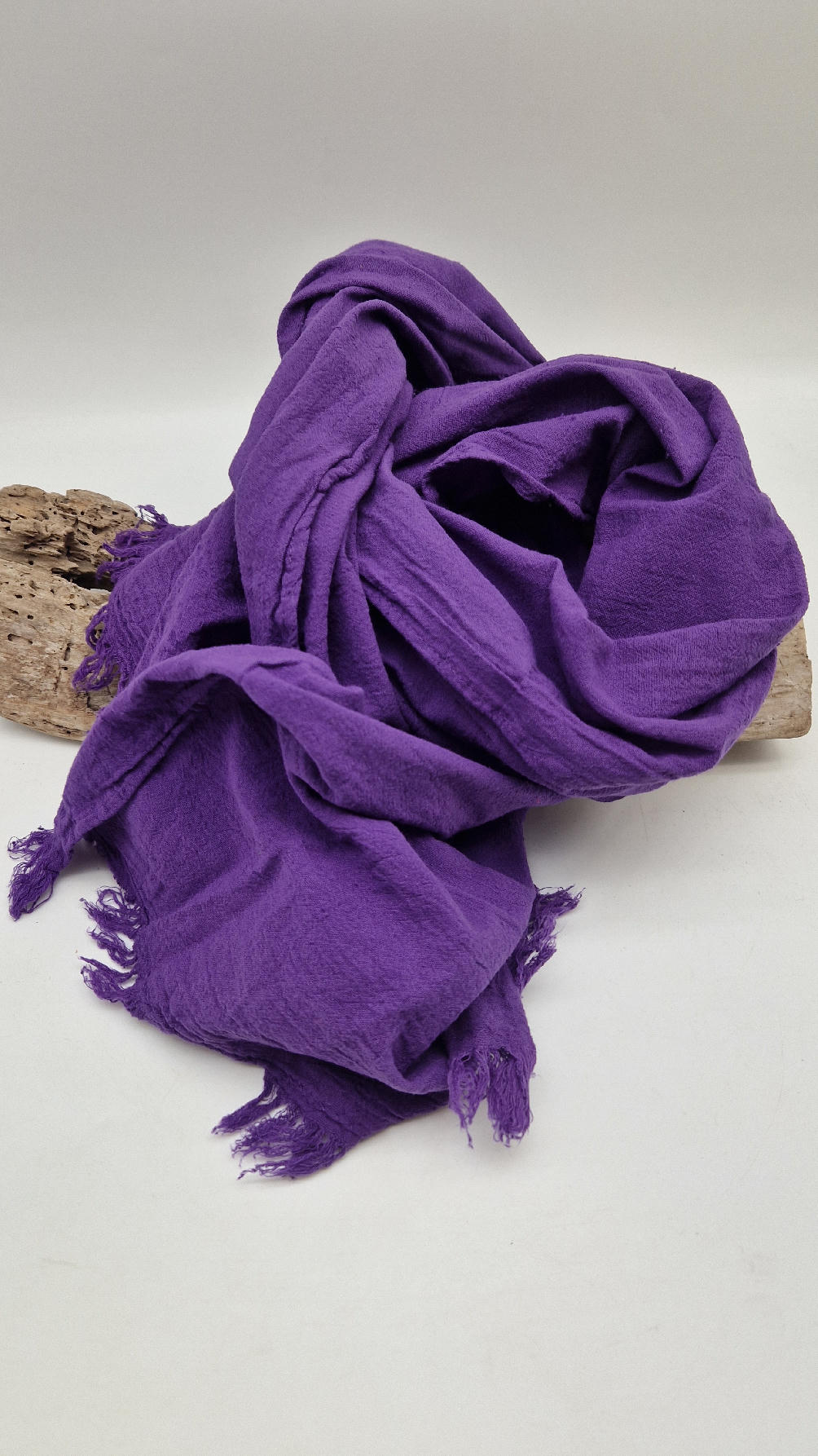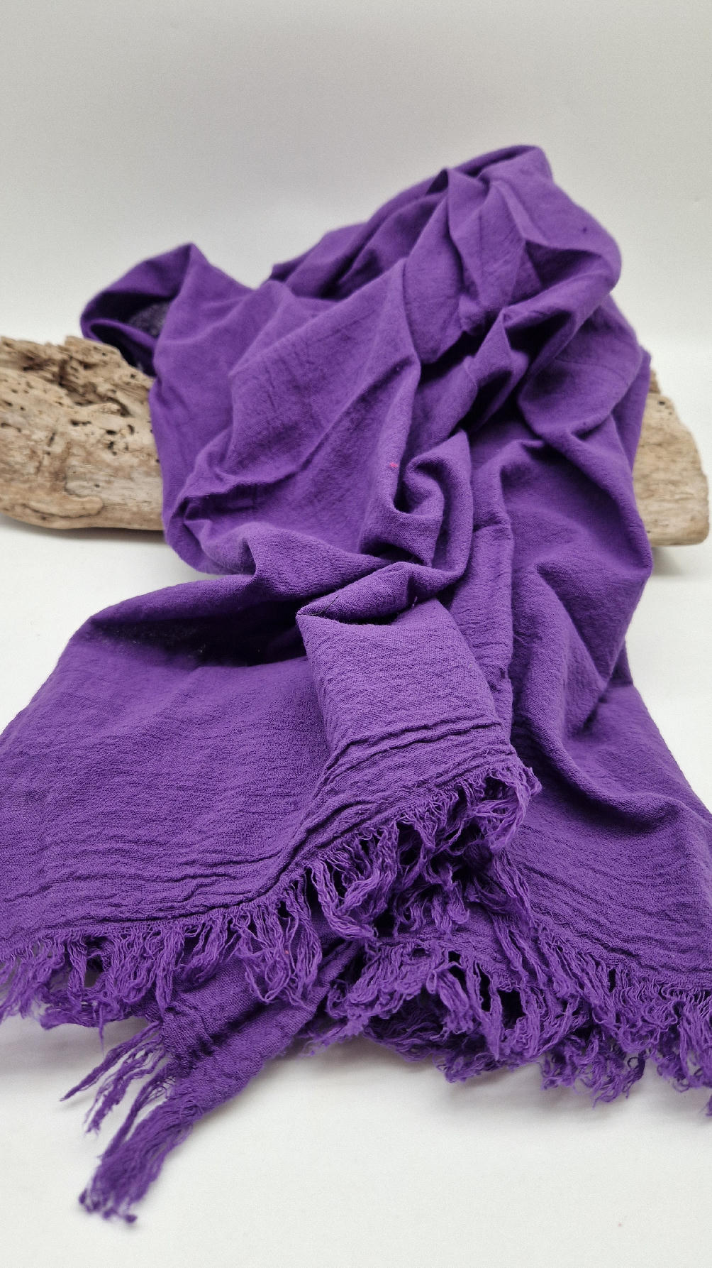 Duży, piękny szal z bawełny w bardzo głębokim kolorze, bardzo fioletowy , robiony ręcznie, pognieciony i zwariowany , z frędzlami .