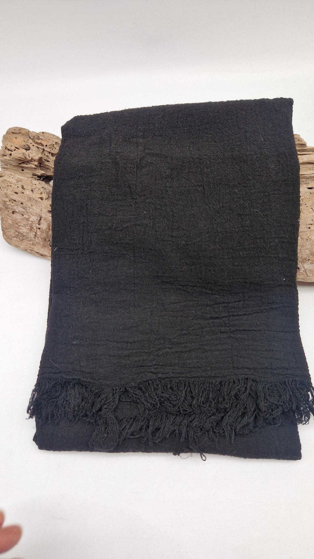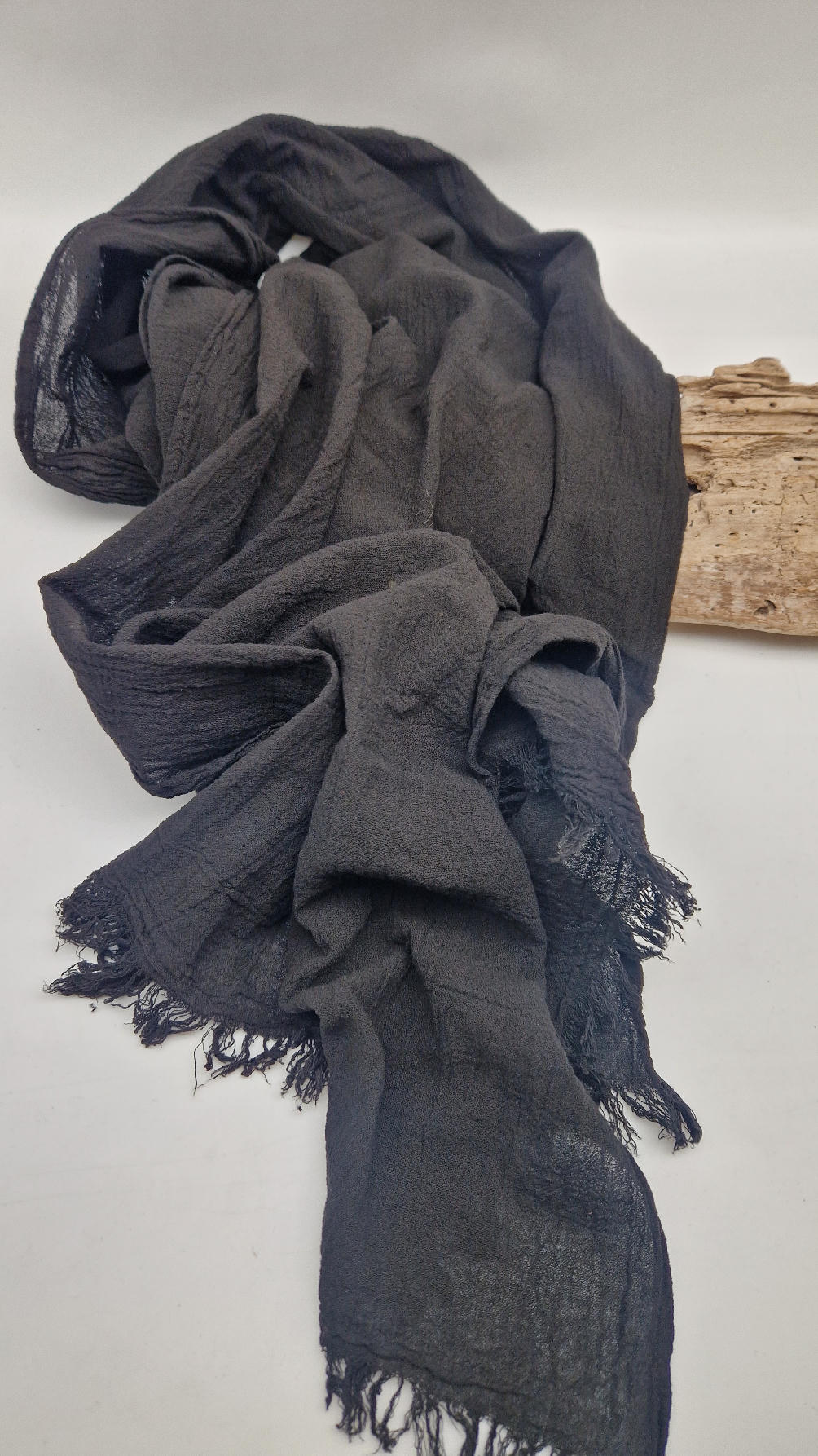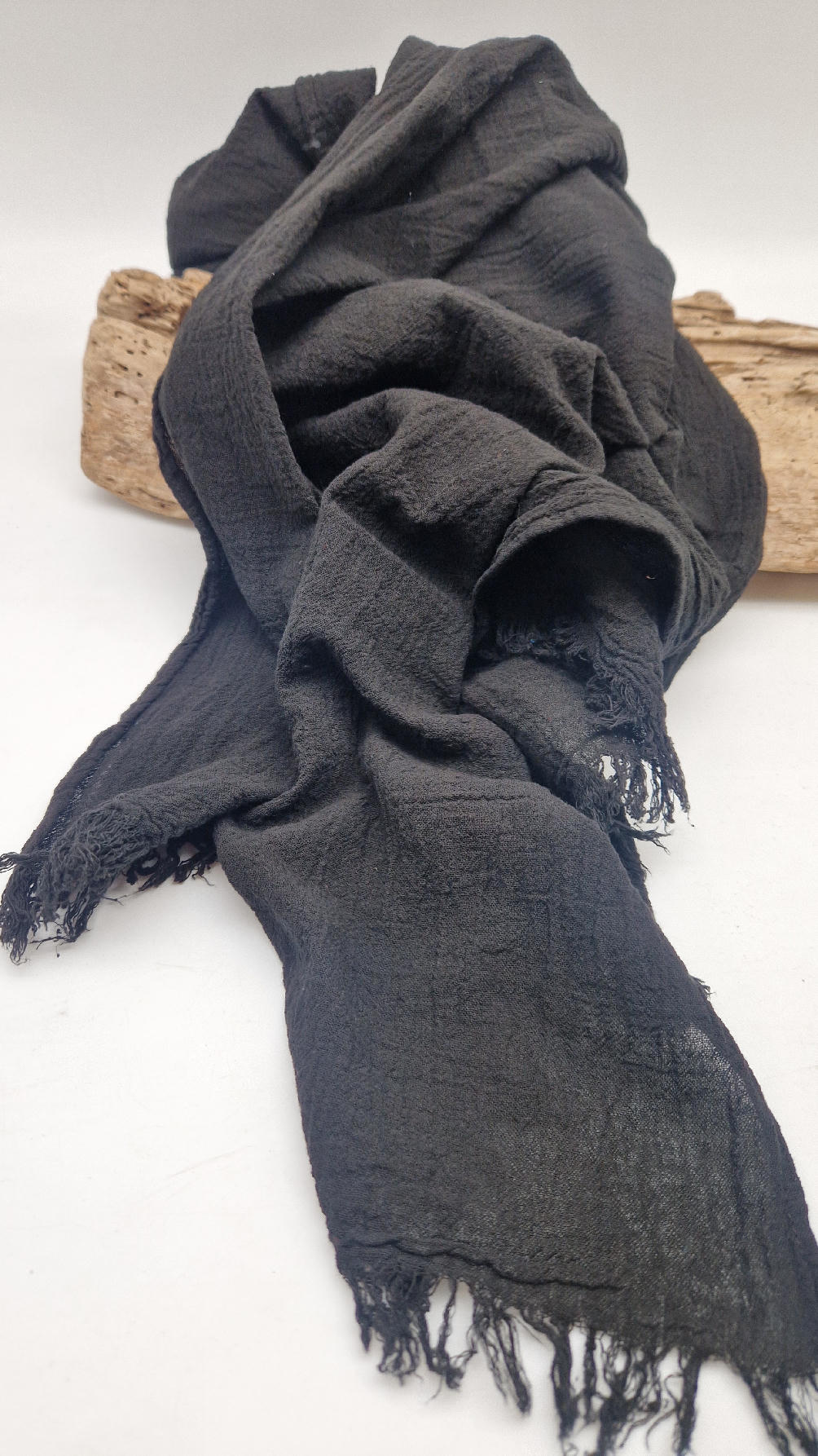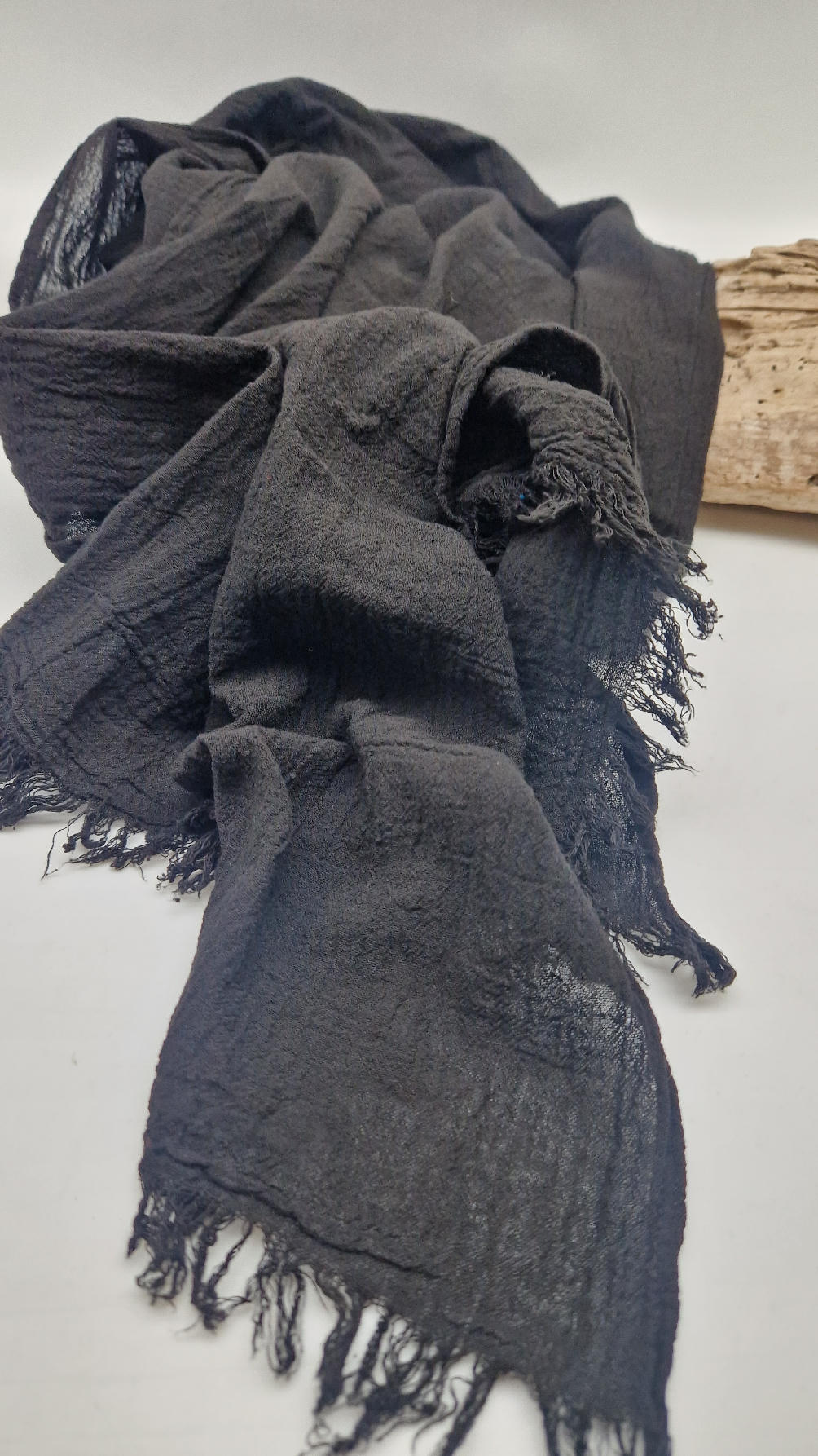 Duży, piękny szal z bawełny w bardzo głębokim kolorze, kwintesencja czerni, z natury pognieciony i zwariowany , z frędzlami .