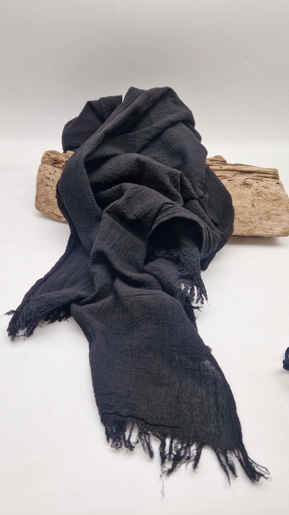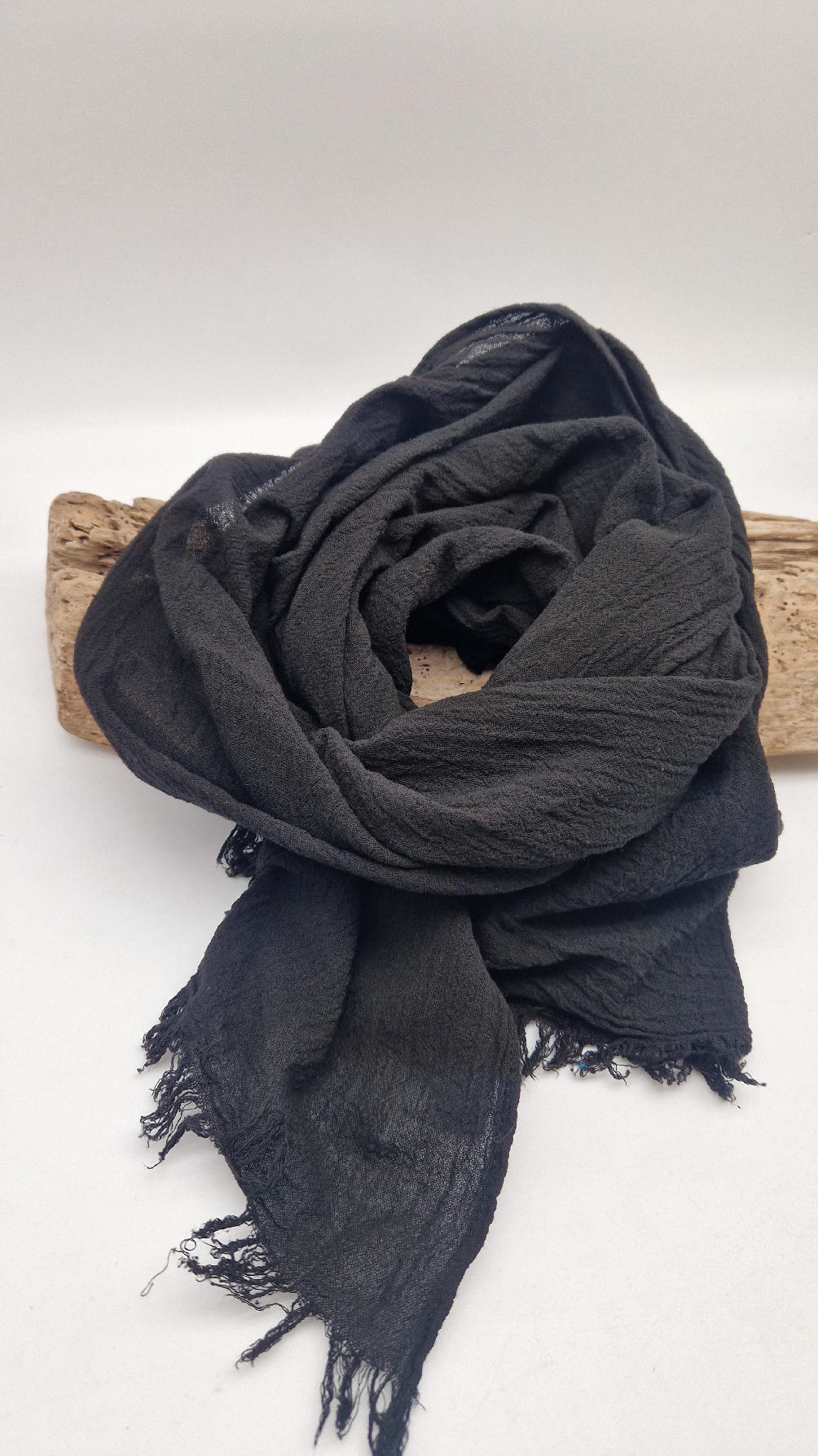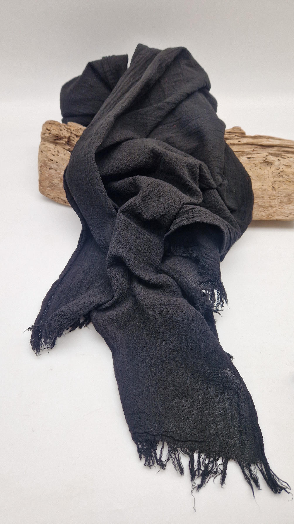 Duży, piękny szal z bawełny w bardzo głębokim kolorze, kwintesencja czerni, z natury pognieciony i zwariowany , z frędzlami .