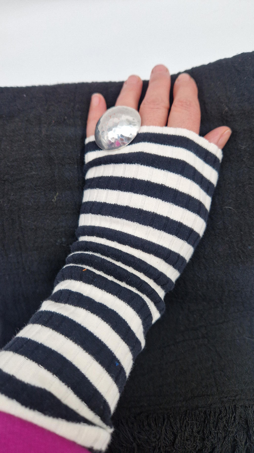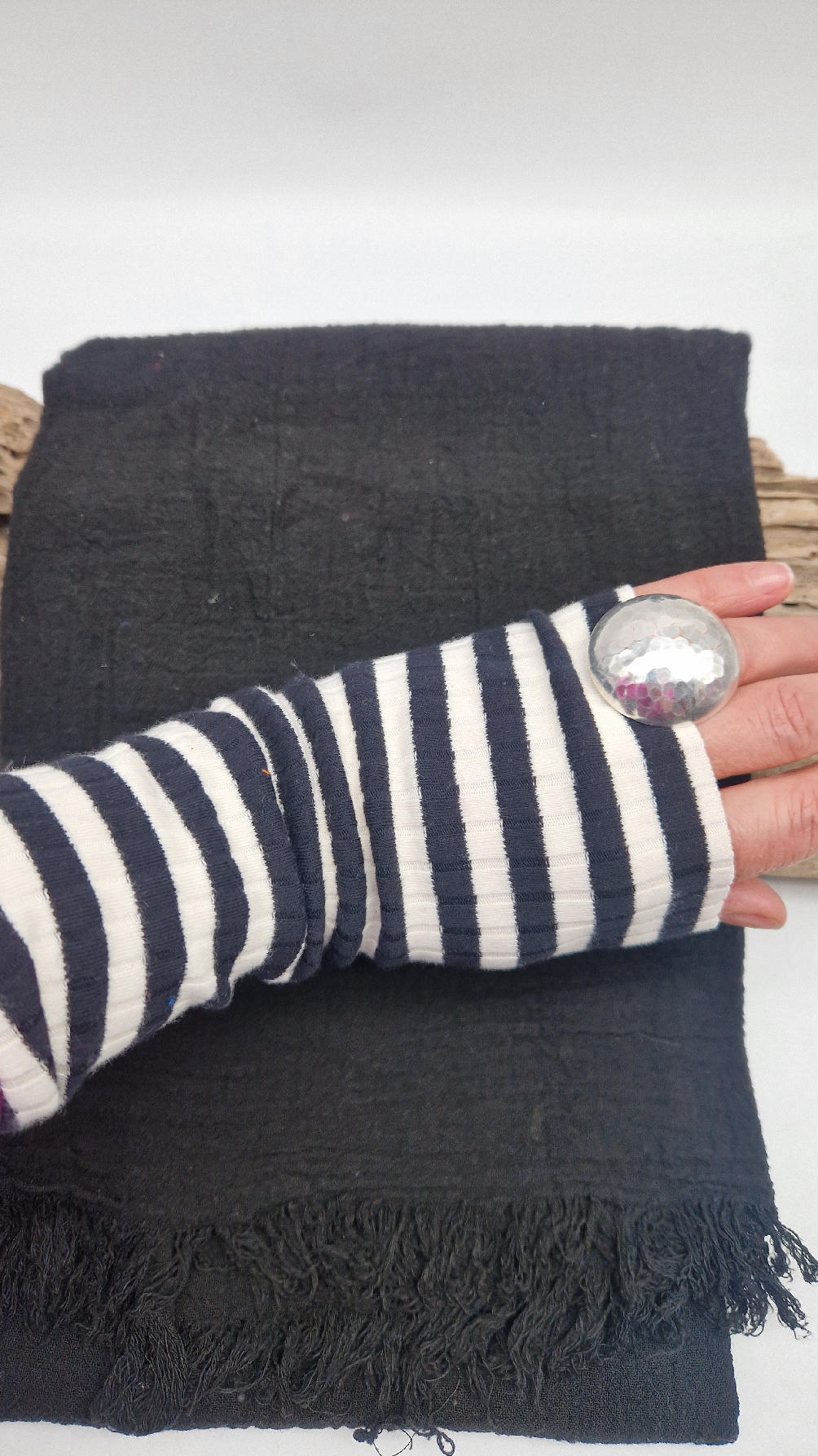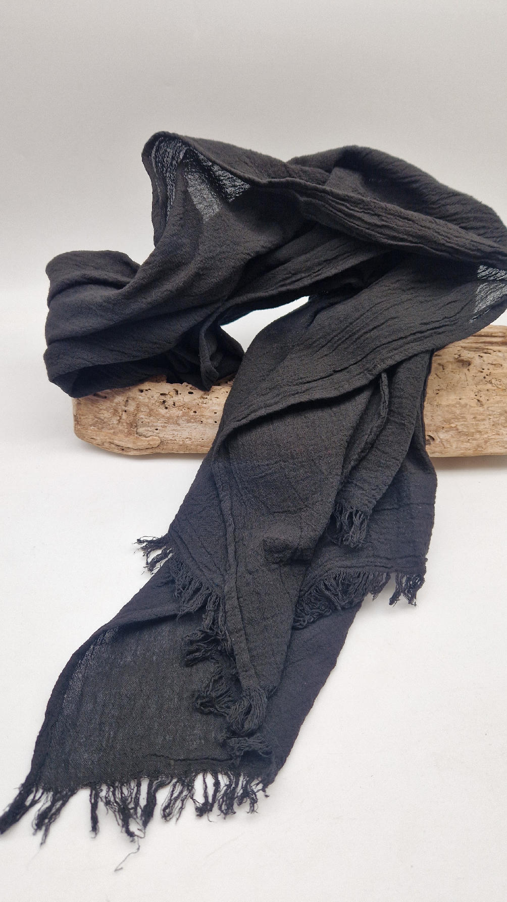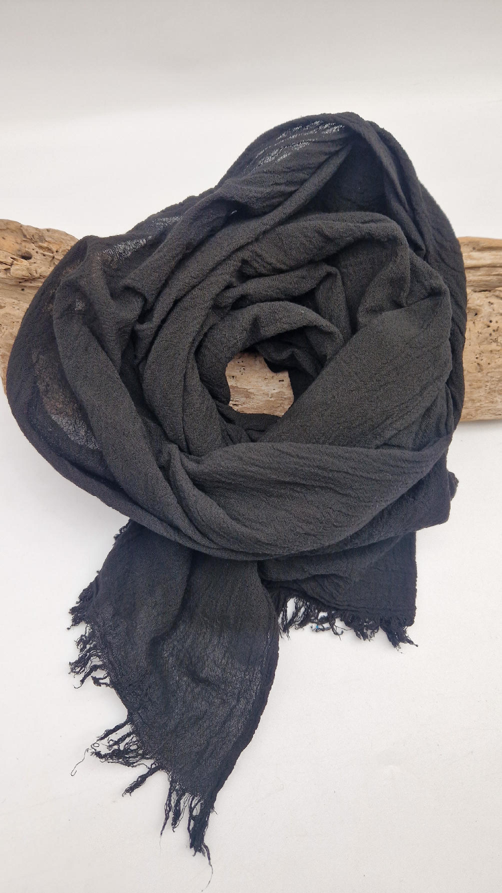 Duży, piękny szal z bawełny w bardzo głębokim kolorze, kwintesencja czerni, z natury pognieciony i zwariowany , z frędzlami .