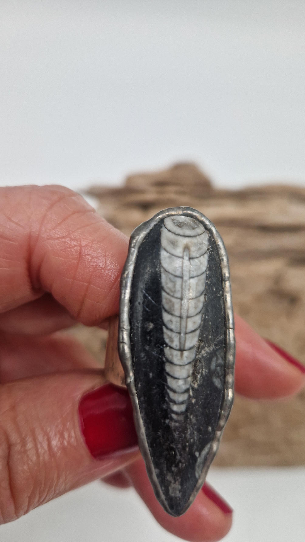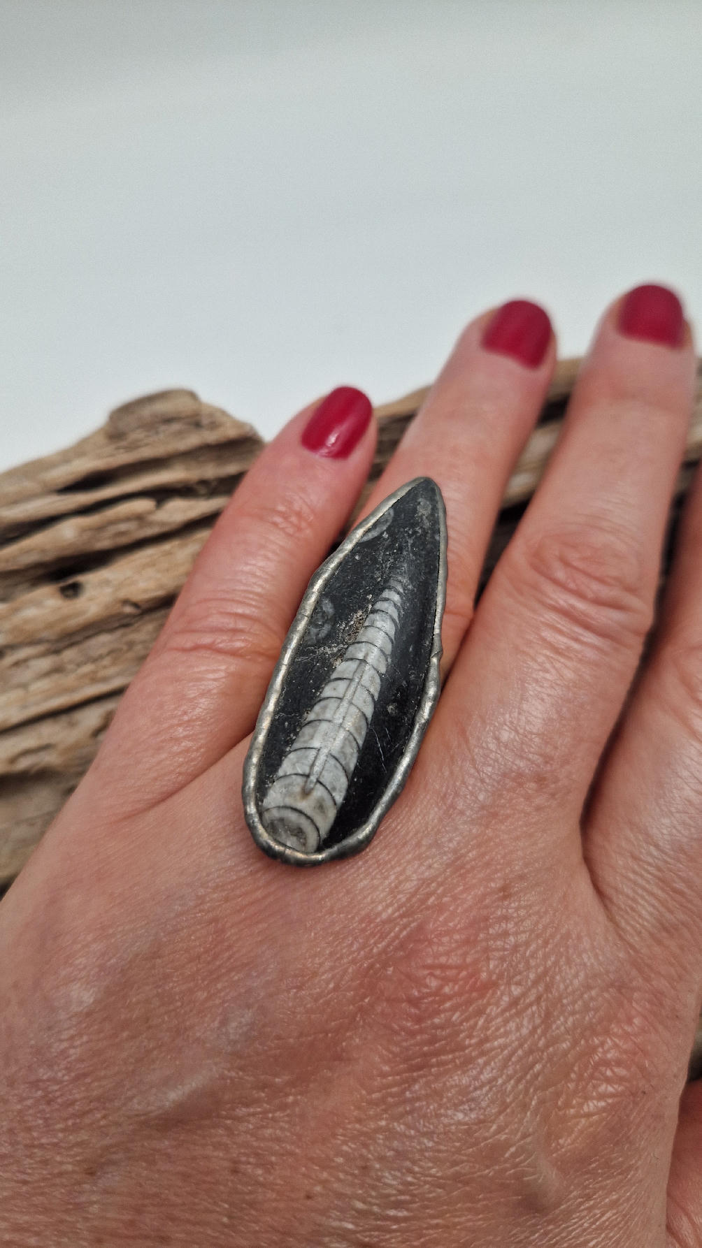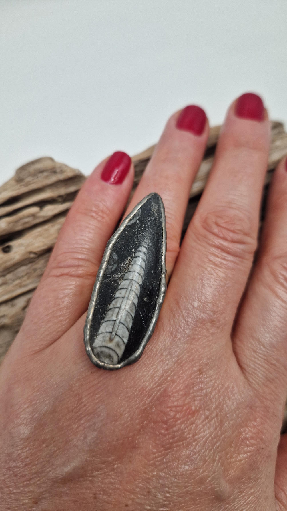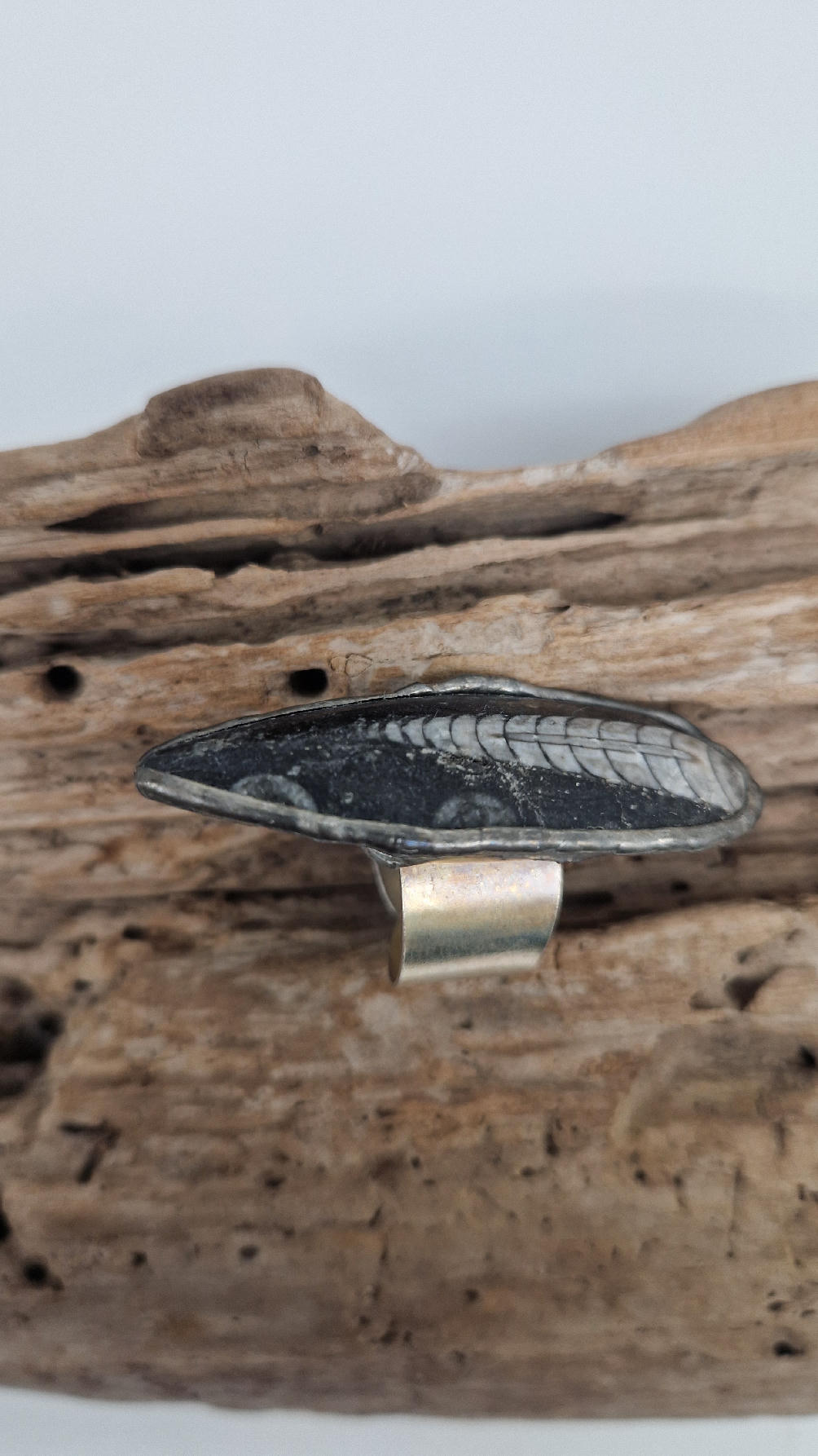 Niezwykle piękny, duży, podłużny pierścionek, którego oczkiem jest piękny  ortoceras,  skamieniały prehistoryczny stwór- ale bardzo ładny i elegancki…oprawiony w kutą i patynowaną  i srebrzoną miedź. Piękna metaloplastyka z pięknym kamieniem . Pierścionek ma regulowaną obrączkę, więc pasuje na każdy palec…ale możesz powiesić go na łańcuszku lub rzemieniu, jeśli nie lubisz pierścionków, a podoba Ci się forma i kamień…