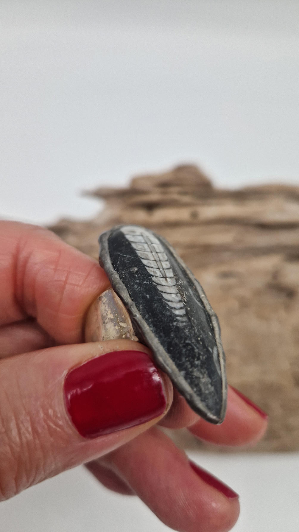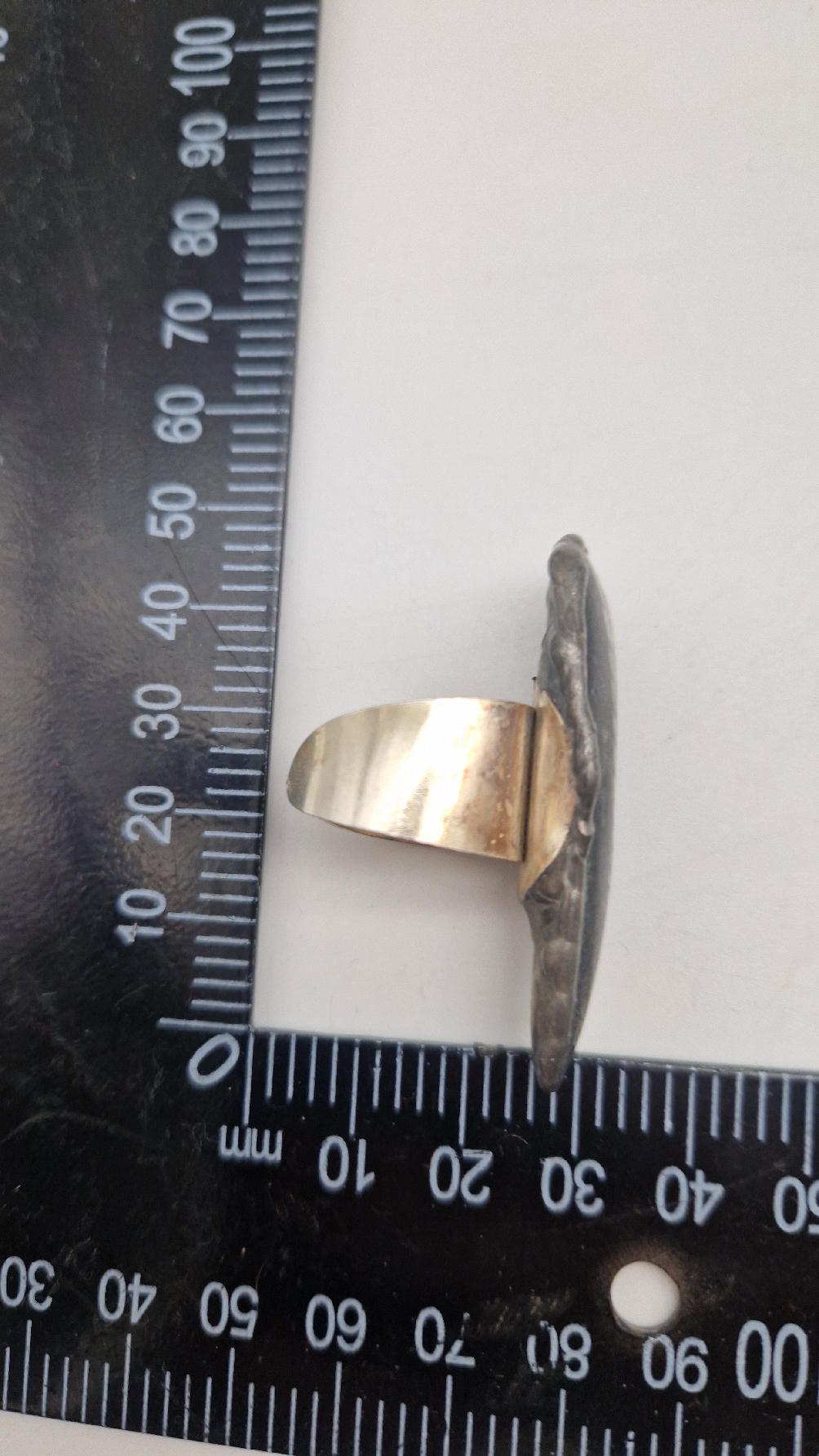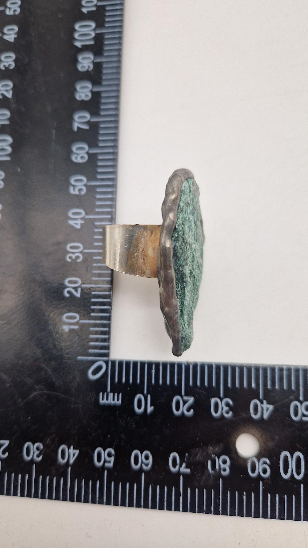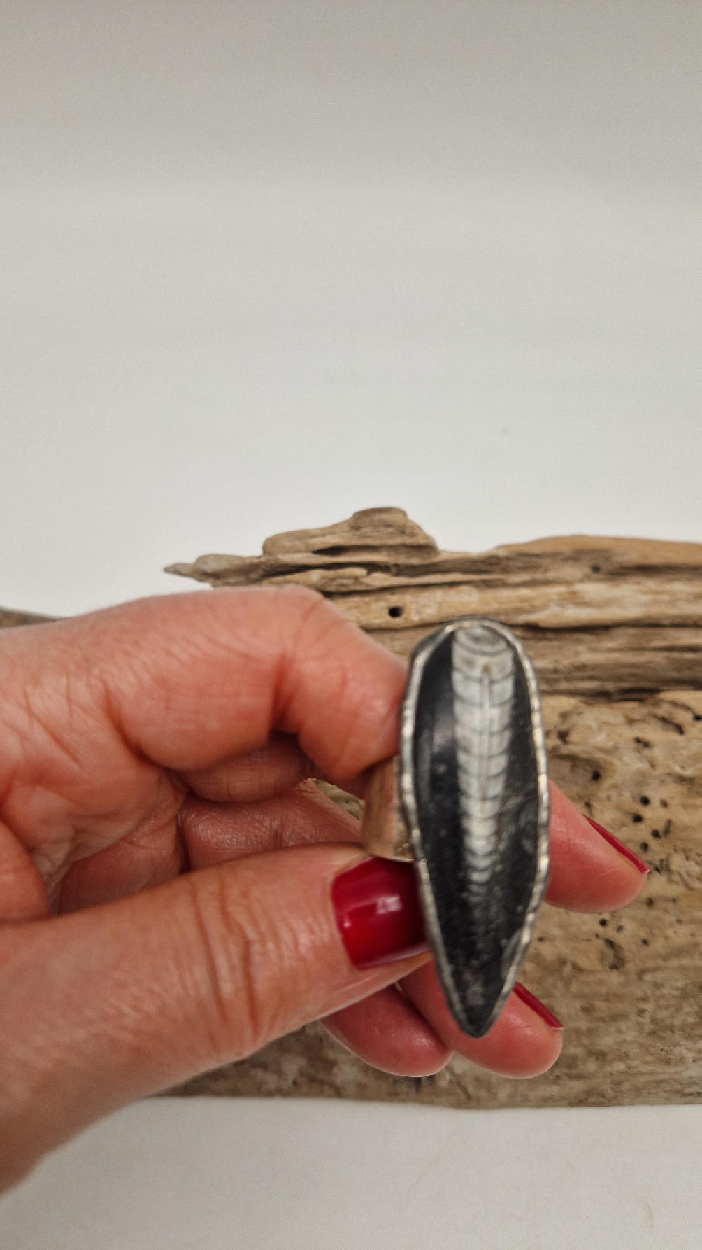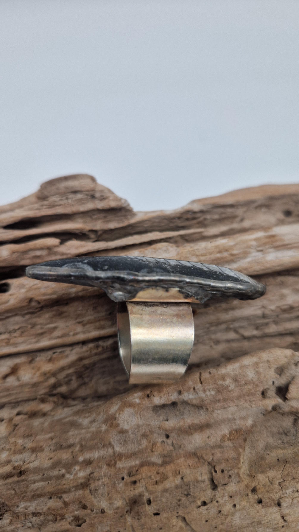 Niezwykle piękny, duży, podłużny pierścionek, którego oczkiem jest piękny  ortoceras,  skamieniały prehistoryczny stwór- ale bardzo ładny i elegancki…oprawiony w kutą i patynowaną  i srebrzoną miedź. Piękna metaloplastyka z pięknym kamieniem . Pierścionek ma regulowaną obrączkę, więc pasuje na każdy palec…ale możesz powiesić go na łańcuszku lub rzemieniu, jeśli nie lubisz pierścionków, a podoba Ci się forma i kamień…