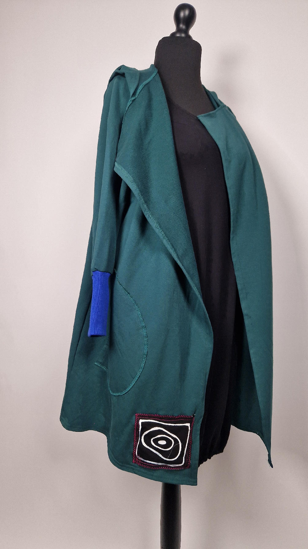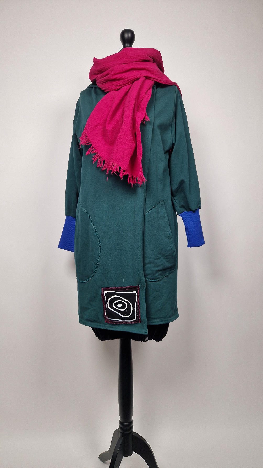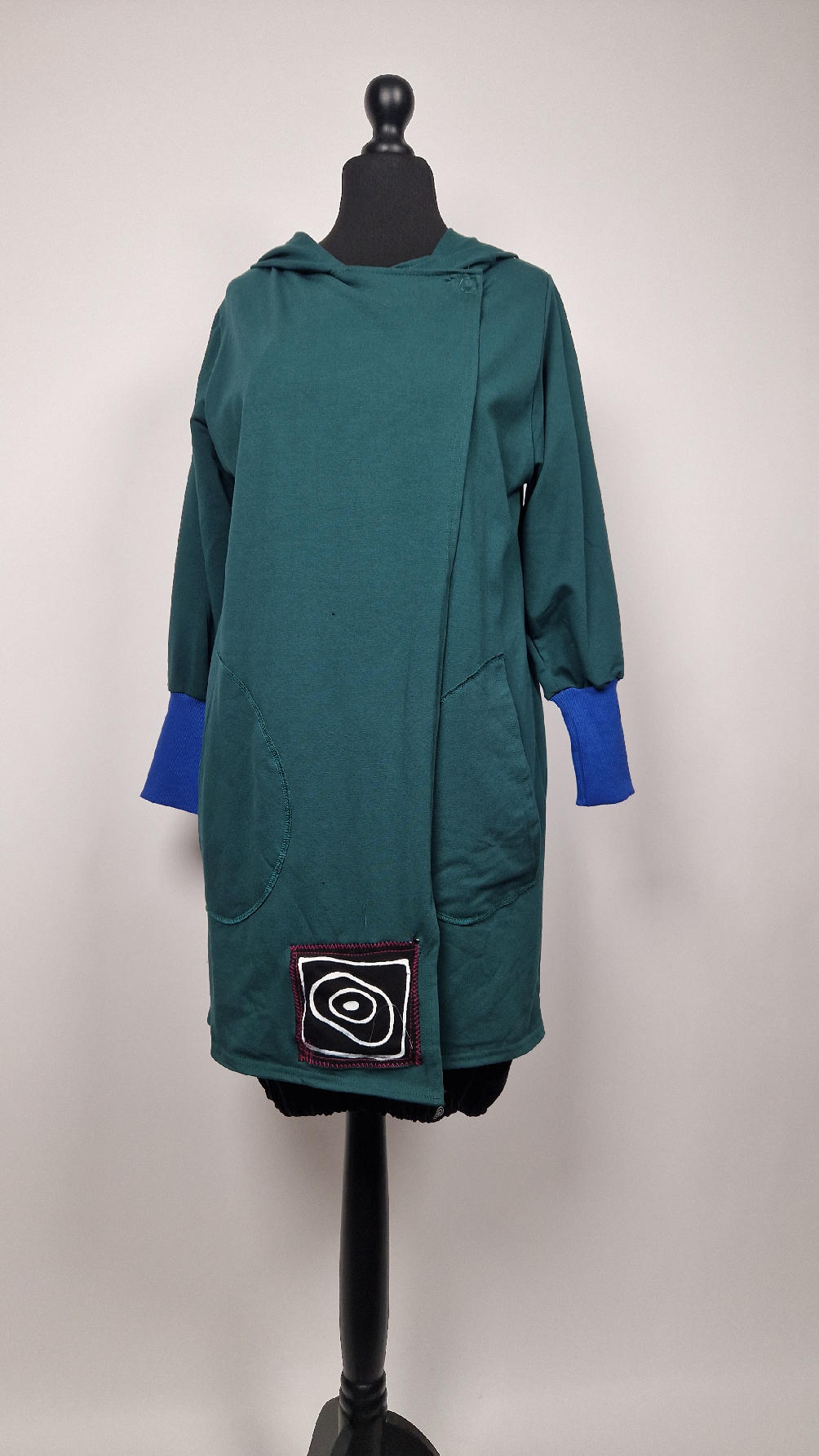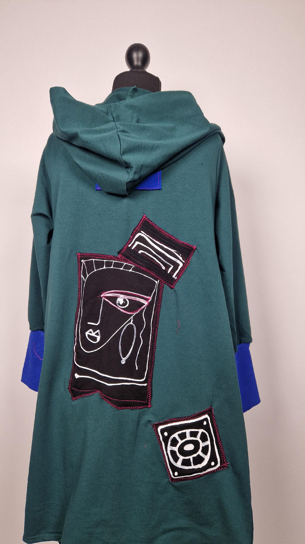 Otulak, czyli super bluzo-płaszcz idealny na wszystkie podróże, obłędnie zgrabny, wygodny, wszystko zakrywający COŚ , który pokochasz od pierwszego założenia. Ten Otulak uszyty jest z mięciutkiej , ,,drapanej,, ciemnozielonej bawełny, ma kontrastowe, kobaltowe mankiety, jest wygodny, oryginalny, niebanalny i malowany oczywiście ręcznie!