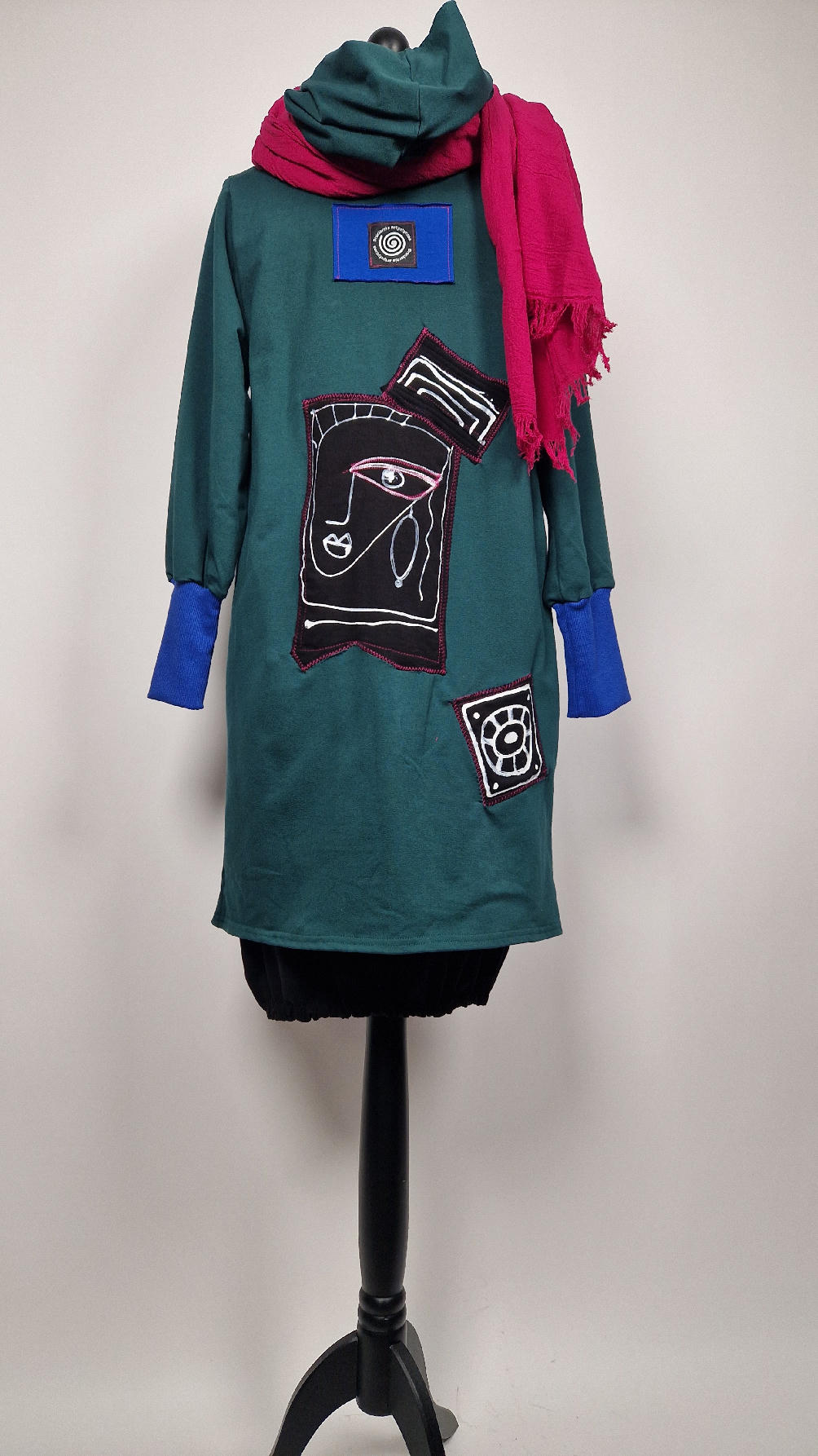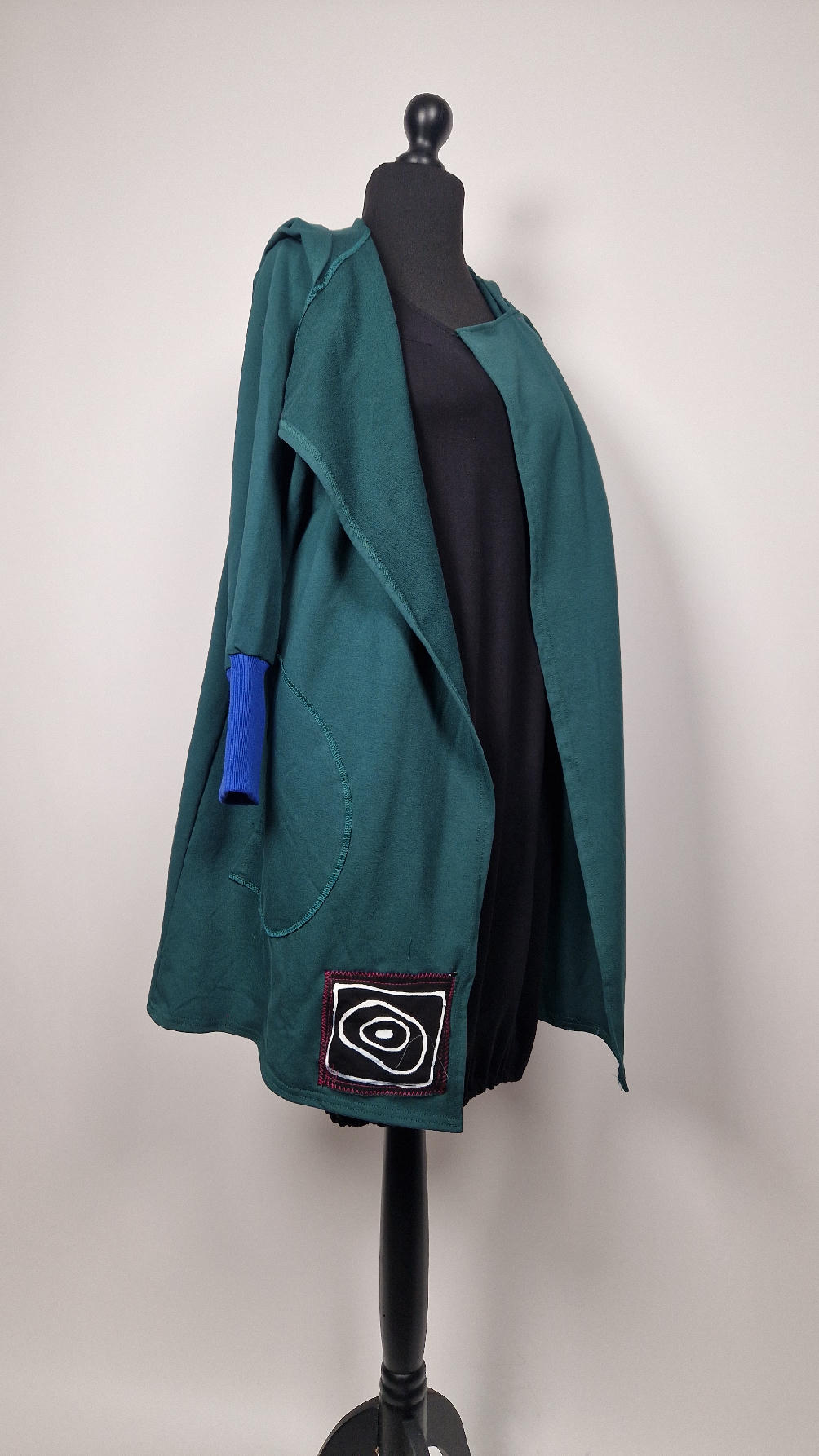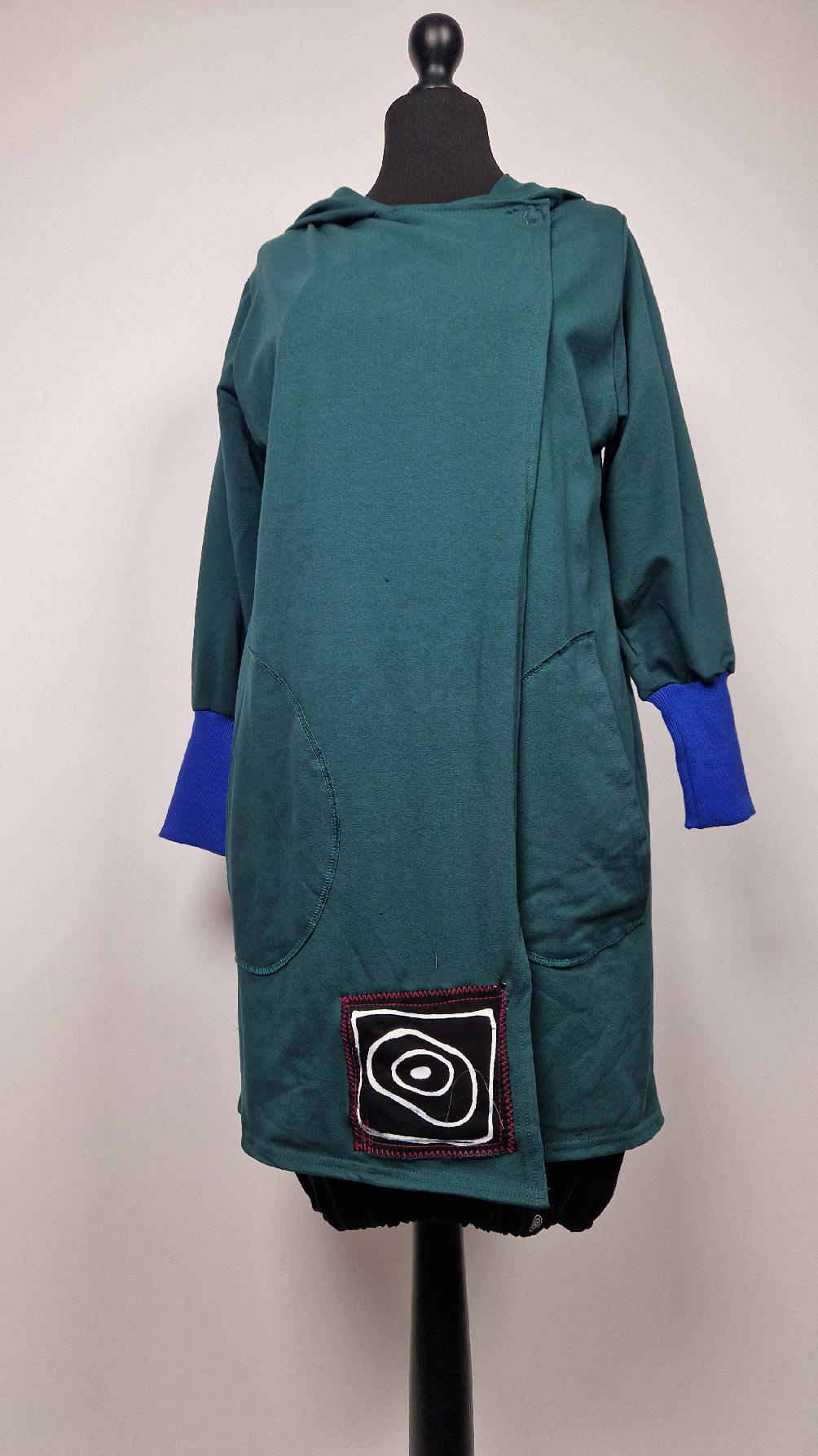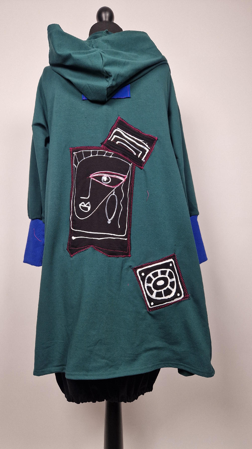 Otulak, czyli super bluzo-płaszcz idealny na wszystkie podróże, obłędnie zgrabny, wygodny, wszystko zakrywający COŚ , który pokochasz od pierwszego założenia. Ten Otulak uszyty jest z mięciutkiej , ,,drapanej,, ciemnozielonej bawełny, ma kontrastowe, kobaltowe mankiety, jest wygodny, oryginalny, niebanalny i malowany oczywiście ręcznie!