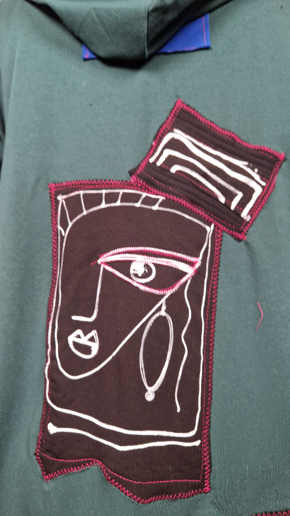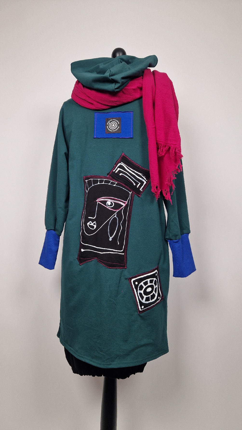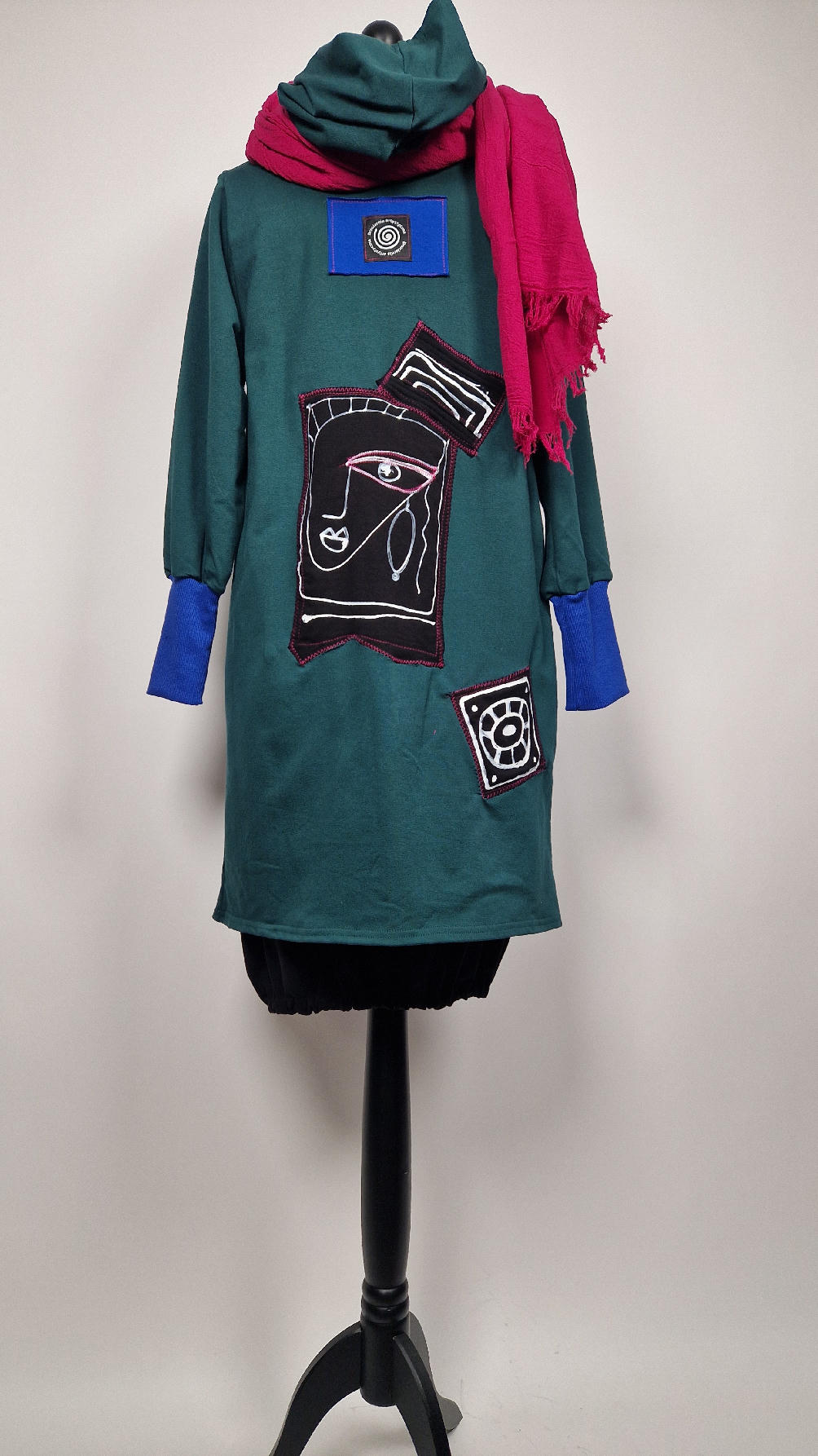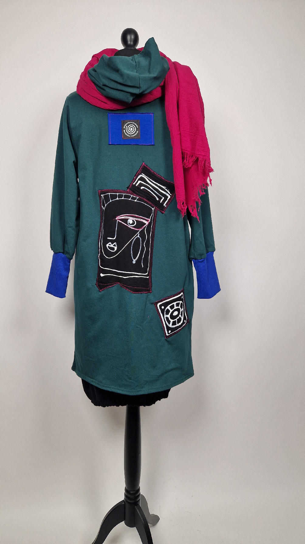 Otulak, czyli super bluzo-płaszcz idealny na wszystkie podróże, obłędnie zgrabny, wygodny, wszystko zakrywający COŚ , który pokochasz od pierwszego założenia. Ten Otulak uszyty jest z mięciutkiej , ,,drapanej,, ciemnozielonej bawełny, ma kontrastowe, kobaltowe mankiety, jest wygodny, oryginalny, niebanalny i malowany oczywiście ręcznie!