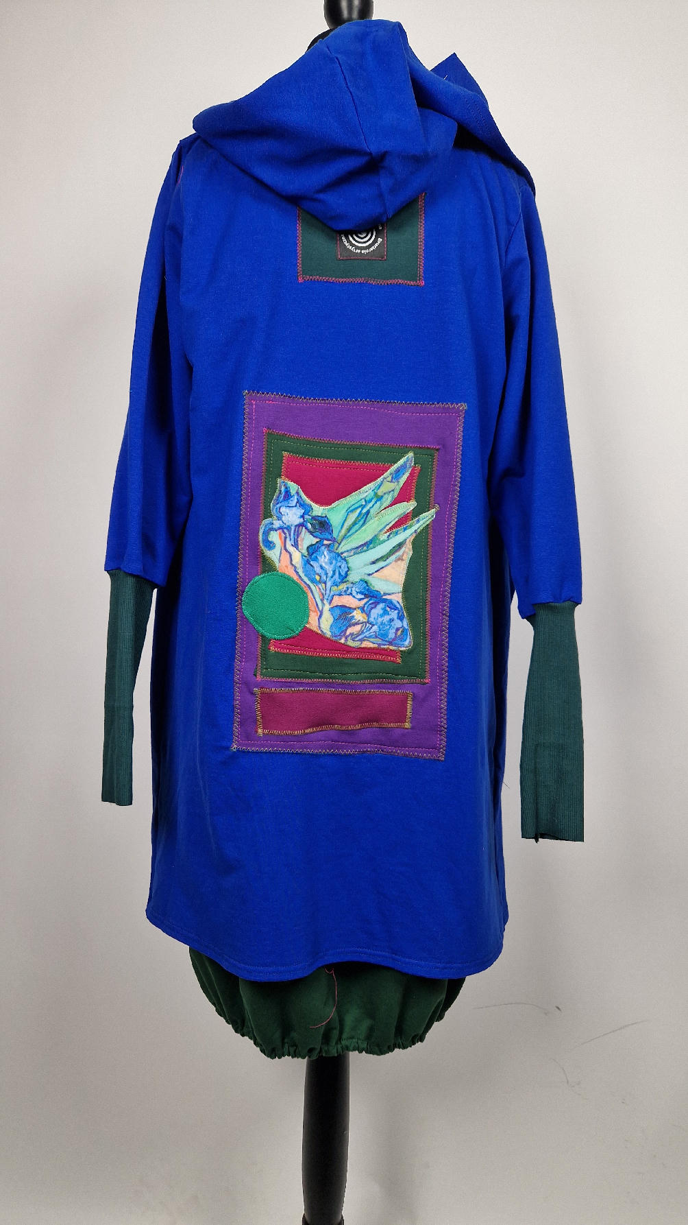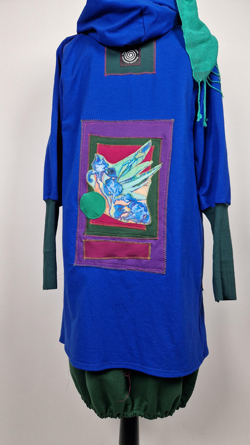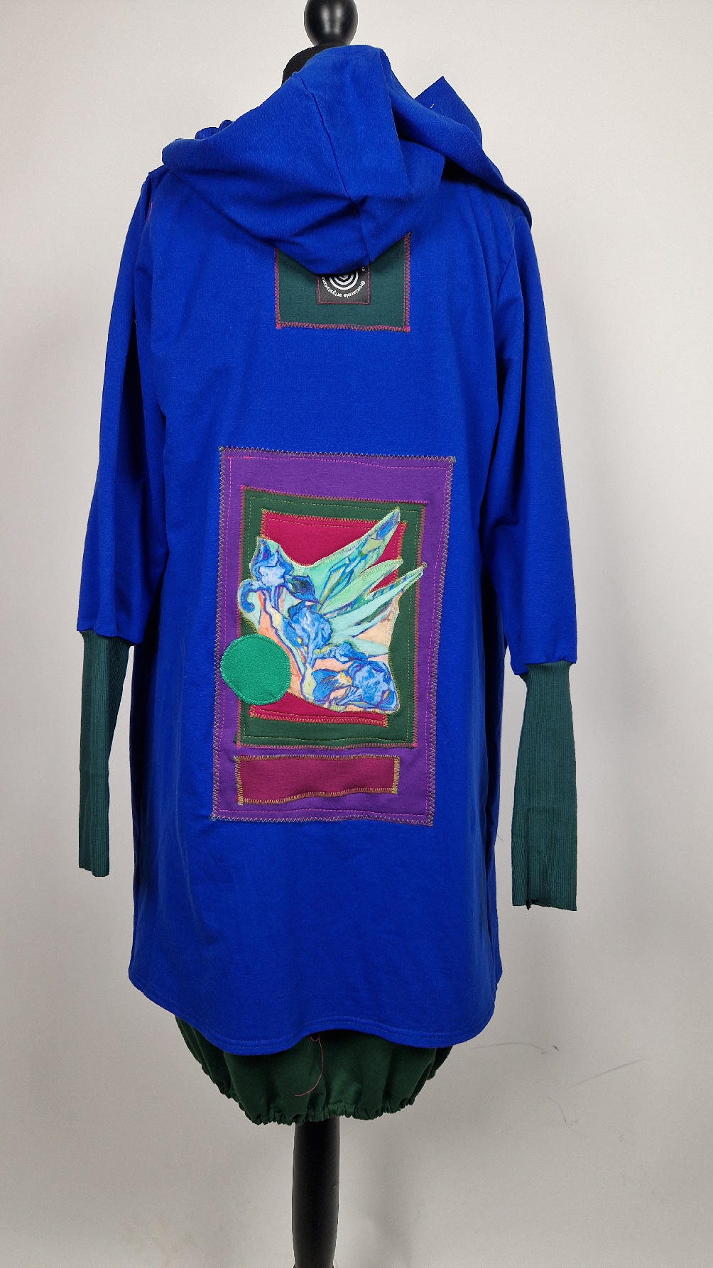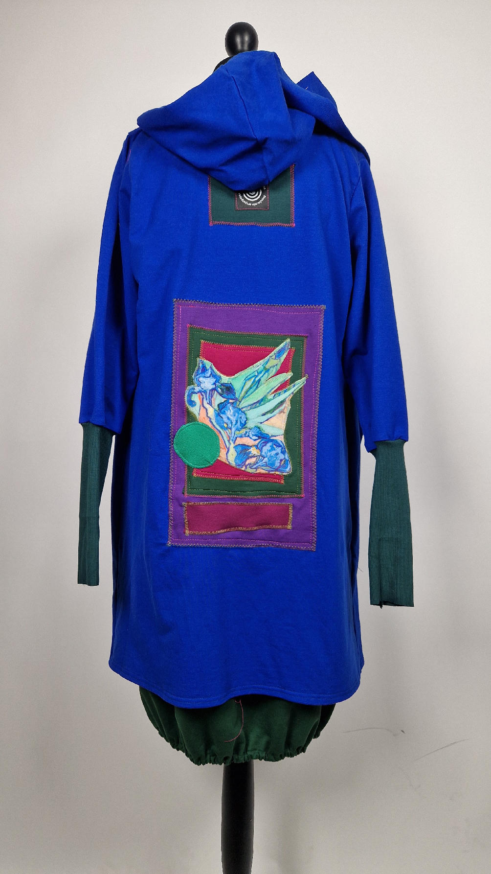 Ten OTULAK ma super obłędny kolor…chabrowy, kobaltowy, electric blu…? Cudny! Uszyty jest z bawełny z pętelka, czyli jest ciut cieńszy niż Luis….ma kontrastowe zielone, długie mankiety i piękną aplikację na plecach- irysy Van Gogha , w otoczeniu pasujących kolorów, oczywiście duże kieszenie na łapki, duży kaptur, jeden duży zatrzask do zapięcia…Otulak, czyli super bluzo-płaszcz idealny na wszystkie podróże, obłędnie zgrabny, wygodny, wszystko zakrywający COŚ , który pokochasz od pierwszego założenia.