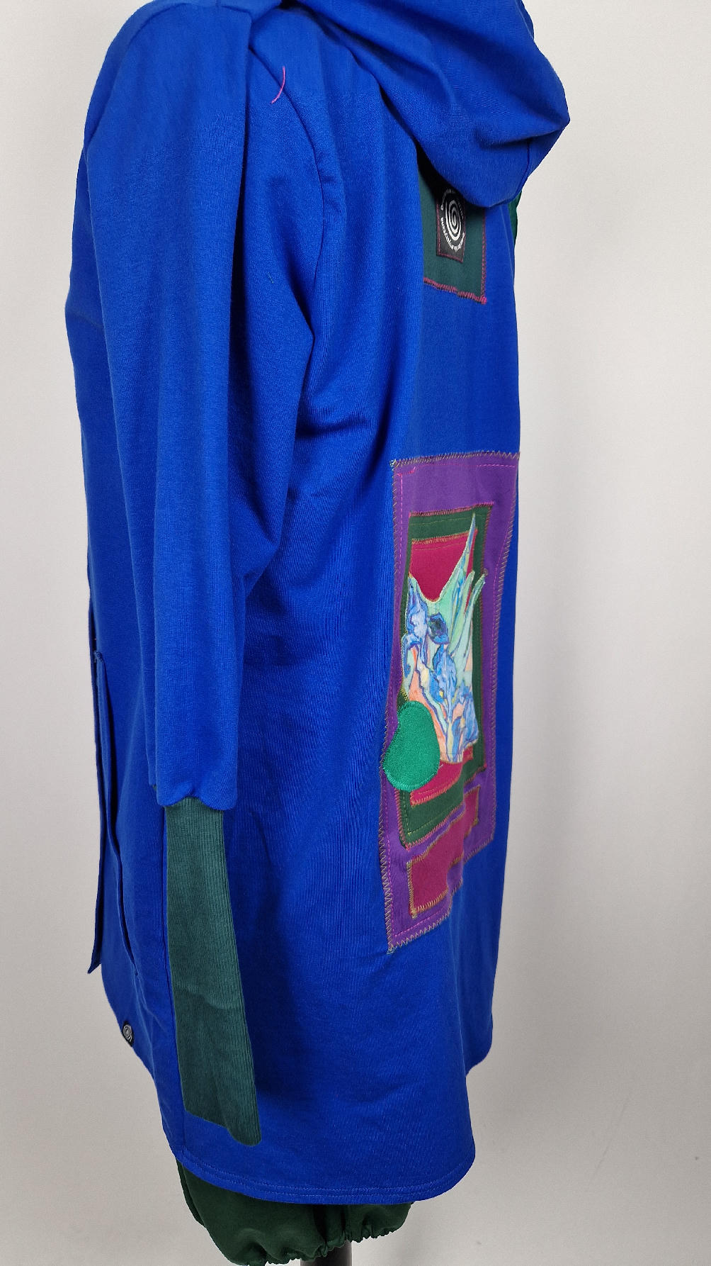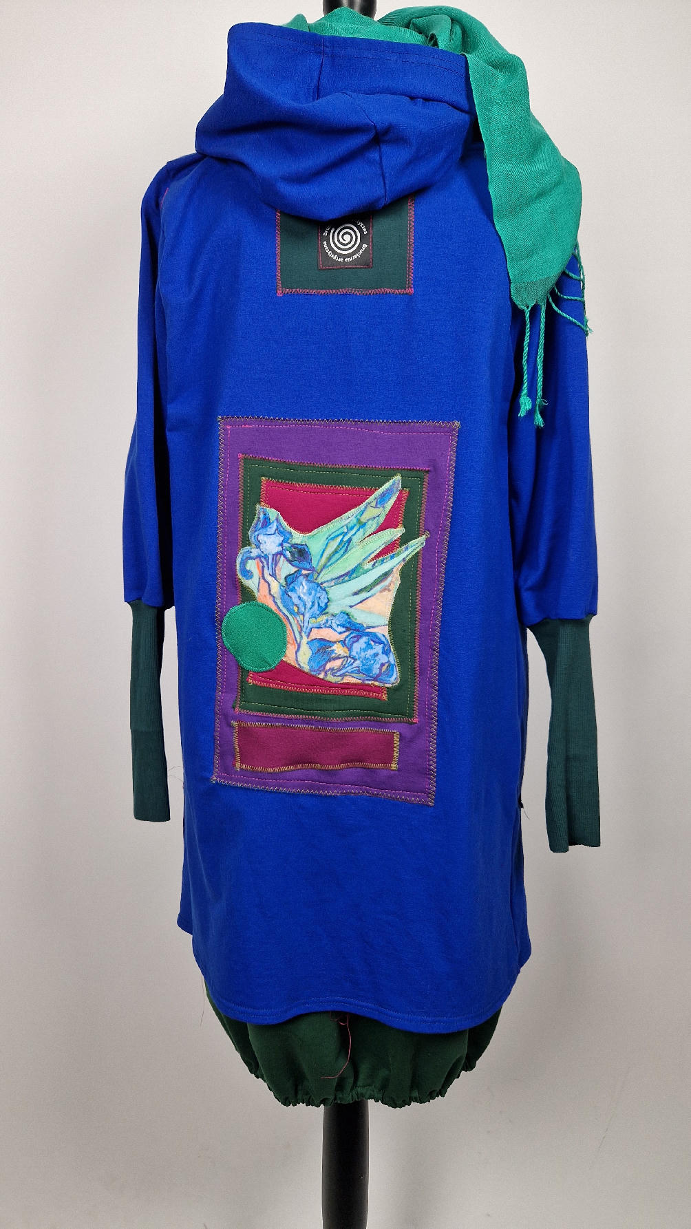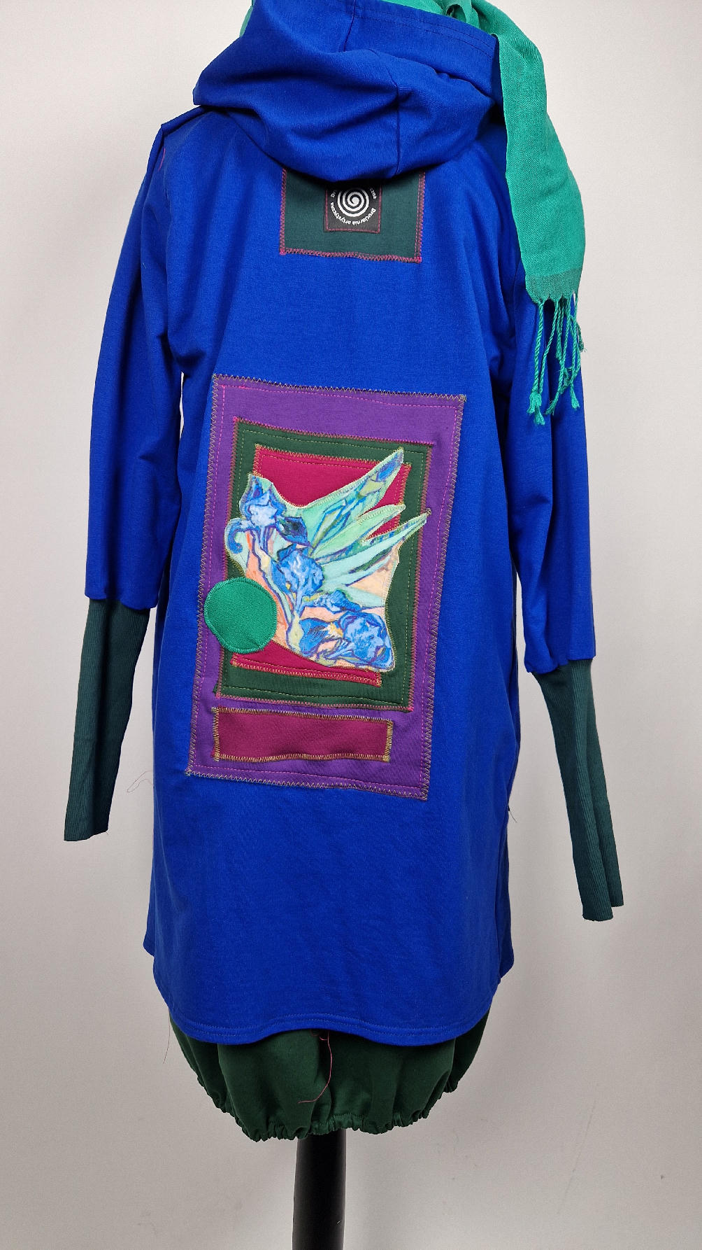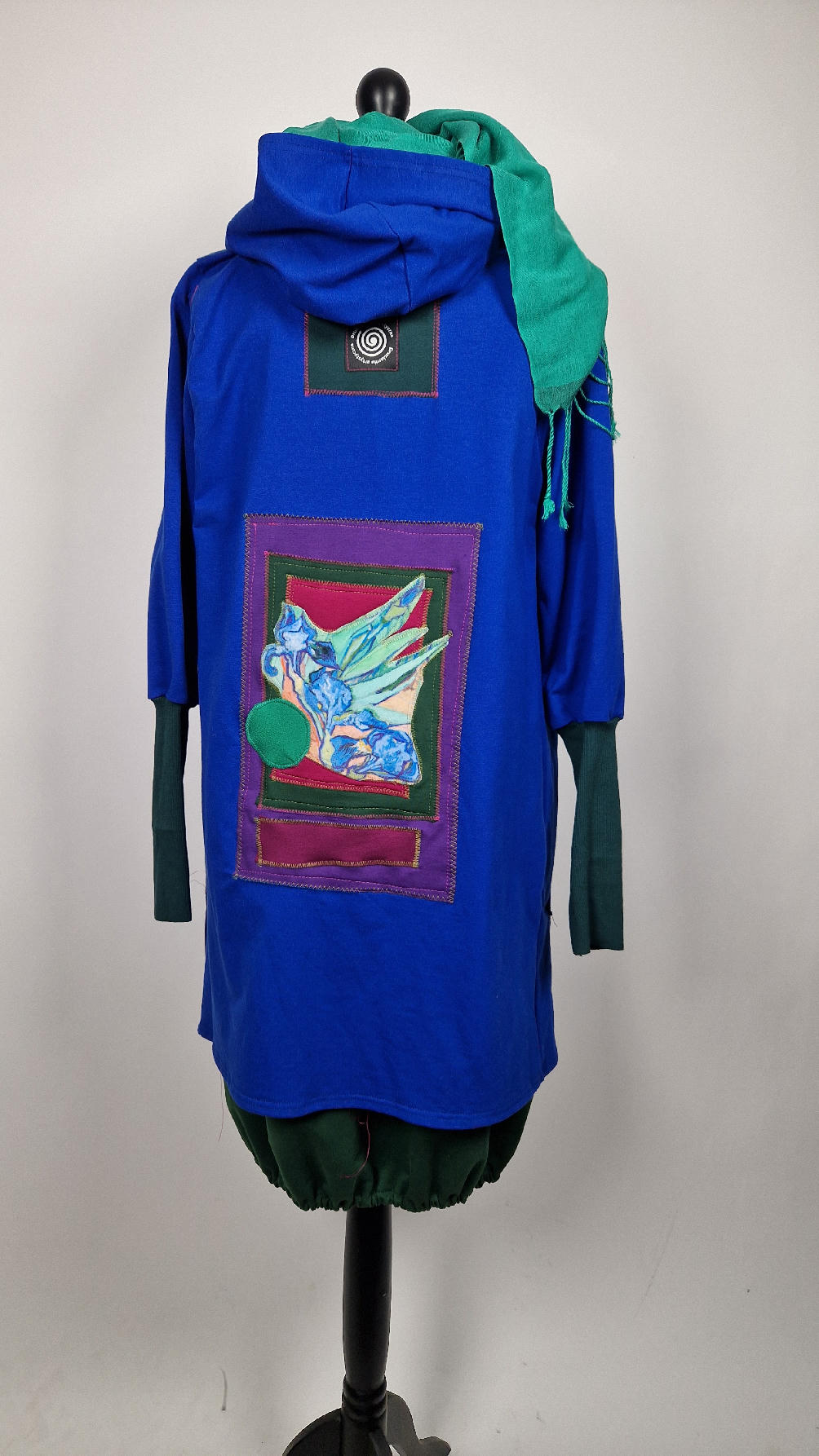 Ten OTULAK ma super obłędny kolor…chabrowy, kobaltowy, electric blu…? Cudny! Uszyty jest z bawełny z pętelka, czyli jest ciut cieńszy niż Luis….ma kontrastowe zielone, długie mankiety i piękną aplikację na plecach- irysy Van Gogha , w otoczeniu pasujących kolorów, oczywiście duże kieszenie na łapki, duży kaptur, jeden duży zatrzask do zapięcia…Otulak, czyli super bluzo-płaszcz idealny na wszystkie podróże, obłędnie zgrabny, wygodny, wszystko zakrywający COŚ , który pokochasz od pierwszego założenia.