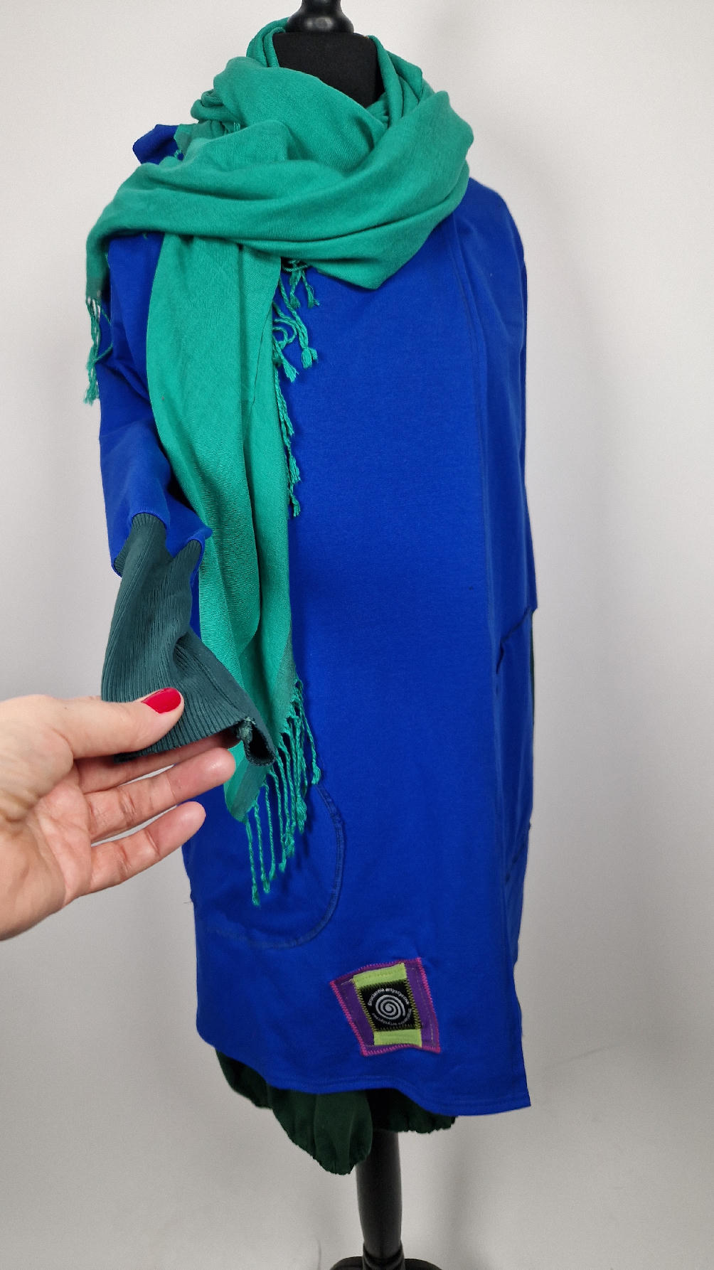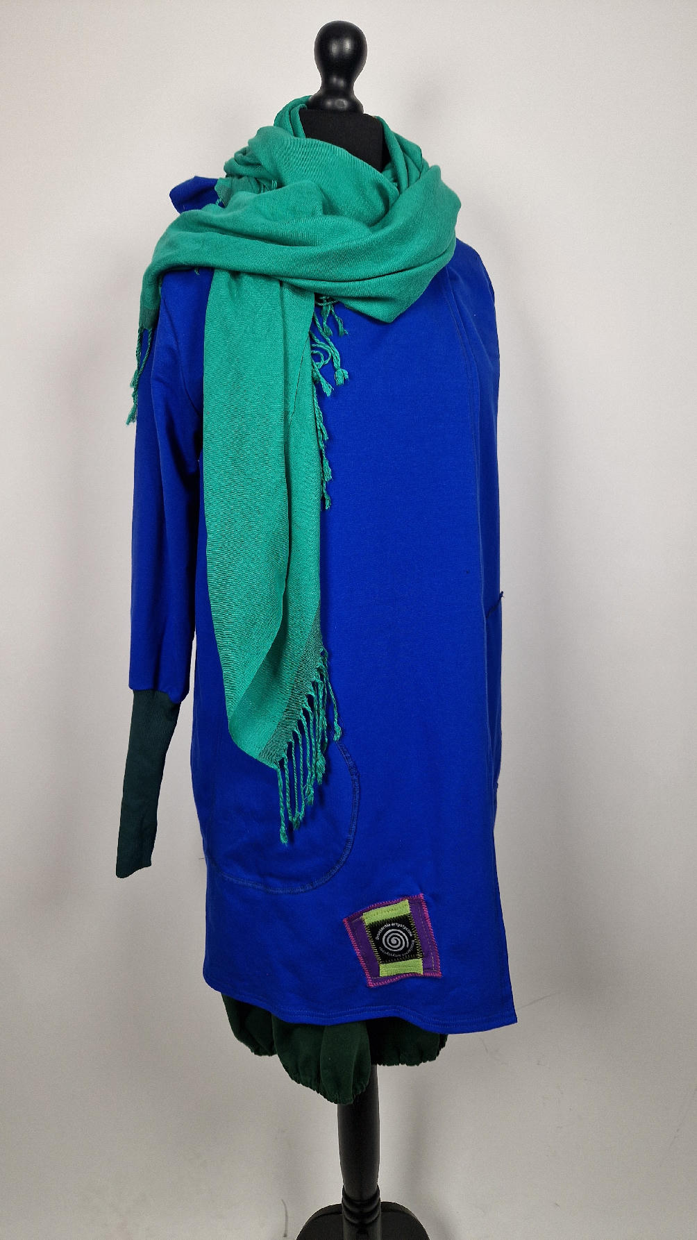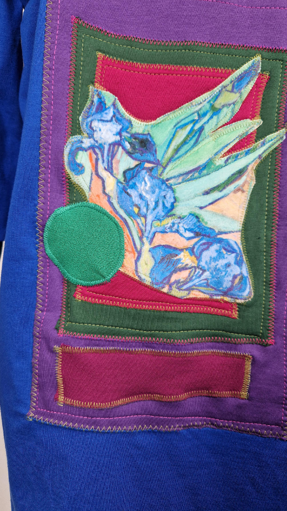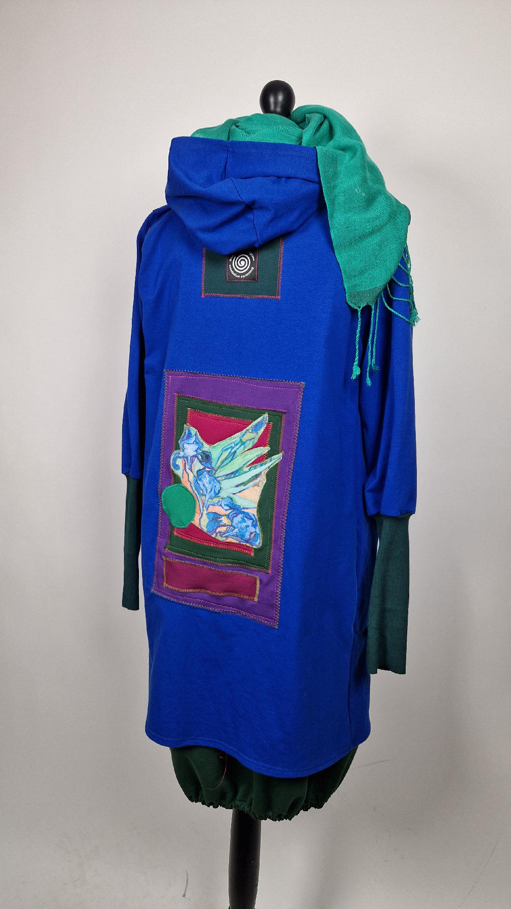 Ten OTULAK ma super obłędny kolor…chabrowy, kobaltowy, electric blu…? Cudny! Uszyty jest z bawełny z pętelka, czyli jest ciut cieńszy niż Luis….ma kontrastowe zielone, długie mankiety i piękną aplikację na plecach- irysy Van Gogha , w otoczeniu pasujących kolorów, oczywiście duże kieszenie na łapki, duży kaptur, jeden duży zatrzask do zapięcia…Otulak, czyli super bluzo-płaszcz idealny na wszystkie podróże, obłędnie zgrabny, wygodny, wszystko zakrywający COŚ , który pokochasz od pierwszego założenia.