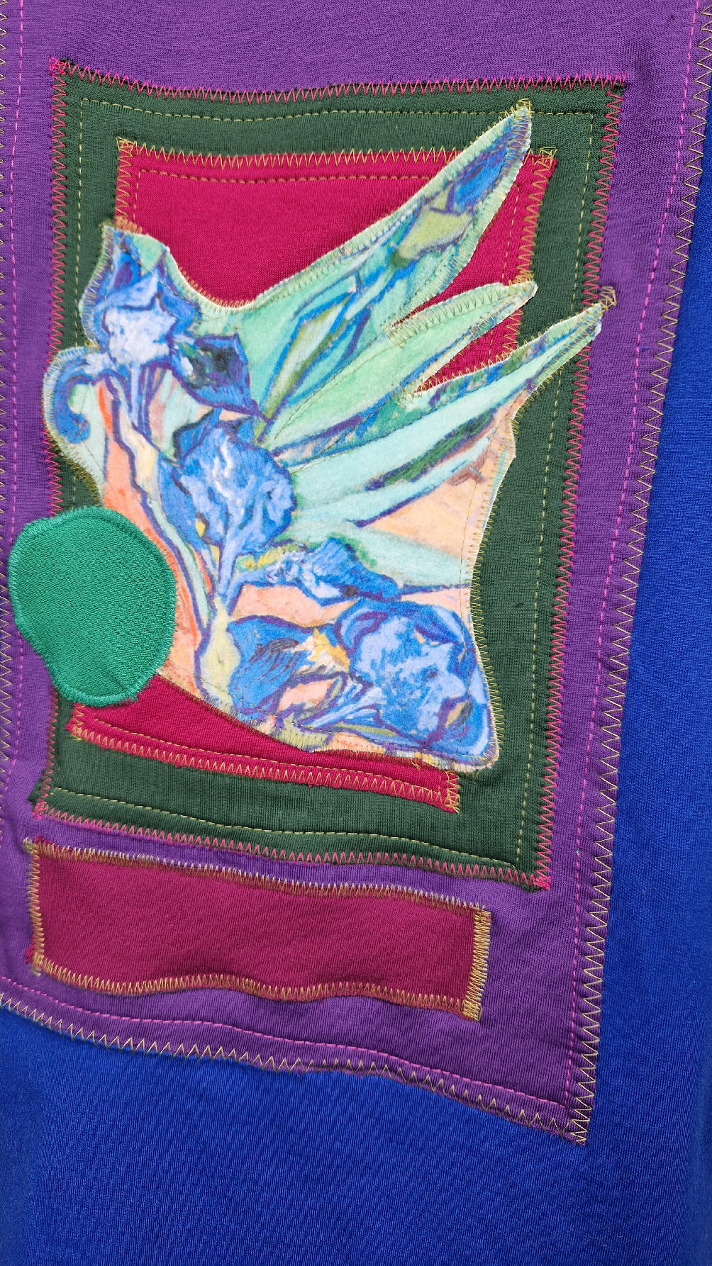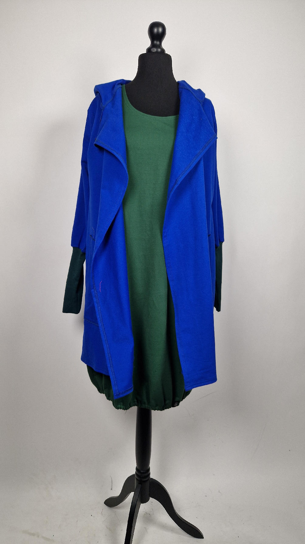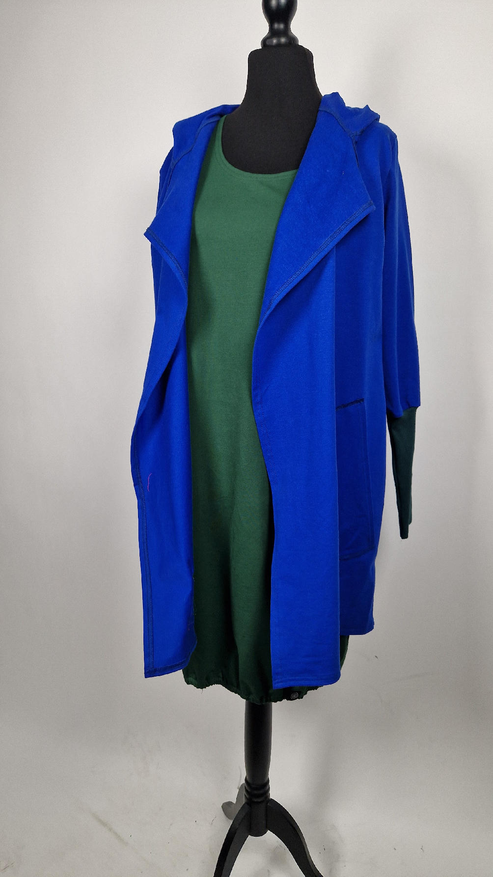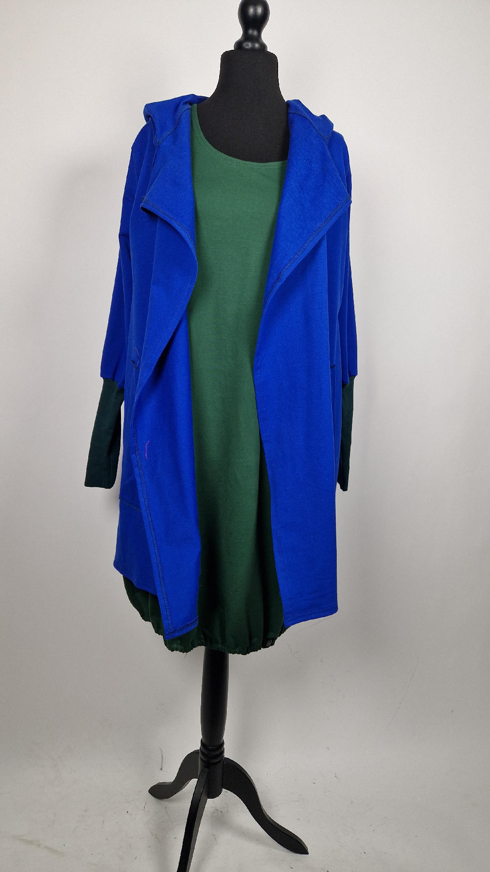 Ten OTULAK ma super obłędny kolor…chabrowy, kobaltowy, electric blu…? Cudny! Uszyty jest z bawełny z pętelka, czyli jest ciut cieńszy niż Luis….ma kontrastowe zielone, długie mankiety i piękną aplikację na plecach- irysy Van Gogha , w otoczeniu pasujących kolorów, oczywiście duże kieszenie na łapki, duży kaptur, jeden duży zatrzask do zapięcia…Otulak, czyli super bluzo-płaszcz idealny na wszystkie podróże, obłędnie zgrabny, wygodny, wszystko zakrywający COŚ , który pokochasz od pierwszego założenia.