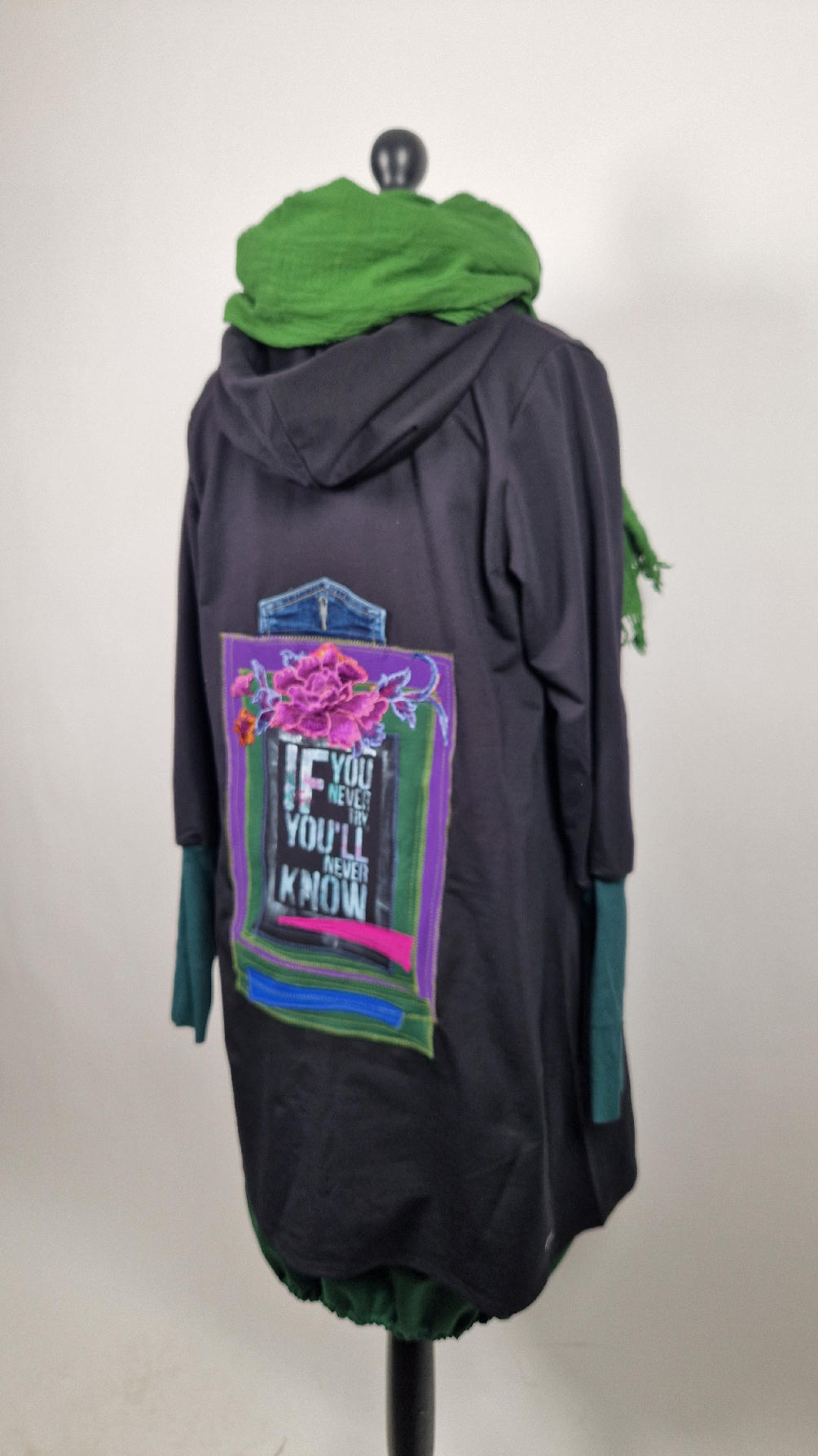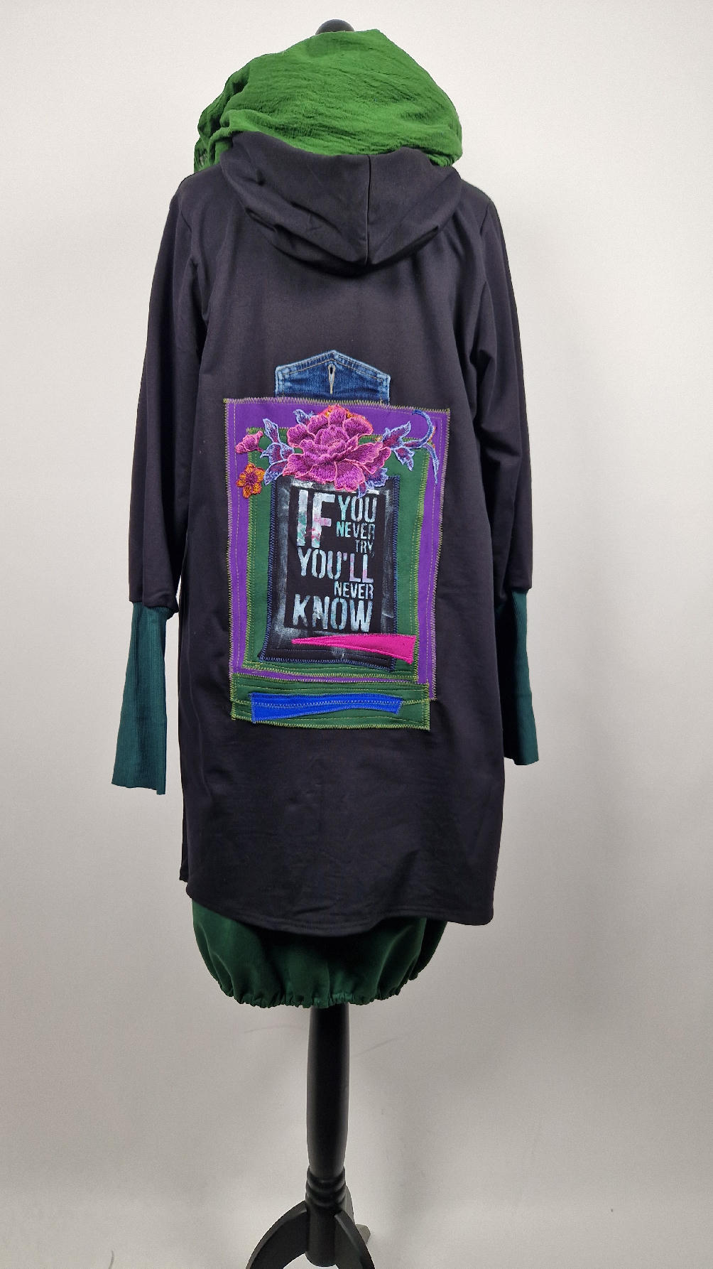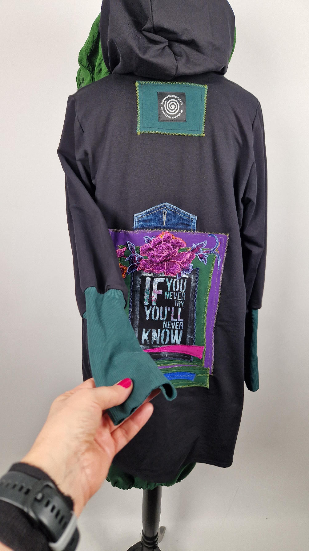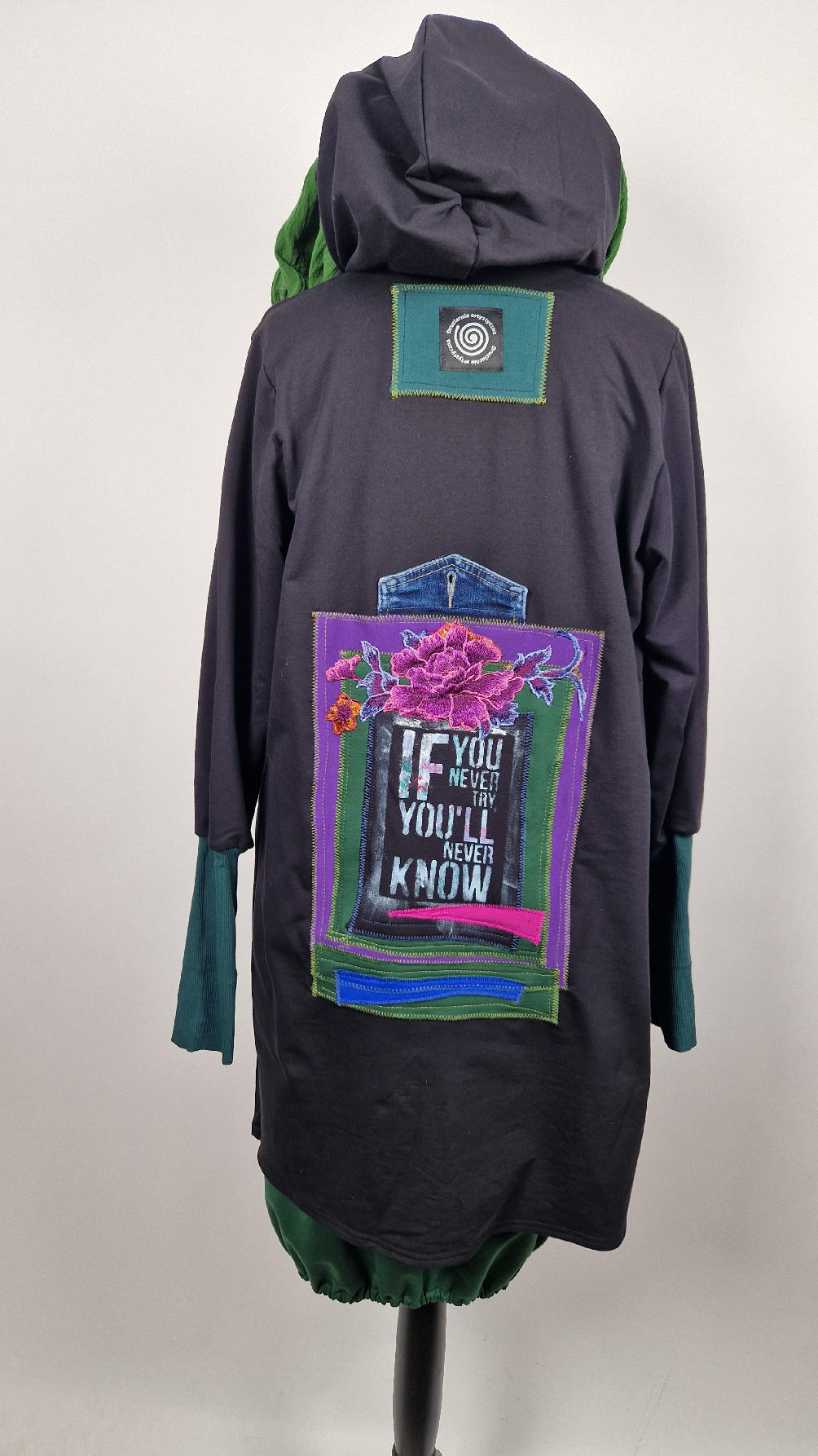Czarny, ale przecież megakolorowy, radosny i śliczny! Uszyty jest z bawełny z pętelka, czyli jest ciut cieńszy niż Luis….ma kontrastowe zielone, długie mankiety i piękną aplikację na plecach , fajowa sentencja, która może rozświetlić dzień i kwiaty w otoczeniu pasujących, energetycznych kolorów, oczywiście duże kieszenie na łapki, duży kaptur, jeden duży zatrzask do zapięcia…Otulak, czyli super bluzo-płaszcz idealny na wszystkie podróże, obłędnie zgrabny, wygodny, wszystko zakrywający COŚ , który pokochasz od pierwszego założenia.