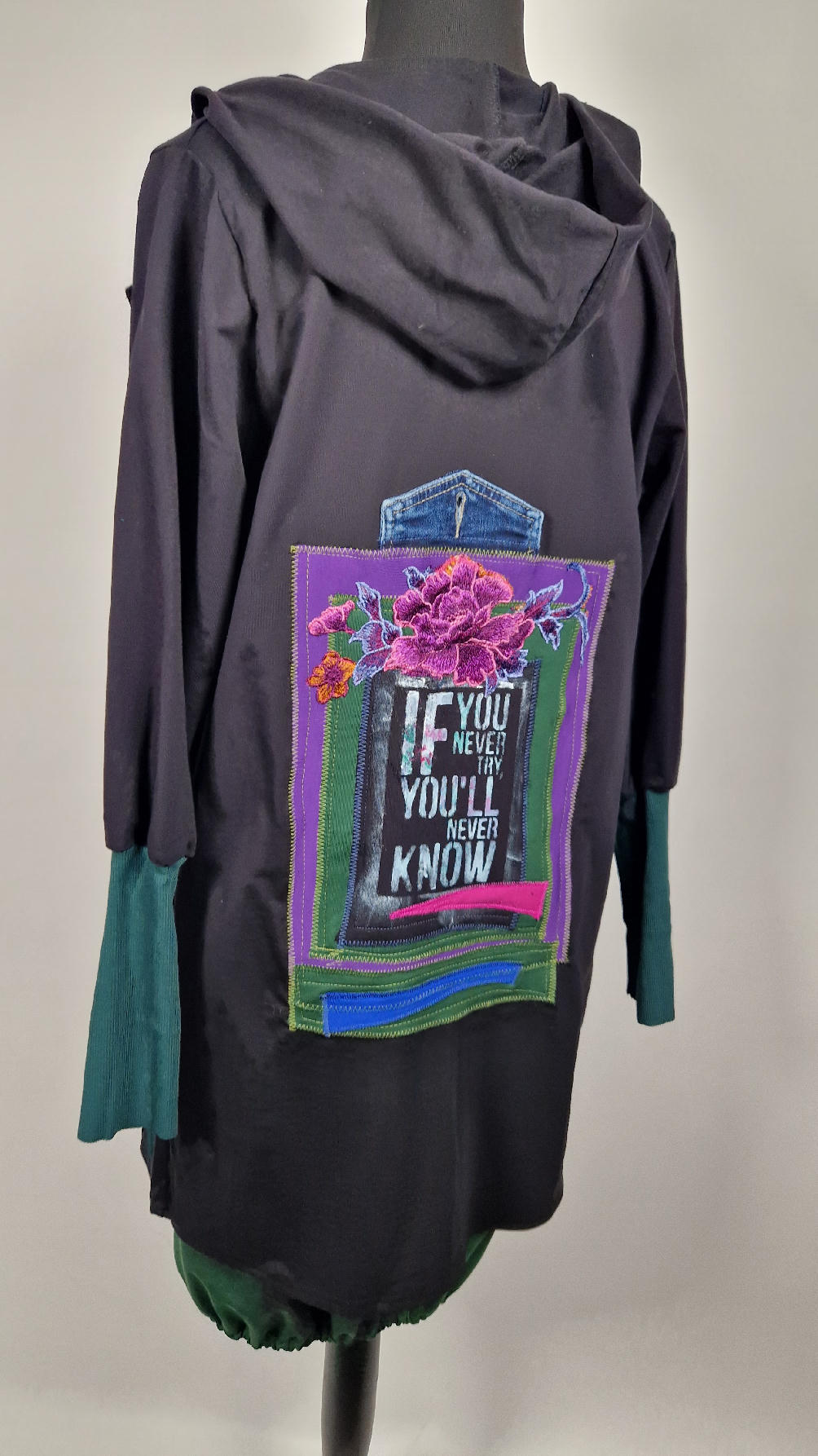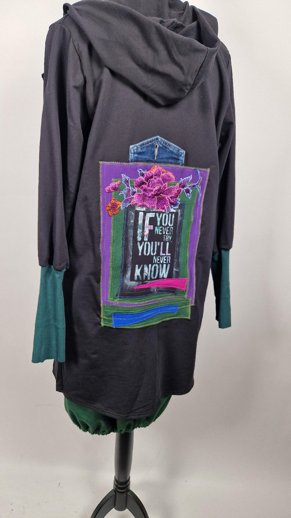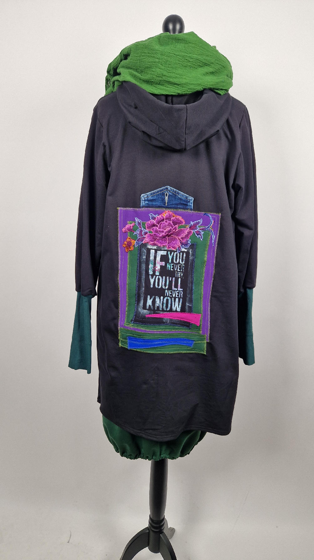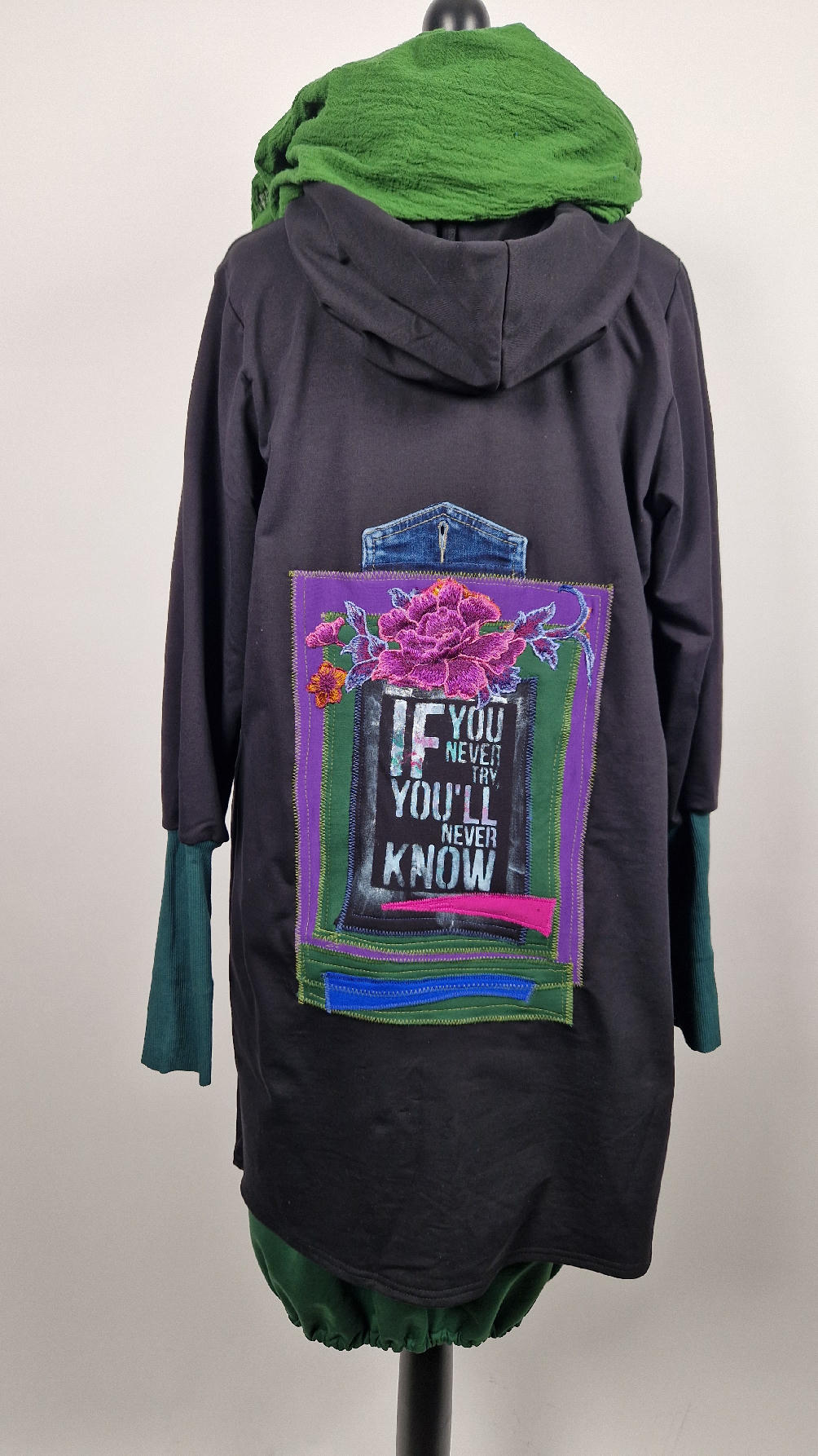 Czarny, ale przecież megakolorowy, radosny i śliczny! Uszyty jest z bawełny z pętelka, czyli jest ciut cieńszy niż Luis….ma kontrastowe zielone, długie mankiety i piękną aplikację na plecach , fajowa sentencja, która może rozświetlić dzień i kwiaty w otoczeniu pasujących, energetycznych kolorów, oczywiście duże kieszenie na łapki, duży kaptur, jeden duży zatrzask do zapięcia…Otulak, czyli super bluzo-płaszcz idealny na wszystkie podróże, obłędnie zgrabny, wygodny, wszystko zakrywający COŚ , który pokochasz od pierwszego założenia.