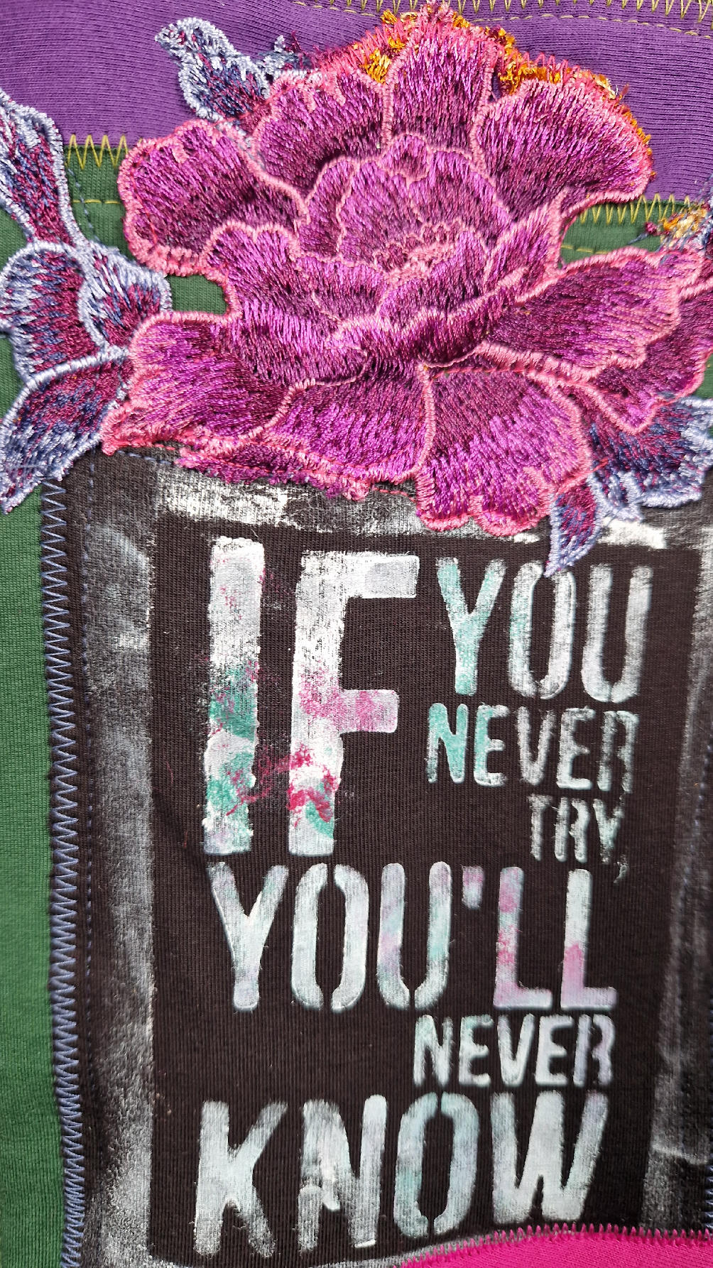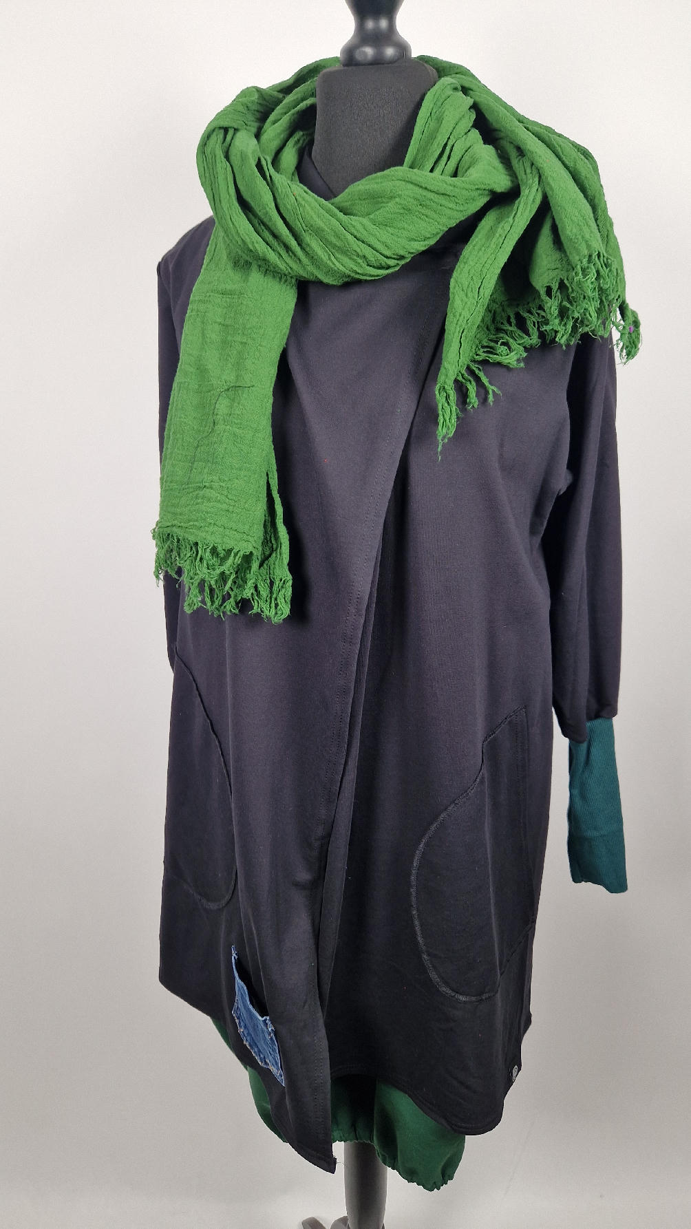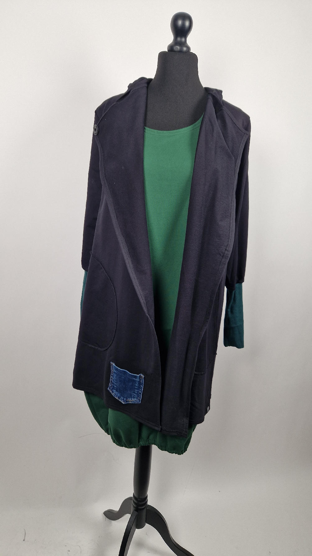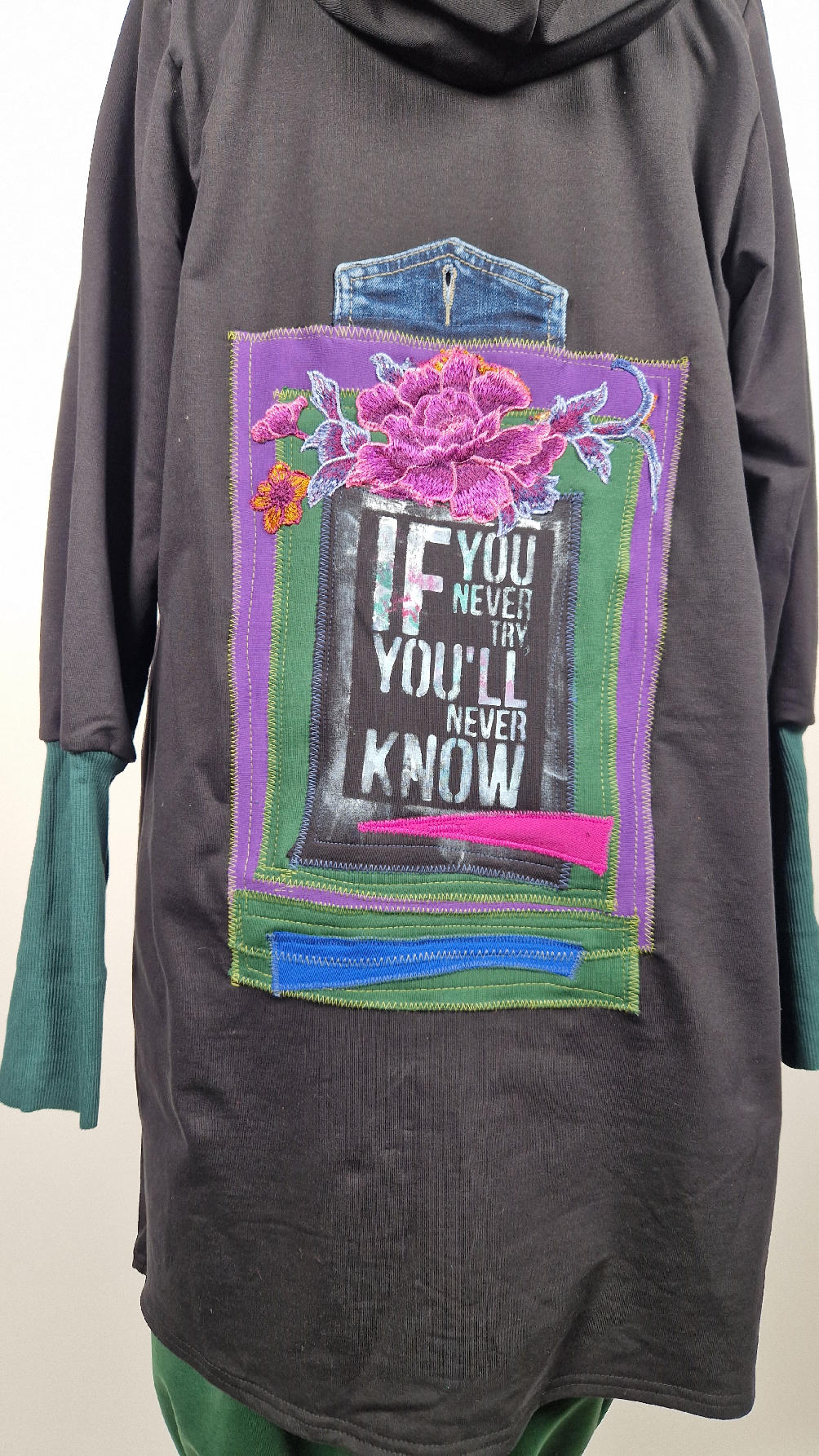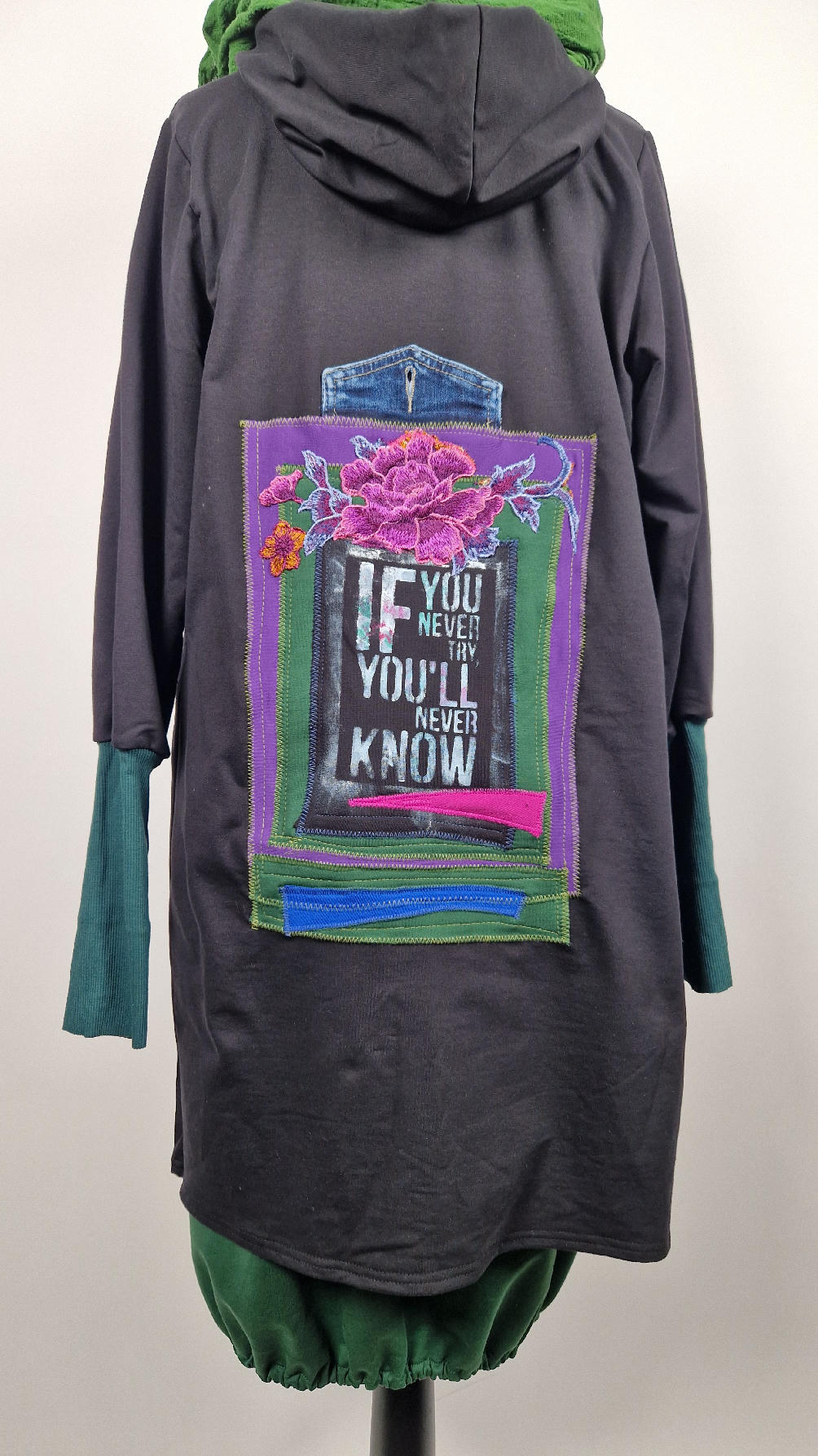 Czarny, ale przecież megakolorowy, radosny i śliczny! Uszyty jest z bawełny z pętelka, czyli jest ciut cieńszy niż Luis….ma kontrastowe zielone, długie mankiety i piękną aplikację na plecach , fajowa sentencja, która może rozświetlić dzień i kwiaty w otoczeniu pasujących, energetycznych kolorów, oczywiście duże kieszenie na łapki, duży kaptur, jeden duży zatrzask do zapięcia…Otulak, czyli super bluzo-płaszcz idealny na wszystkie podróże, obłędnie zgrabny, wygodny, wszystko zakrywający COŚ , który pokochasz od pierwszego założenia.
