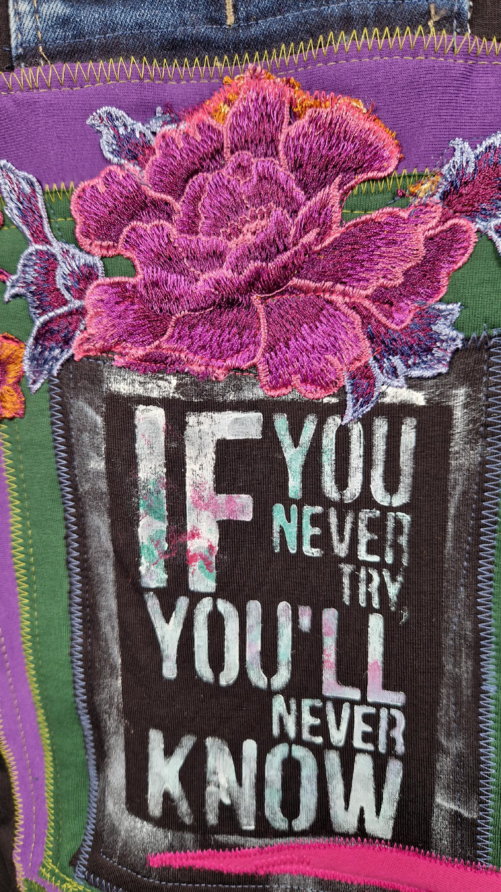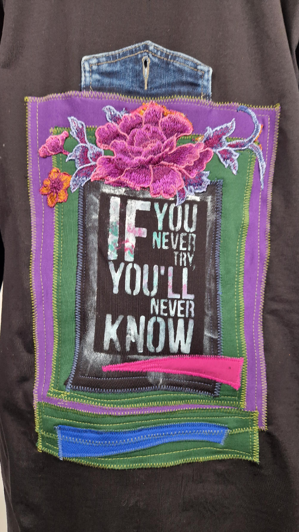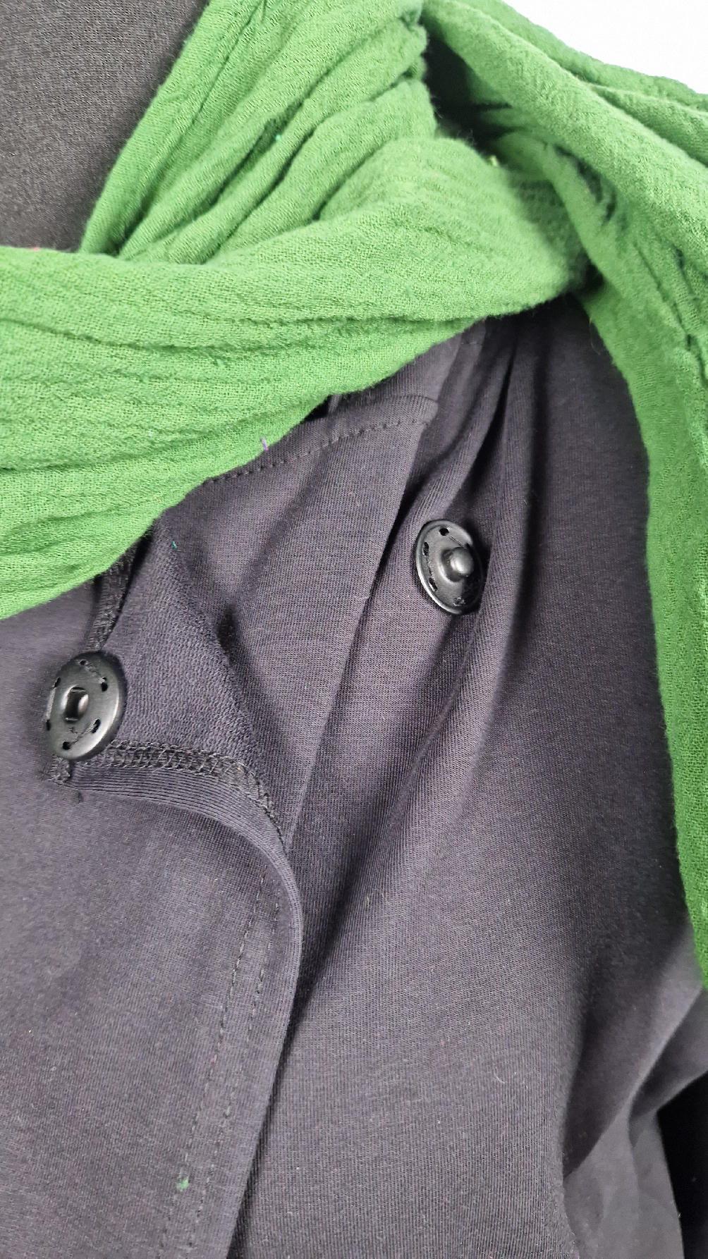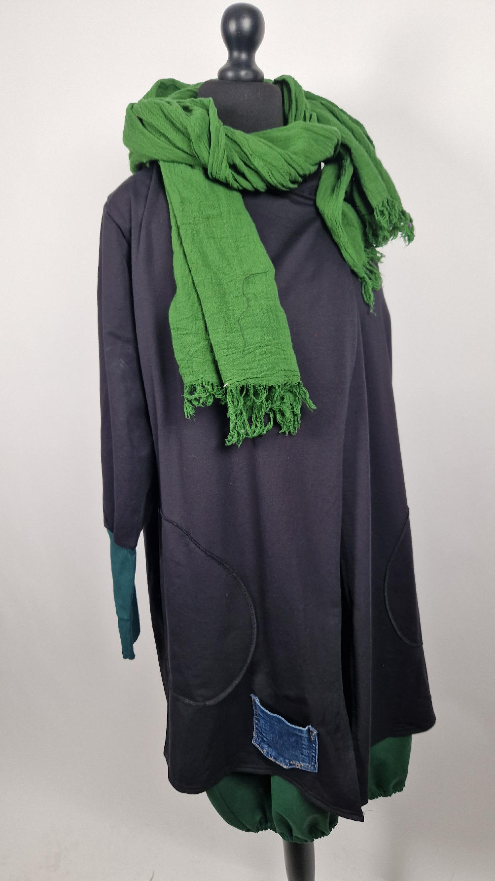 Czarny, ale przecież megakolorowy, radosny i śliczny! Uszyty jest z bawełny z pętelka, czyli jest ciut cieńszy niż Luis….ma kontrastowe zielone, długie mankiety i piękną aplikację na plecach , fajowa sentencja, która może rozświetlić dzień i kwiaty w otoczeniu pasujących, energetycznych kolorów, oczywiście duże kieszenie na łapki, duży kaptur, jeden duży zatrzask do zapięcia…Otulak, czyli super bluzo-płaszcz idealny na wszystkie podróże, obłędnie zgrabny, wygodny, wszystko zakrywający COŚ , który pokochasz od pierwszego założenia.