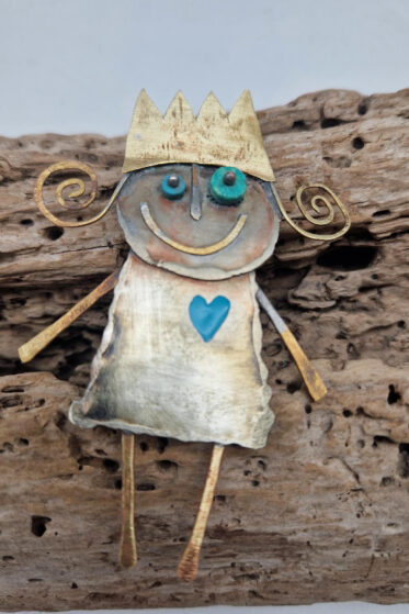 Cynowana, patynowana, malowana i lutowana ręcznie . Totalnie unikatowa, bo nawet jak ma siostrę, czy brata…. to i tak każda z nich jest inna.