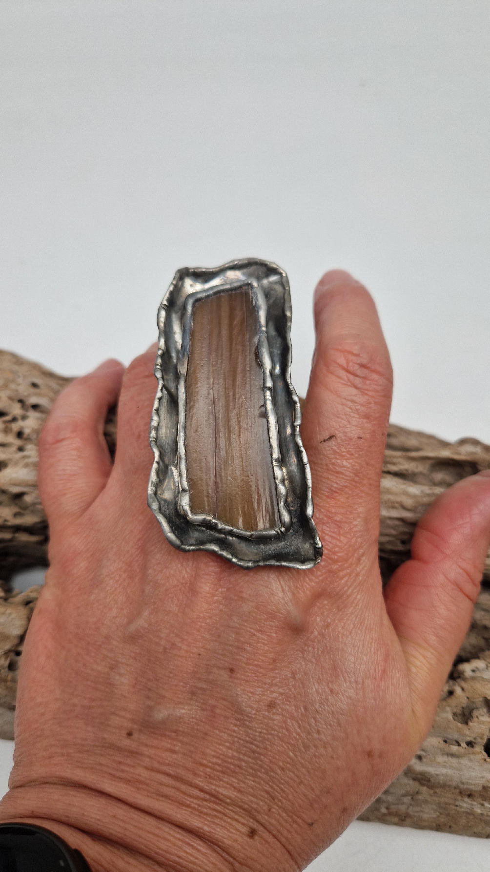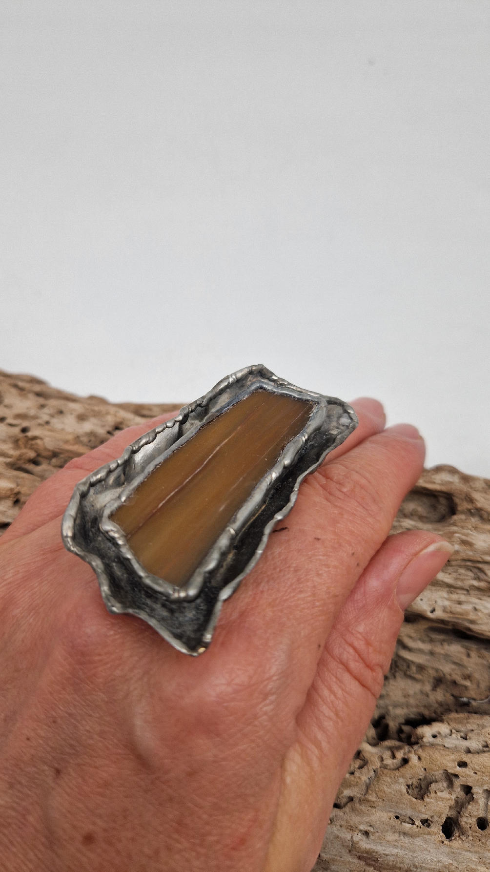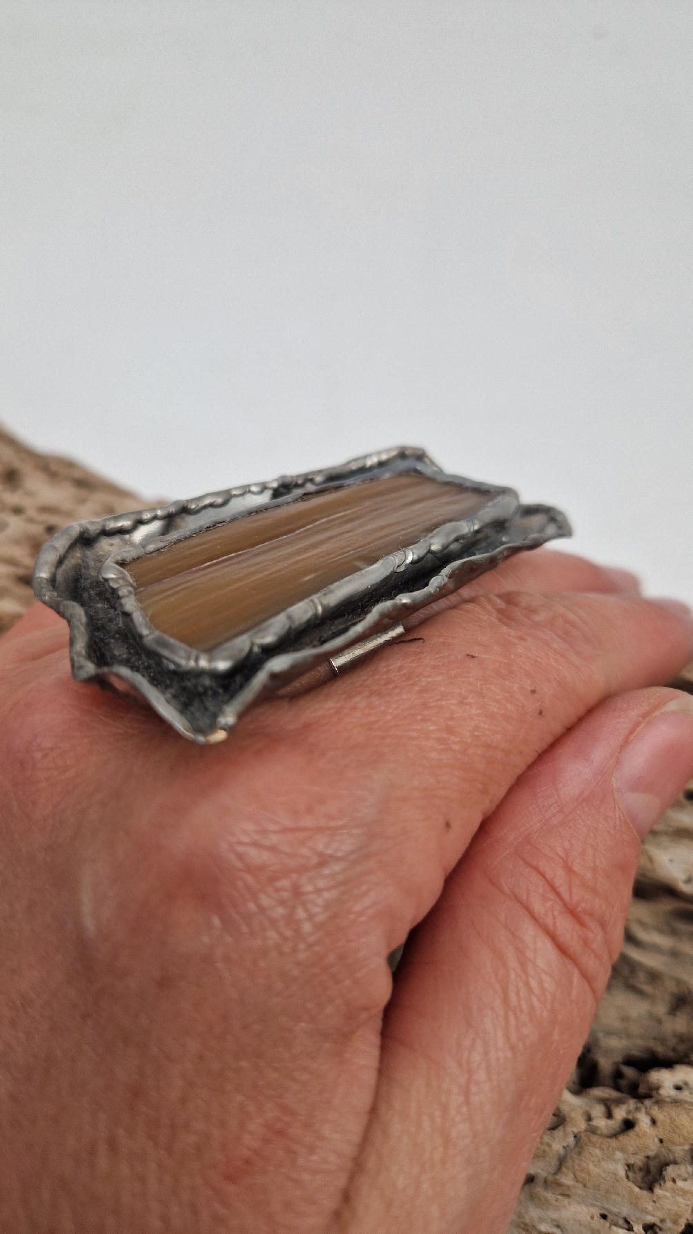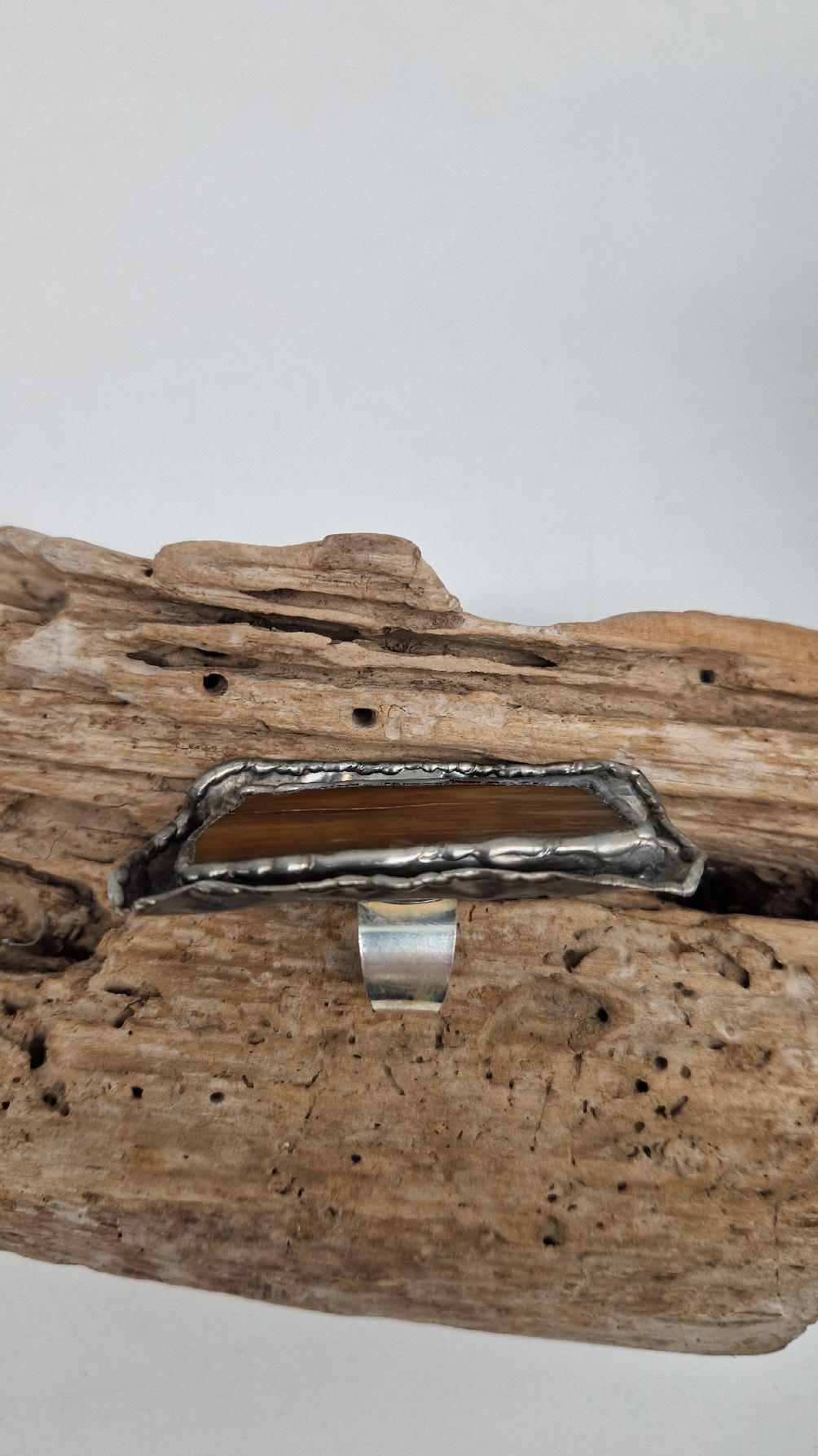 Niezwykle piękny, bardzo duży prostokątny pierścionek, którego oczkiem jest piękny, nieregularny i nieoszlifowany kawałek skamieniałego drewna z polskiego roztocza, z urozmaiconym przekrojem, w kolorze miodu i orzechów… oprawiony w kutą i patynowaną miedź. Piękna metaloplastyka z pięknym kamieniem . Pierścionek ma regulowaną obrączkę, więc pasuje na każdy palec…ale możesz powiesić go na łańcuszku lub rzemieniu, jeśli nie lubisz pierścionków, a podoba Ci się forma i kamień…