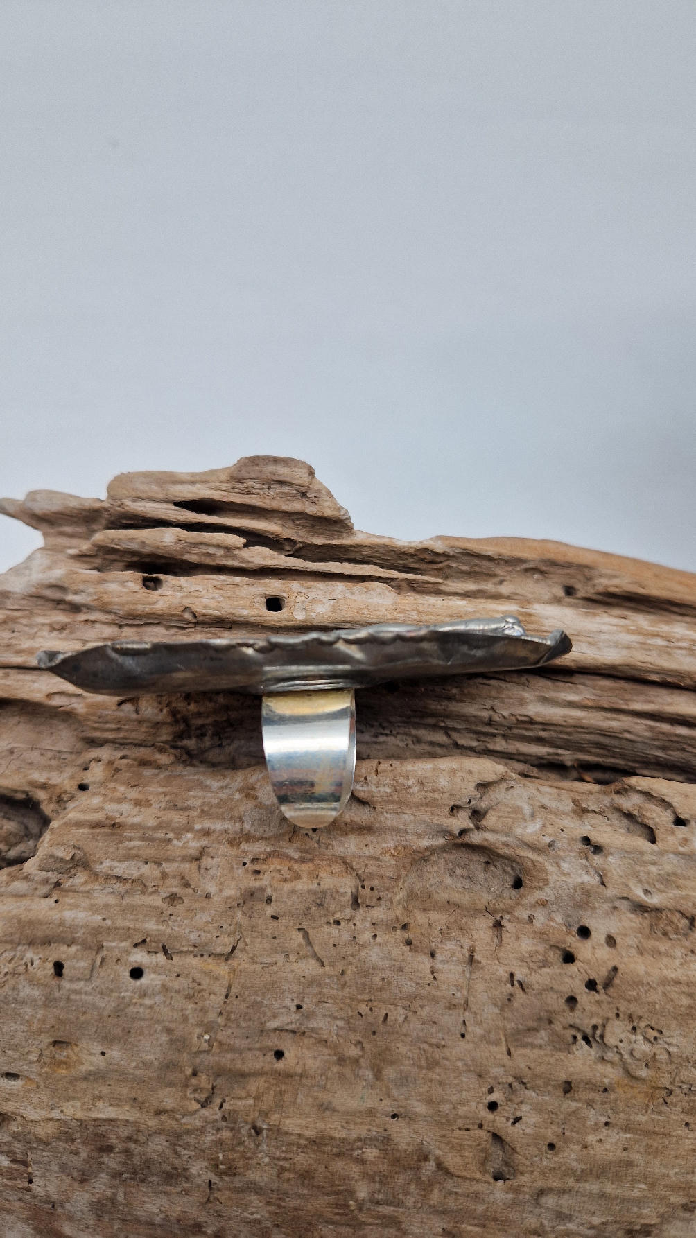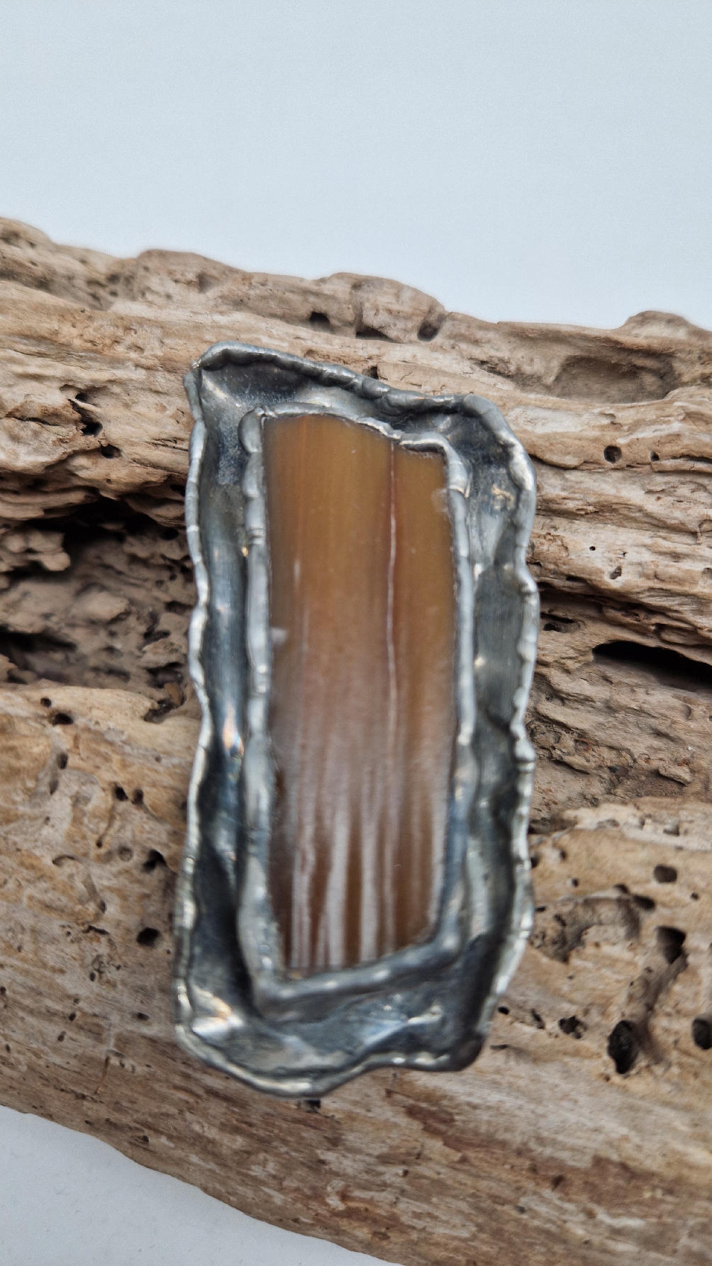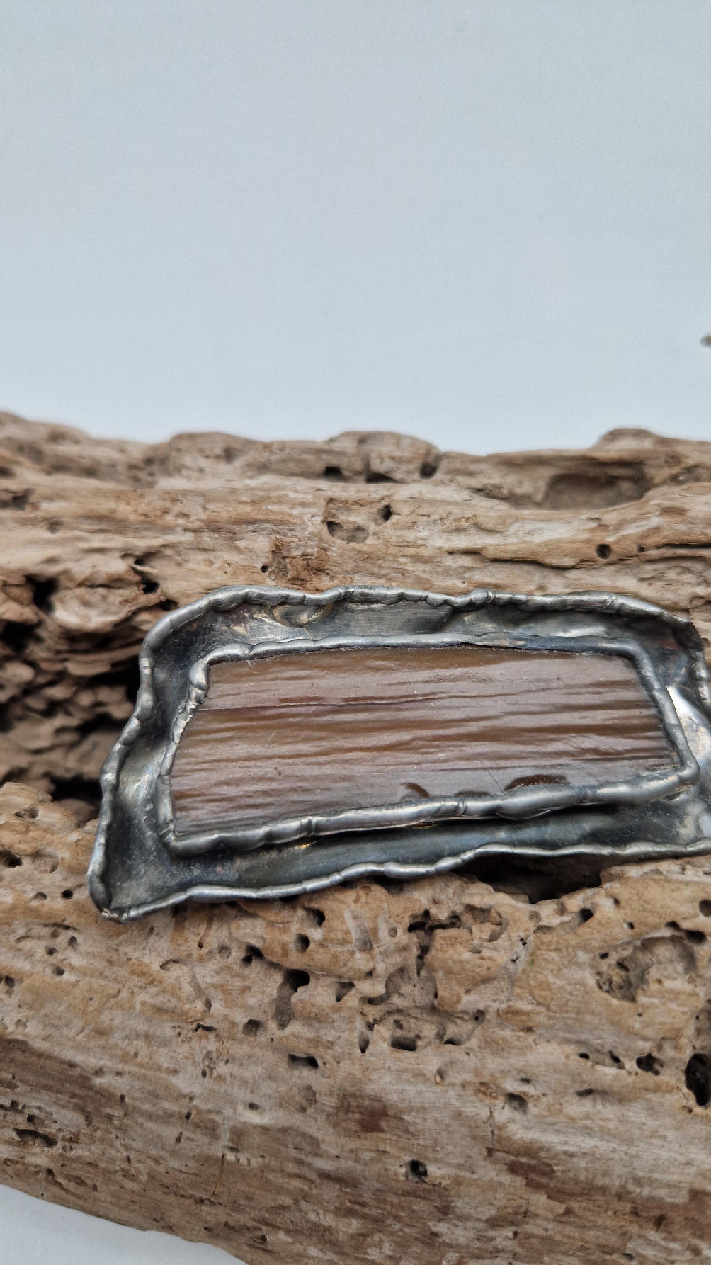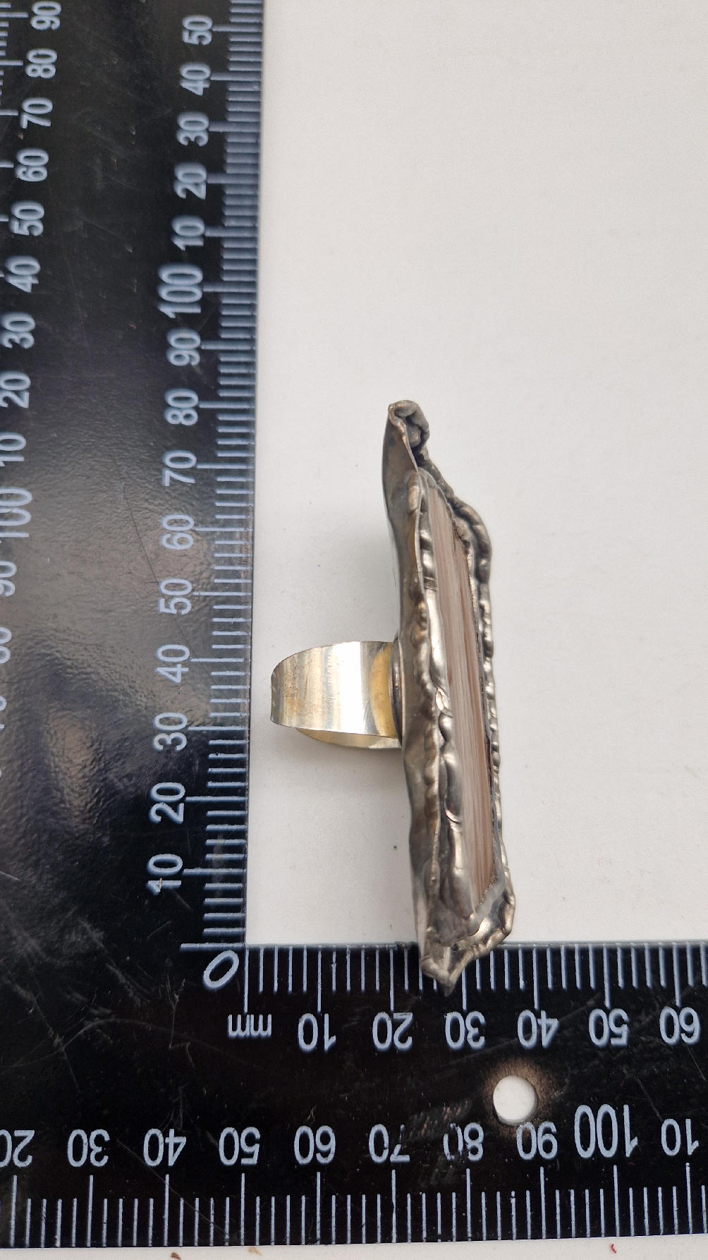 Niezwykle piękny, bardzo duży prostokątny pierścionek, którego oczkiem jest piękny, nieregularny i nieoszlifowany kawałek skamieniałego drewna z polskiego roztocza, z urozmaiconym przekrojem, w kolorze miodu i orzechów… oprawiony w kutą i patynowaną miedź. Piękna metaloplastyka z pięknym kamieniem . Pierścionek ma regulowaną obrączkę, więc pasuje na każdy palec…ale możesz powiesić go na łańcuszku lub rzemieniu, jeśli nie lubisz pierścionków, a podoba Ci się forma i kamień…