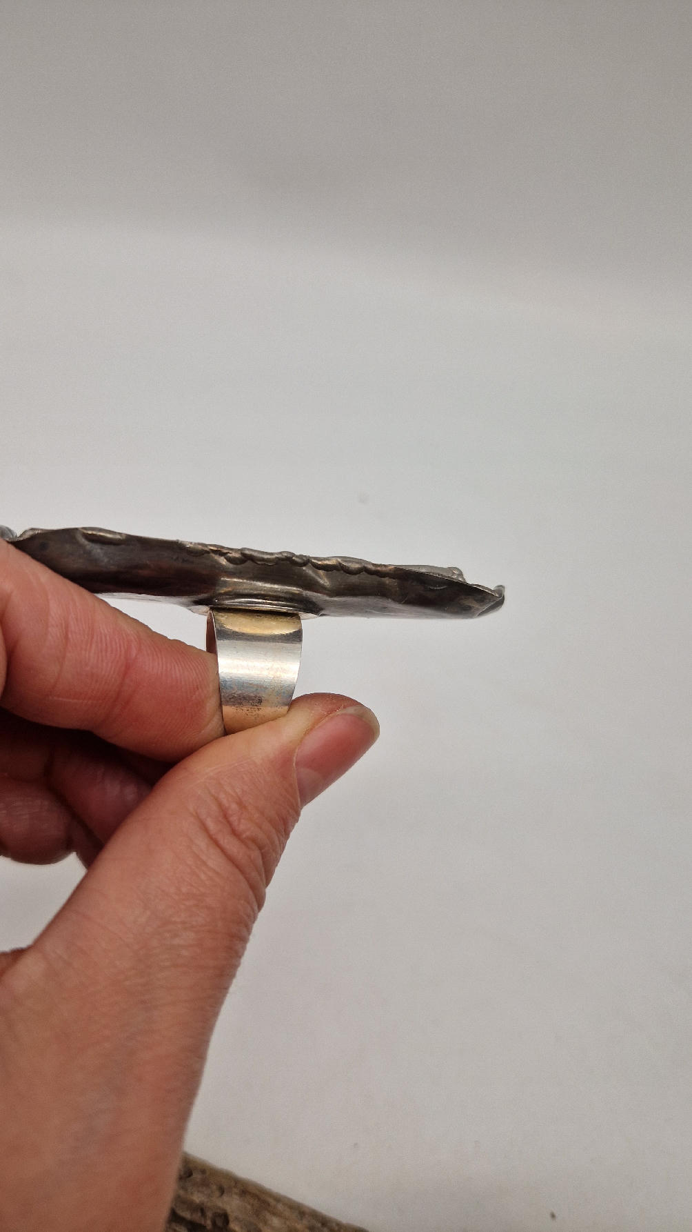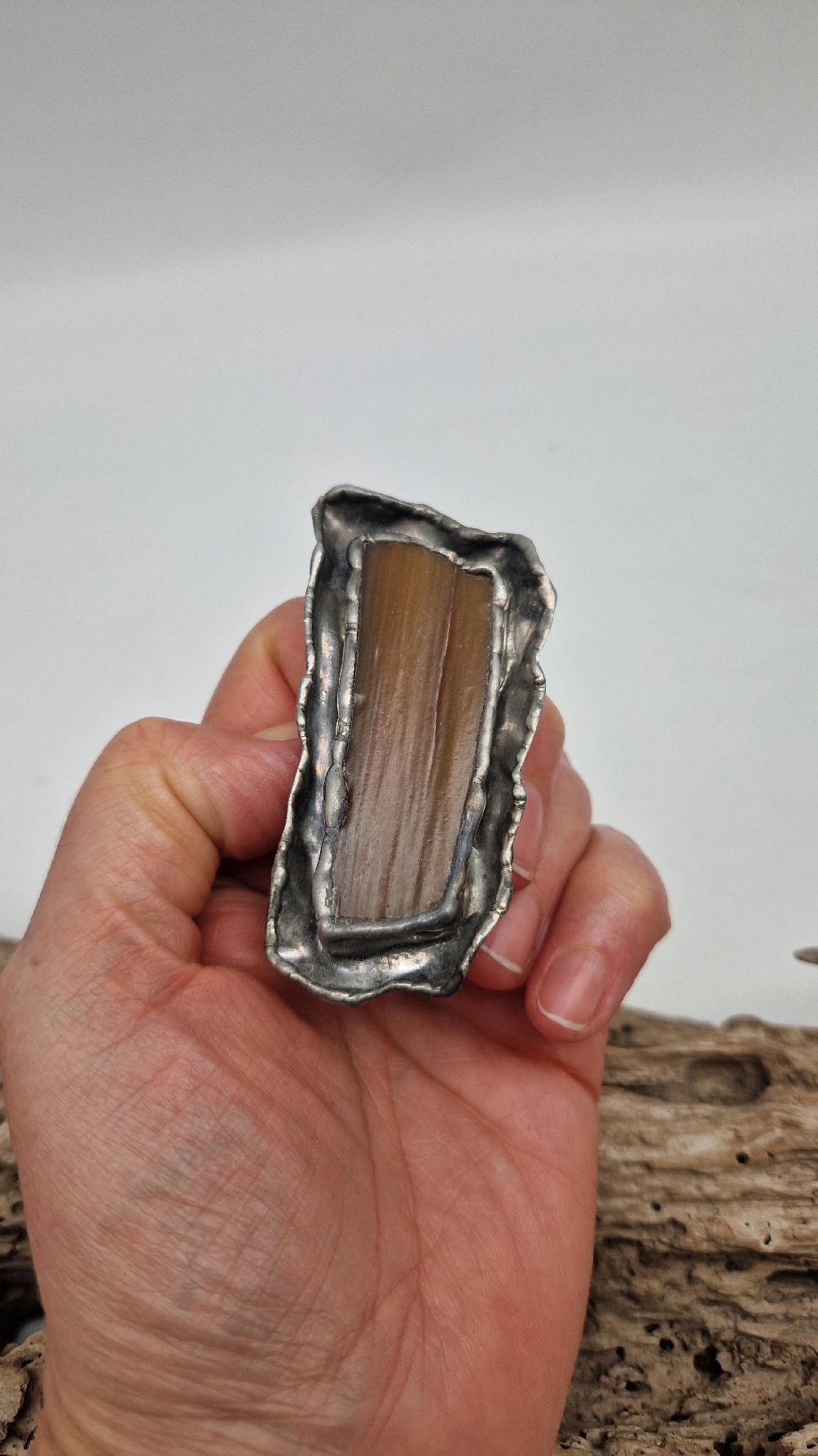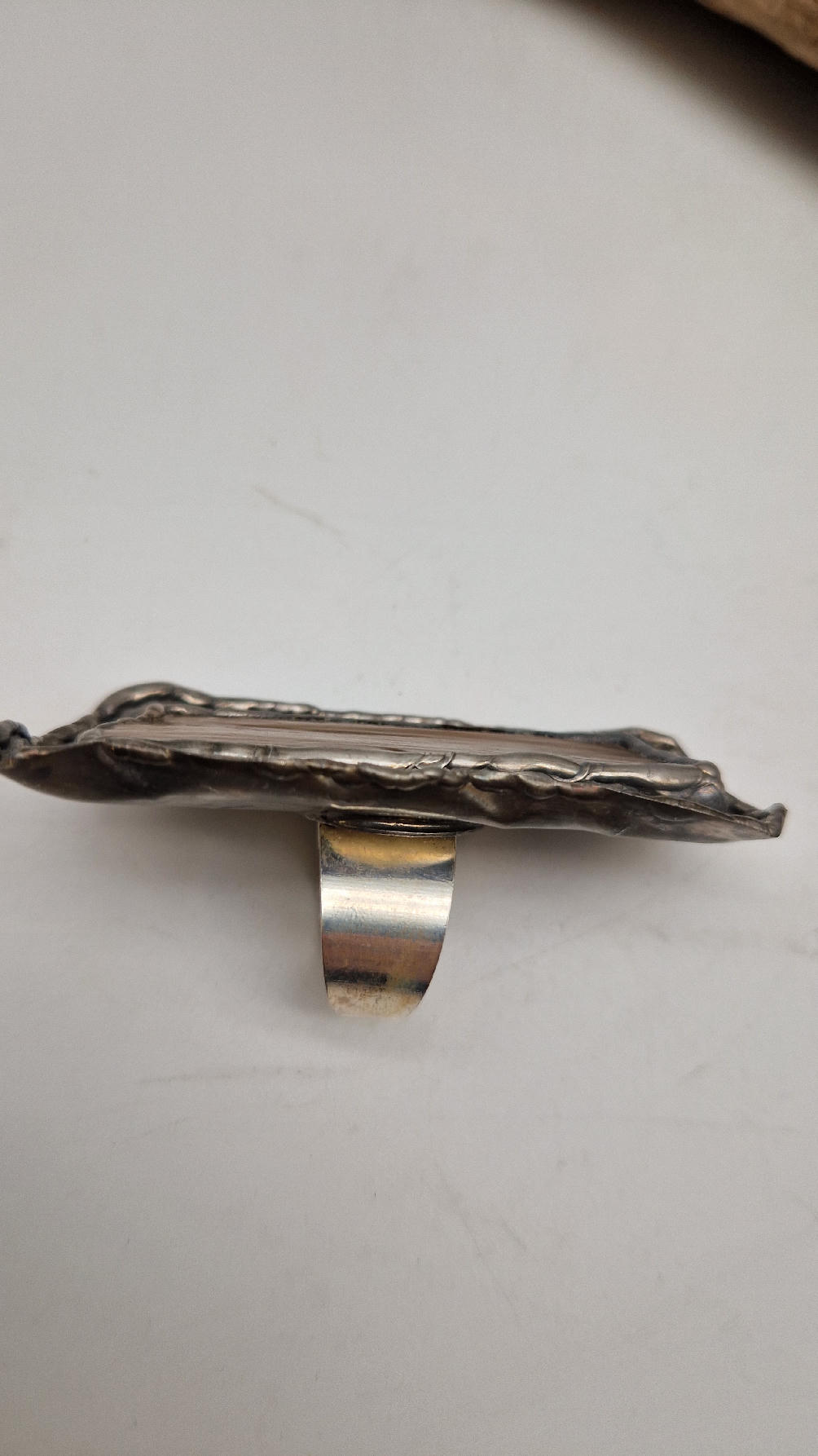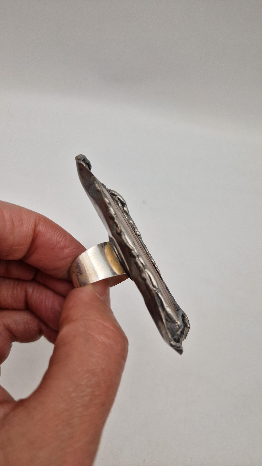 Niezwykle piękny, bardzo duży prostokątny pierścionek, którego oczkiem jest piękny, nieregularny i nieoszlifowany kawałek skamieniałego drewna z polskiego roztocza, z urozmaiconym przekrojem, w kolorze miodu i orzechów… oprawiony w kutą i patynowaną miedź. Piękna metaloplastyka z pięknym kamieniem . Pierścionek ma regulowaną obrączkę, więc pasuje na każdy palec…ale możesz powiesić go na łańcuszku lub rzemieniu, jeśli nie lubisz pierścionków, a podoba Ci się forma i kamień…