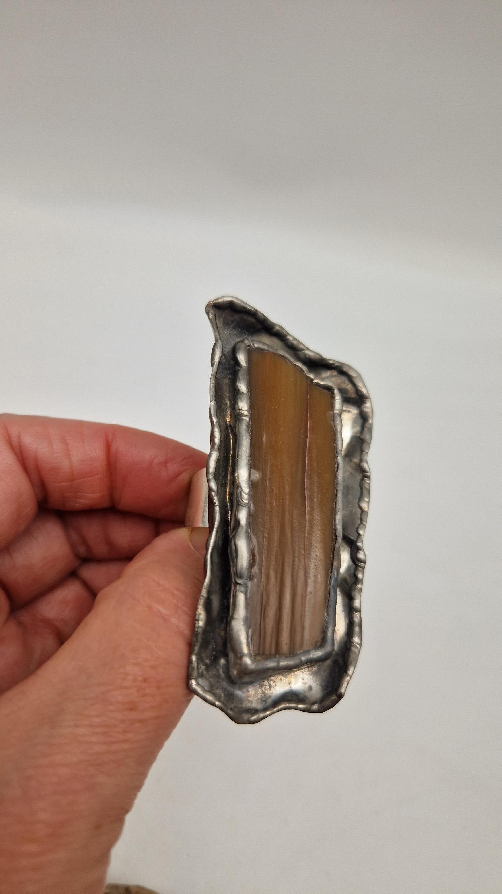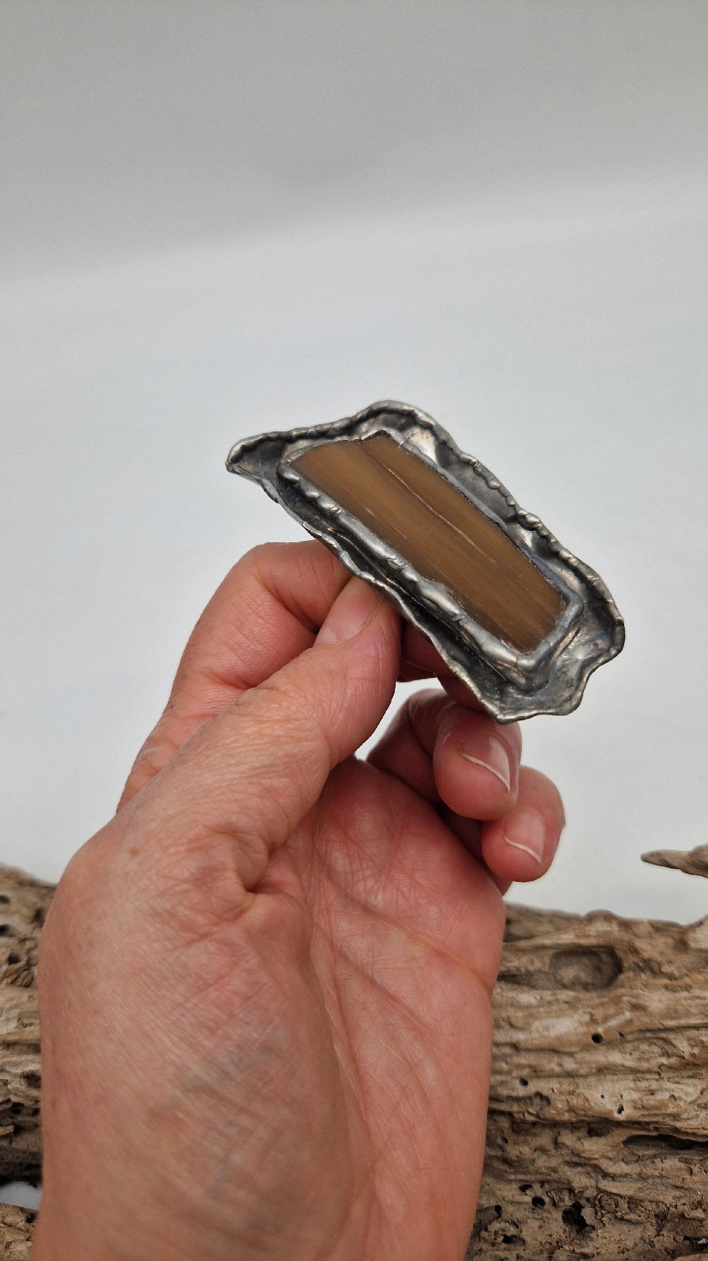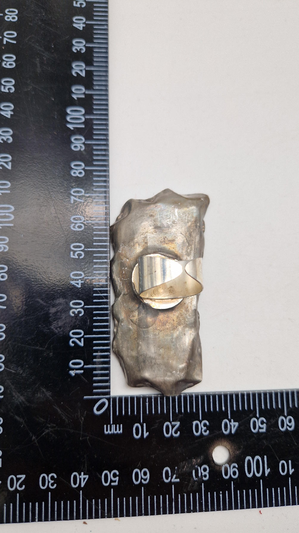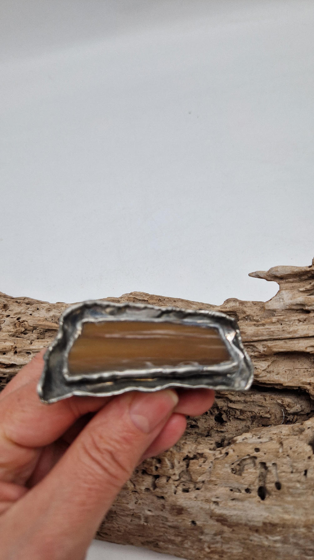 Niezwykle piękny, bardzo duży prostokątny pierścionek, którego oczkiem jest piękny, nieregularny i nieoszlifowany kawałek skamieniałego drewna z polskiego roztocza, z urozmaiconym przekrojem, w kolorze miodu i orzechów… oprawiony w kutą i patynowaną miedź. Piękna metaloplastyka z pięknym kamieniem . Pierścionek ma regulowaną obrączkę, więc pasuje na każdy palec…ale możesz powiesić go na łańcuszku lub rzemieniu, jeśli nie lubisz pierścionków, a podoba Ci się forma i kamień…