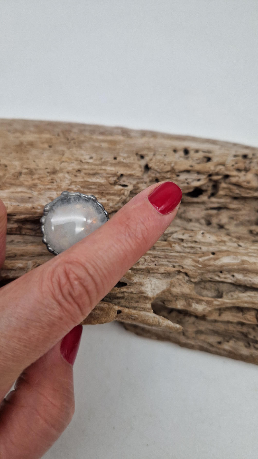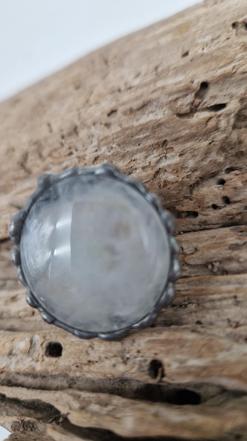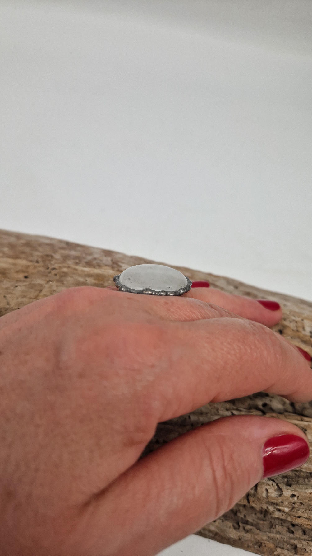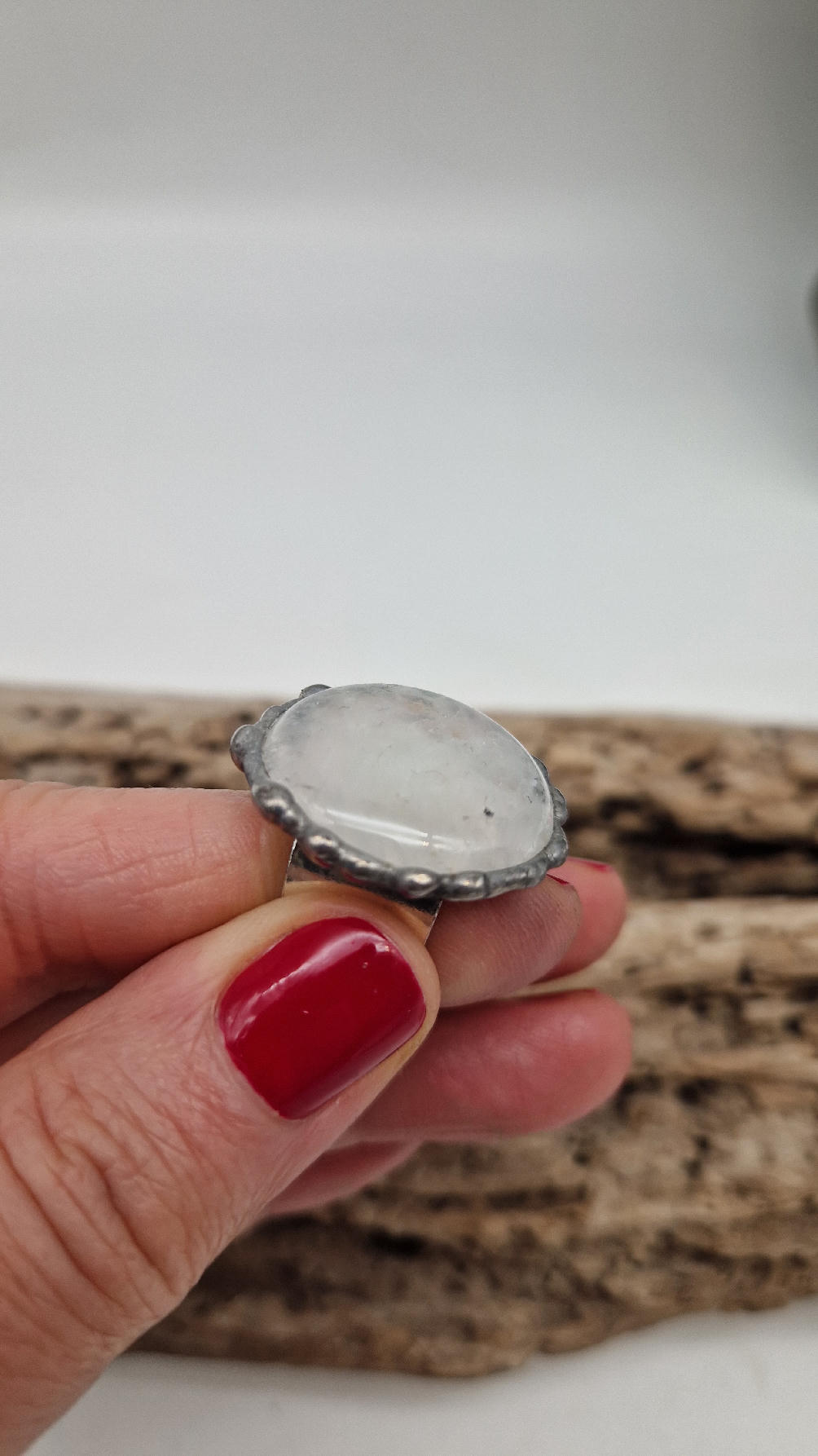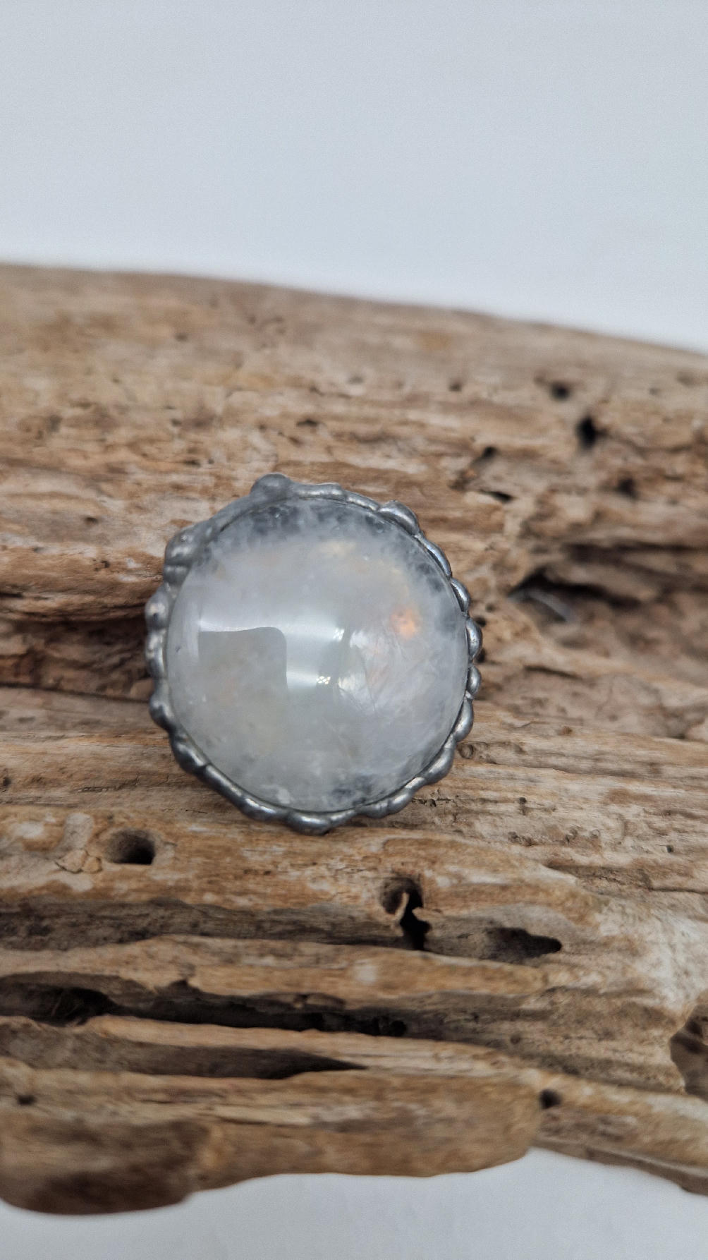 Śliczny , okrągły, biały pierścionek… a kamień w środku to KWARC …oprawiony w kutą i patynowaną miedź. Piękna metaloplastyka z pięknym kamieniem . Pierścionek ma regulowaną obrączkę, więc pasuje na każdy palec…ale możesz powiesić go na łańcuszku lub rzemieniu, jeśli nie lubisz pierścionków, a podoba Ci się forma i kamień…