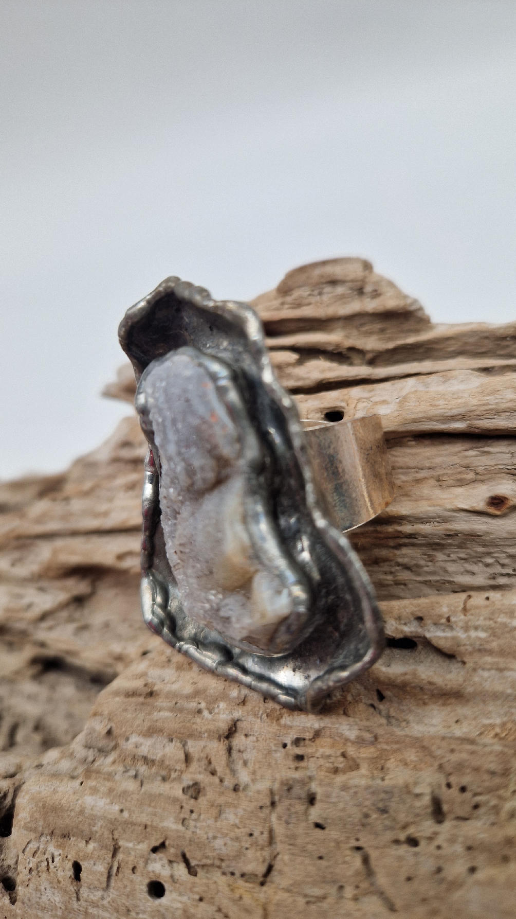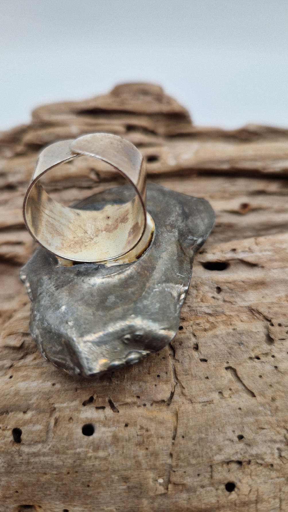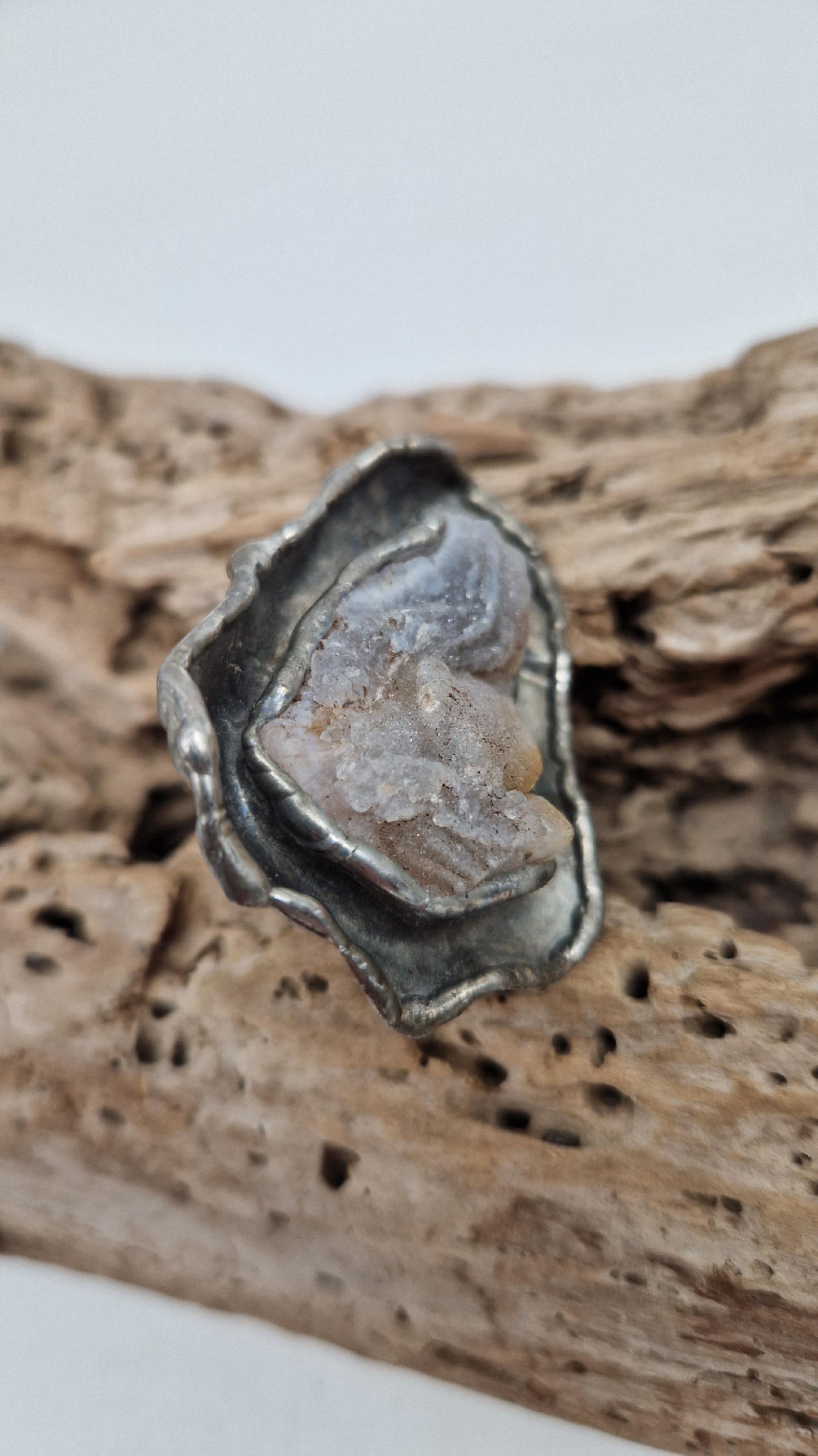 Metaloplastyczna oprawa tego pierścionka podkreśla naturalne piękno kamienia i nadaje mu elegancji i subtelnego wyrazu. To jak małe dzieło sztuki, które łączy w sobie naturę i rękodzielniczy kunszt. Każdy detal jest starannie wykonany, aby oddać wyjątkowość i piękno tego kamienia.