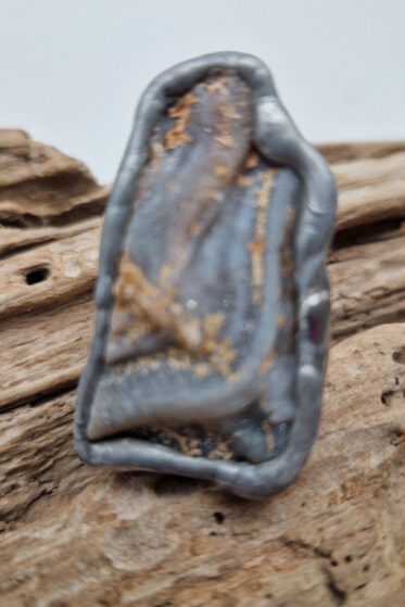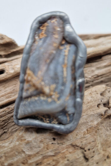 Duży, prostokątny pierścionek z prostokątnym białym, lekko perłowym oczkiem z naturalnym kamieniem o uroczej nazwie Selenit