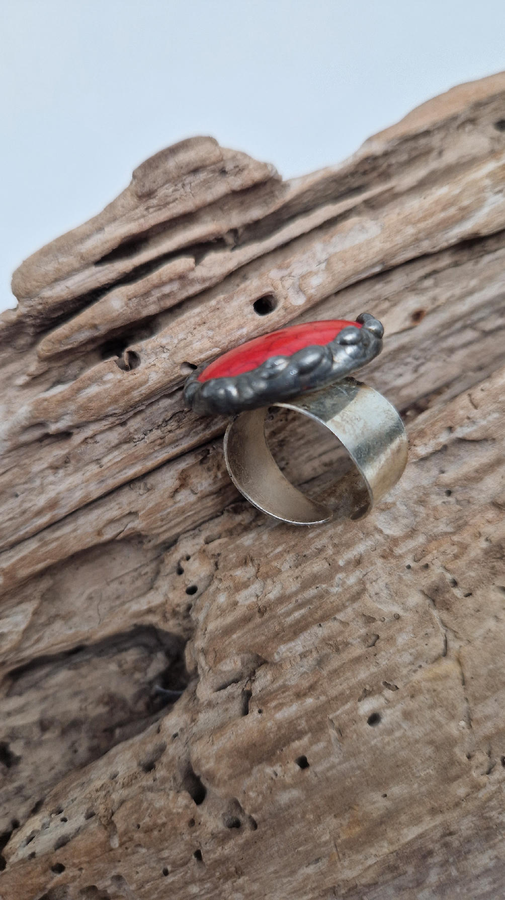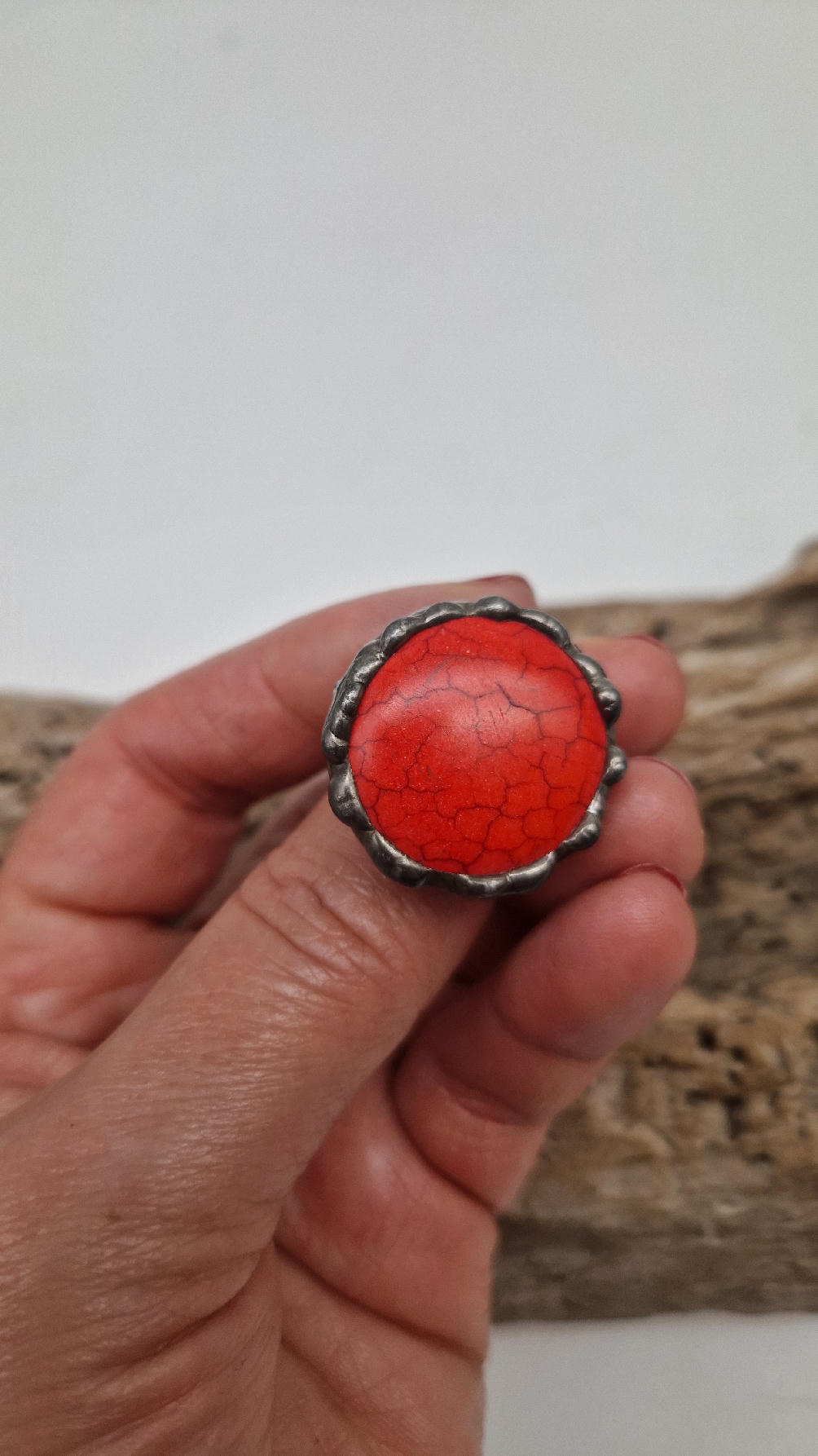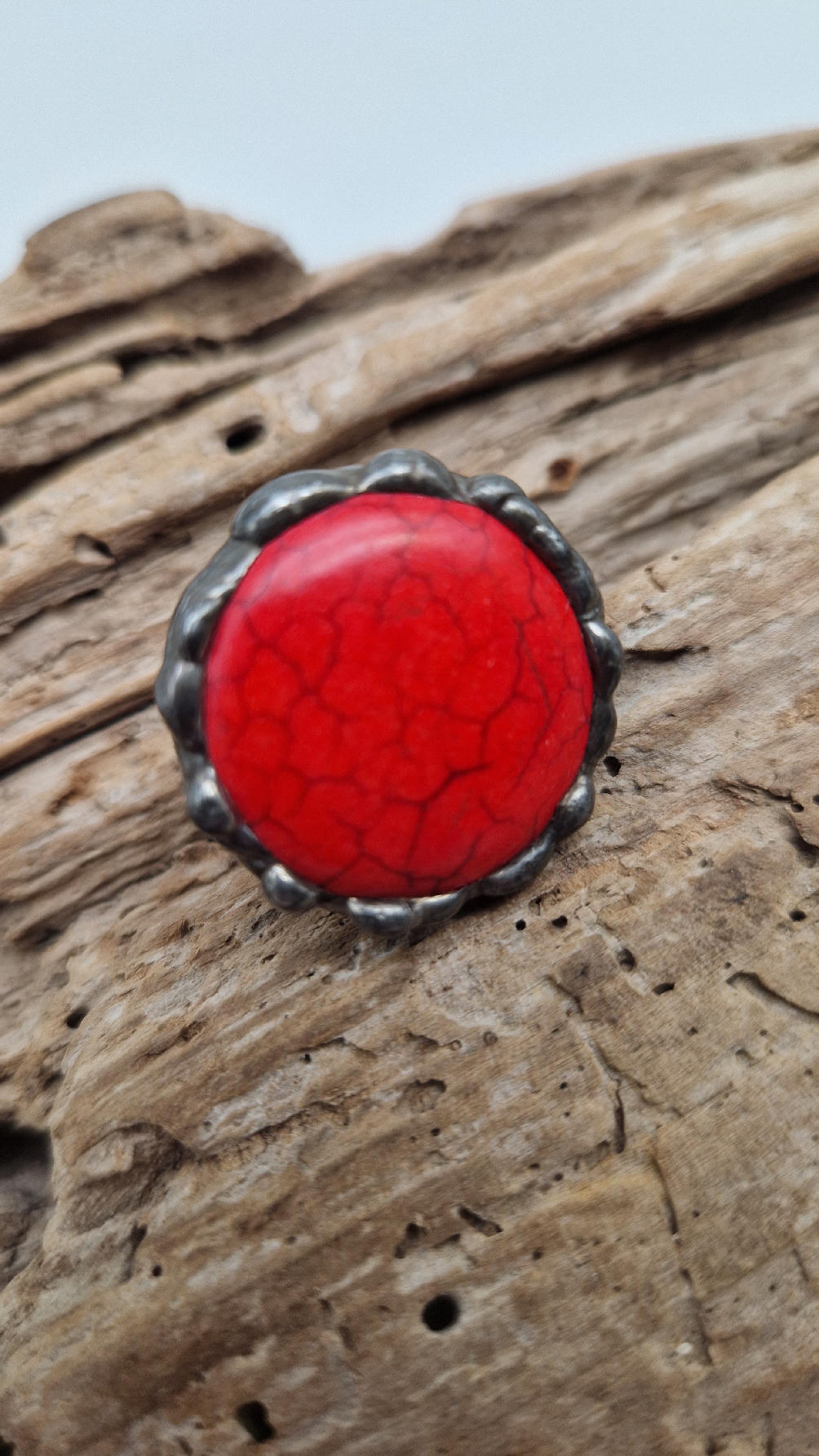 Czerwony, okrągły, śliczny pierścionek z chowlitem, a dookoła po prostu ręcznie robiona metaloplastyka. Pierścionek ma regulowaną obrączkę, więc pasuje na każdy palec…ale możesz powiesić go na łańcuszku lub rzemieniu, jeśli nie lubisz pierścionków, a podoba Ci się forma i kamień…