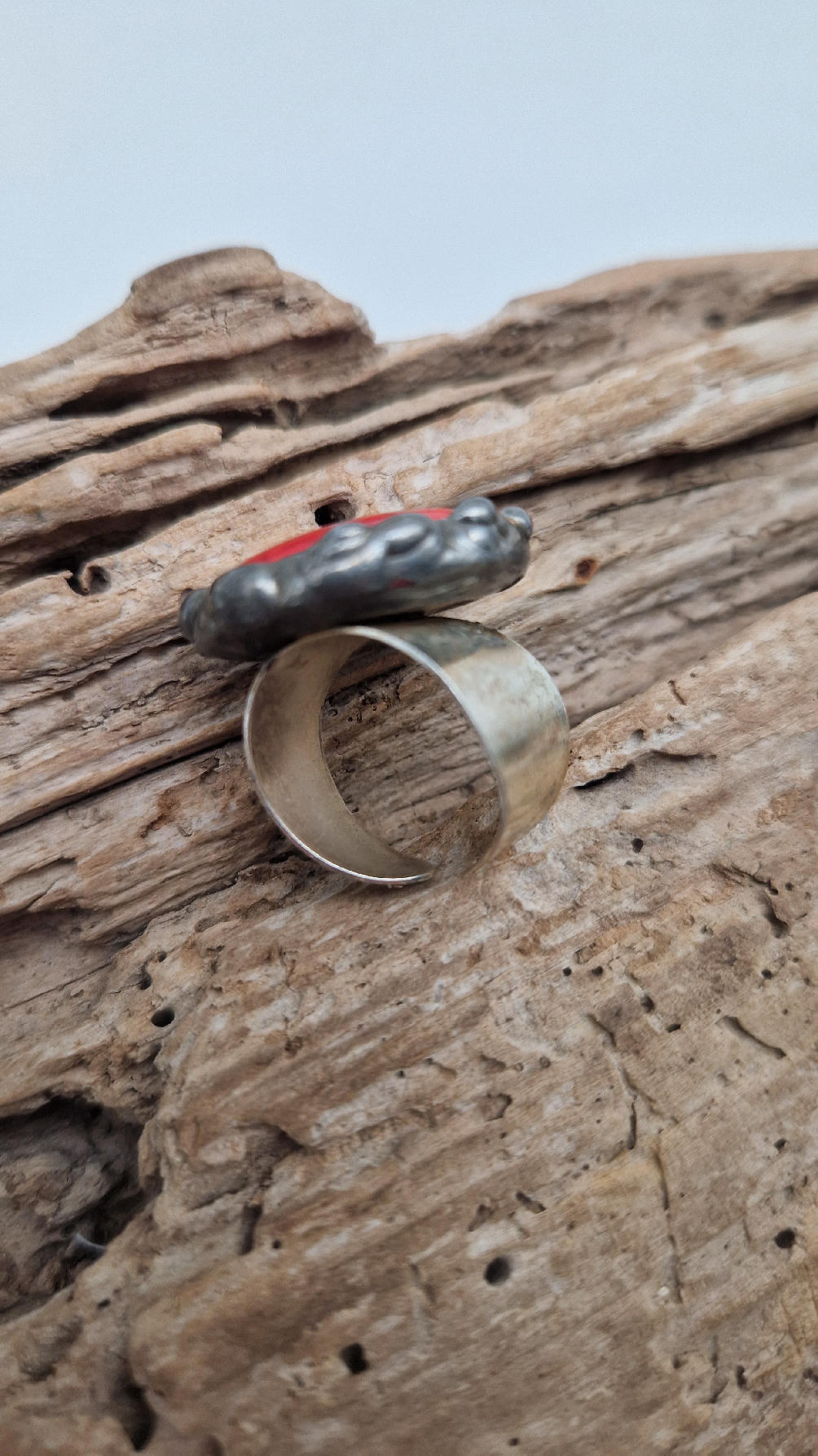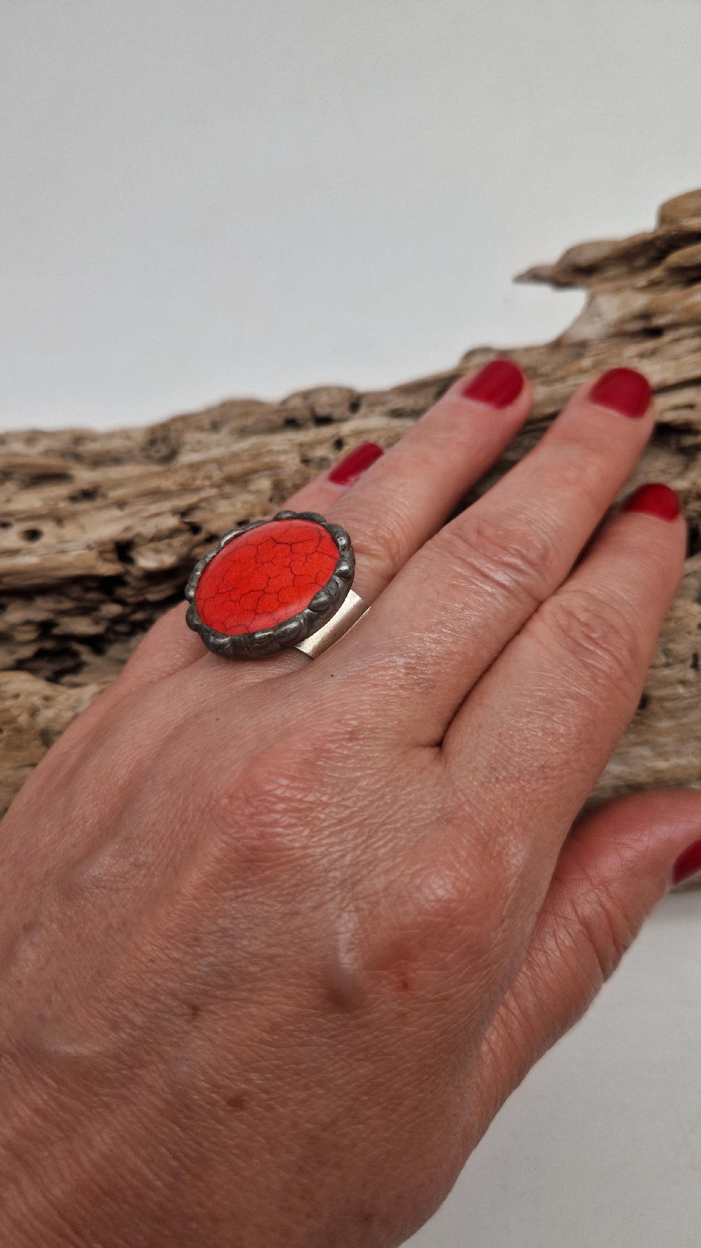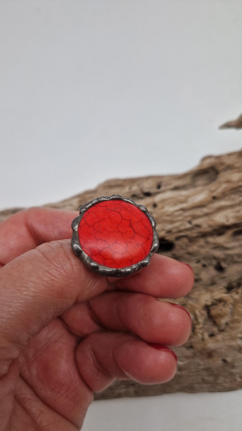 Czerwony, okrągły, śliczny pierścionek z chowlitem, a dookoła po prostu ręcznie robiona metaloplastyka. Pierścionek ma regulowaną obrączkę, więc pasuje na każdy palec…ale możesz powiesić go na łańcuszku lub rzemieniu, jeśli nie lubisz pierścionków, a podoba Ci się forma i kamień…