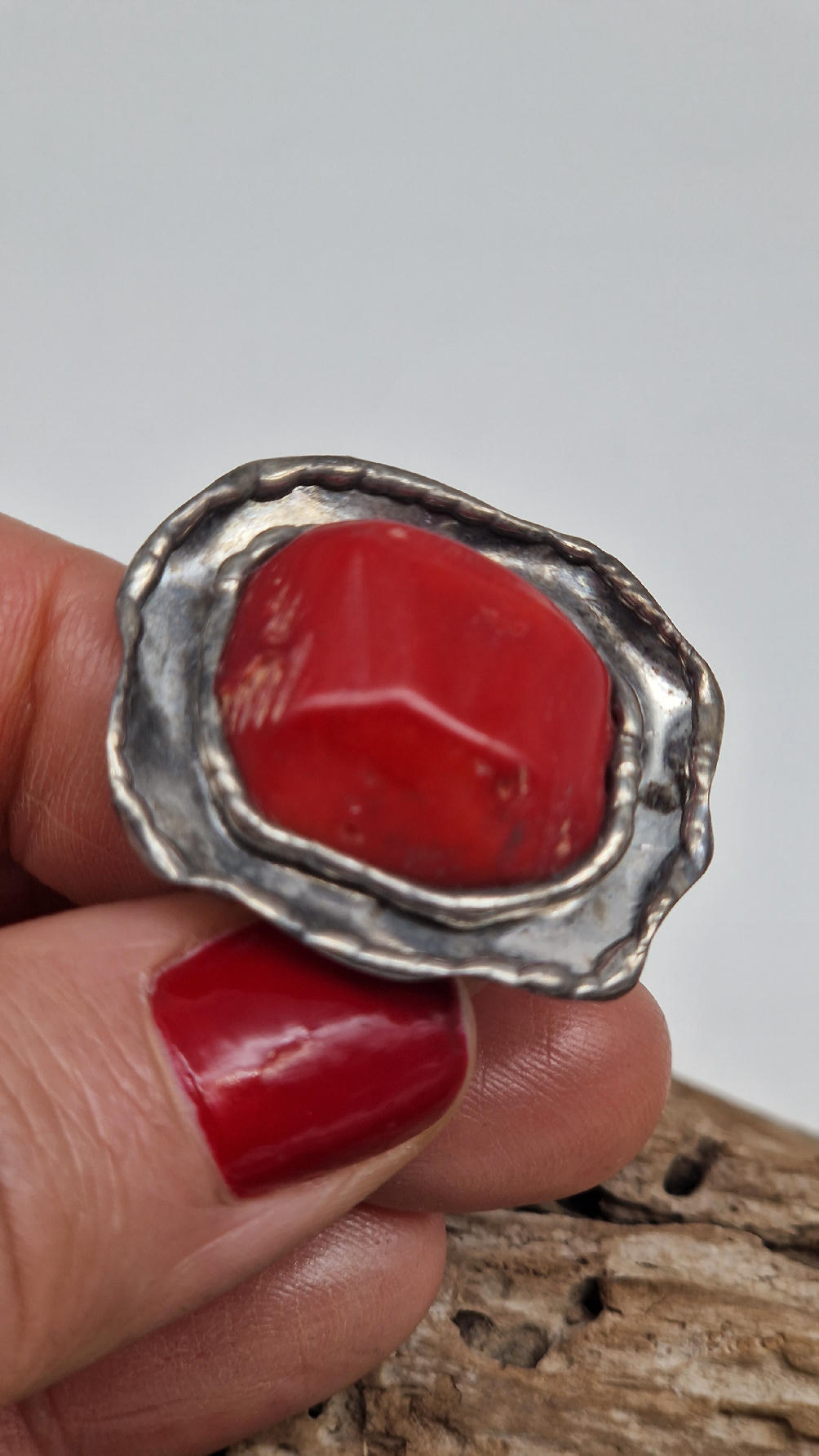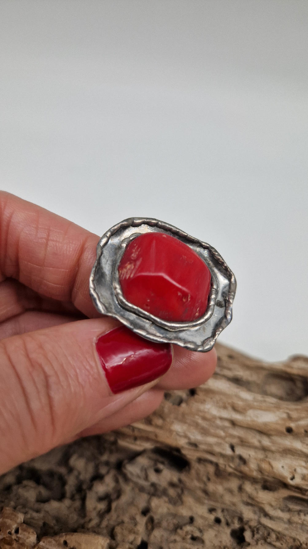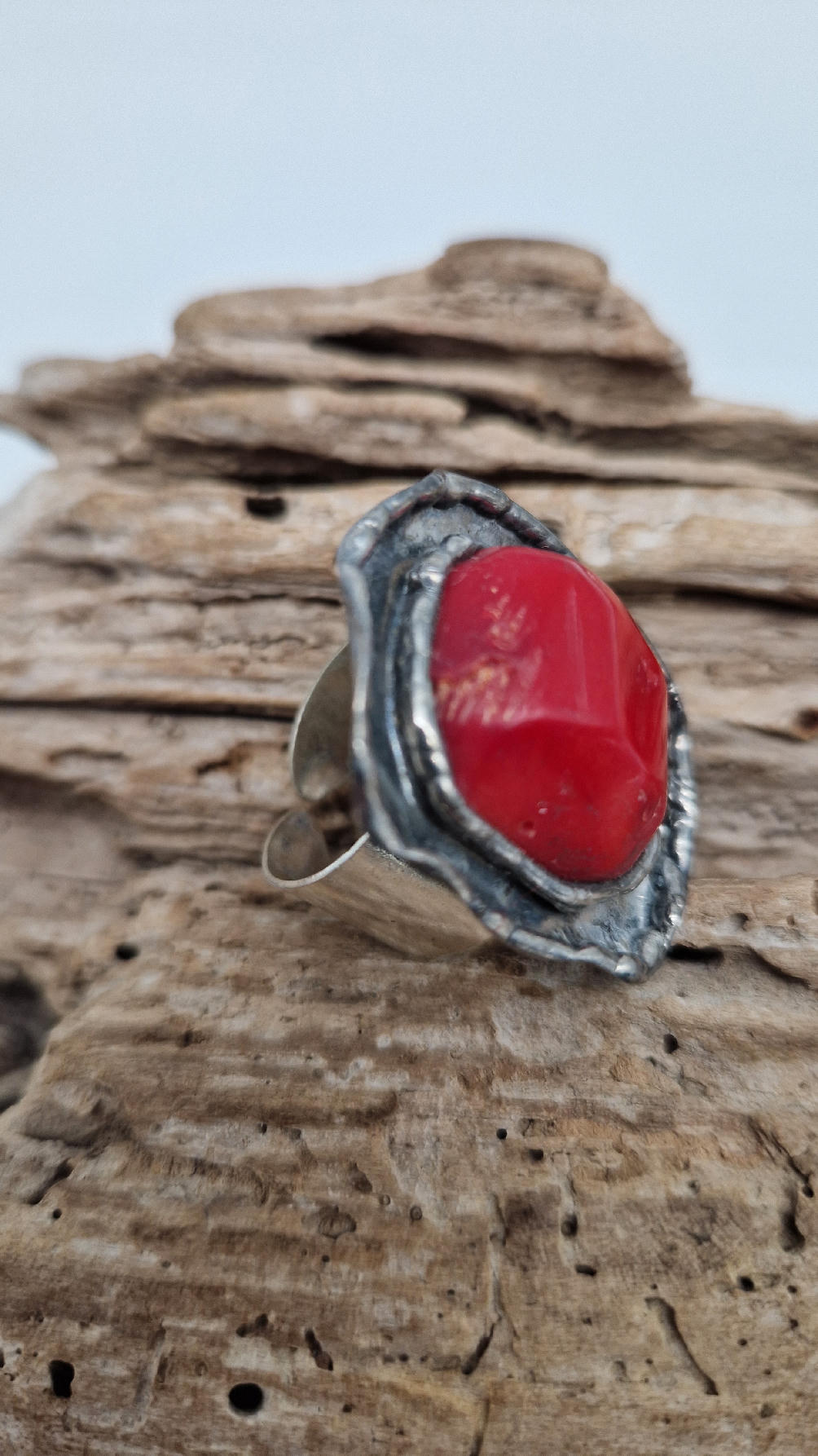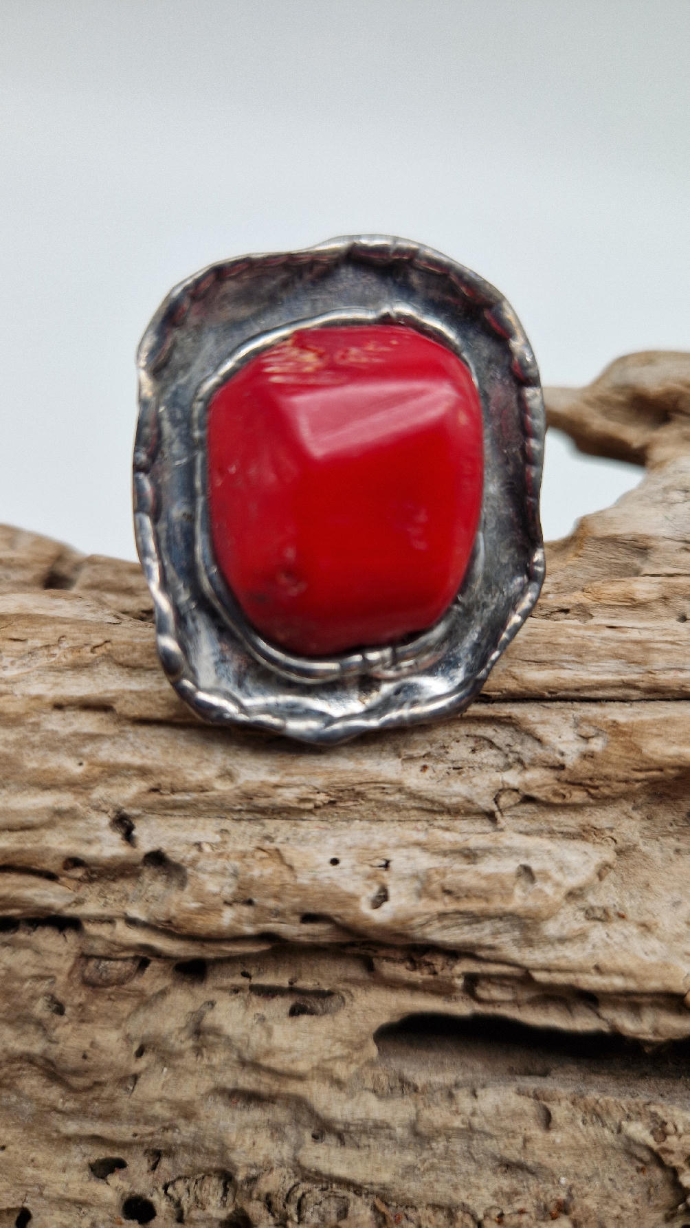 Niezwykle piękny pierścionek, którego oczkiem jest naturalny, koralowiec, a dookoła po prostu ręcznie robiona metaloplastyka. Pierścionek ma regulowaną obrączkę, więc pasuje na każdy palec…ale możesz powiesić go na łańcuszku lub rzemieniu, jeśli nie lubisz pierścionków, a podoba Ci się forma i kamień…