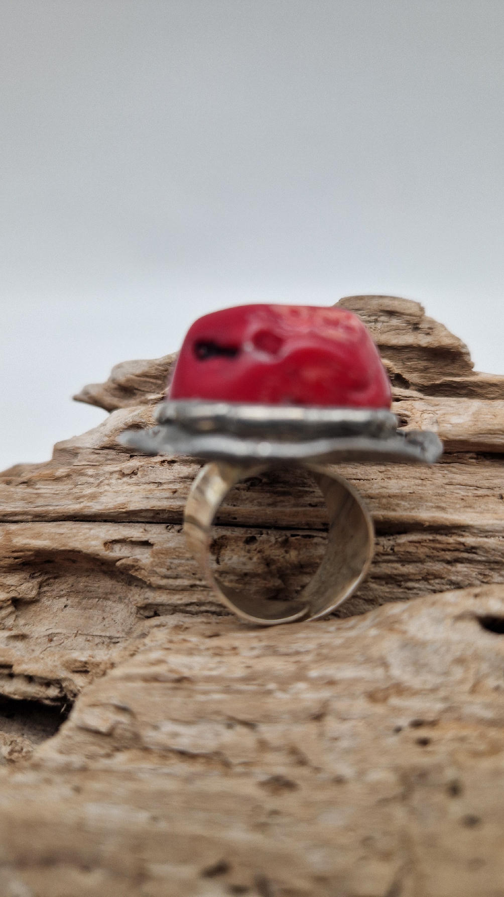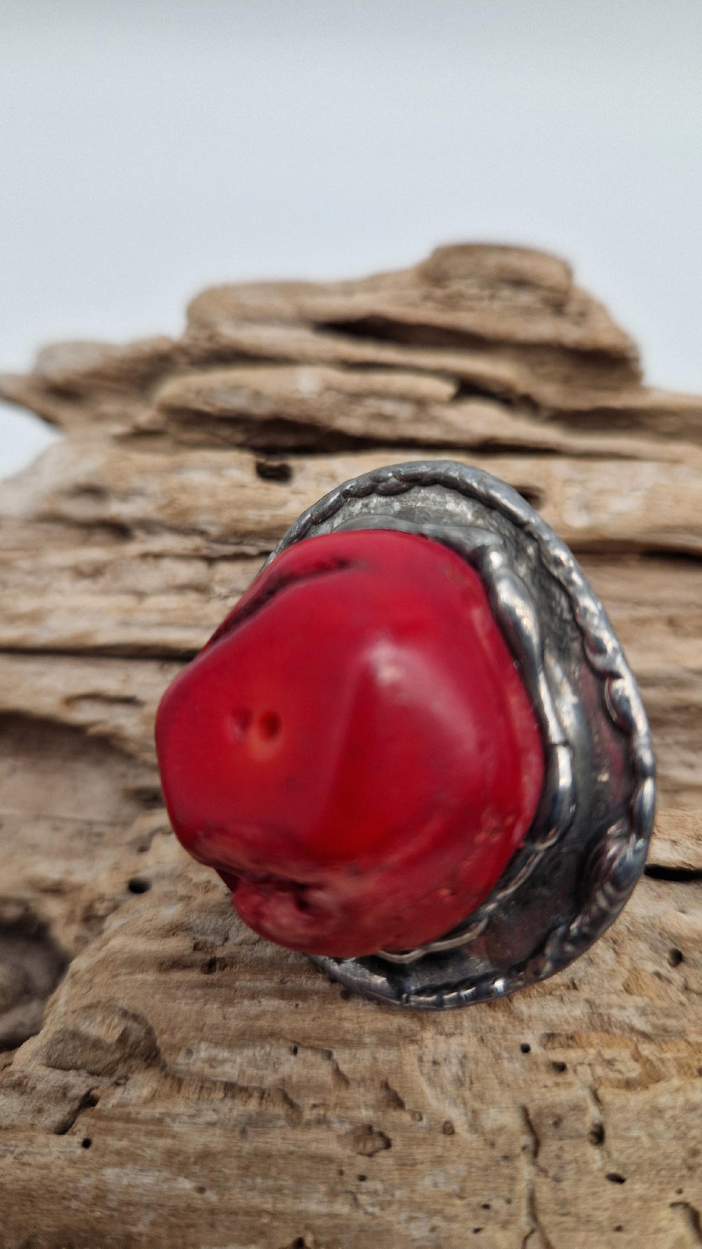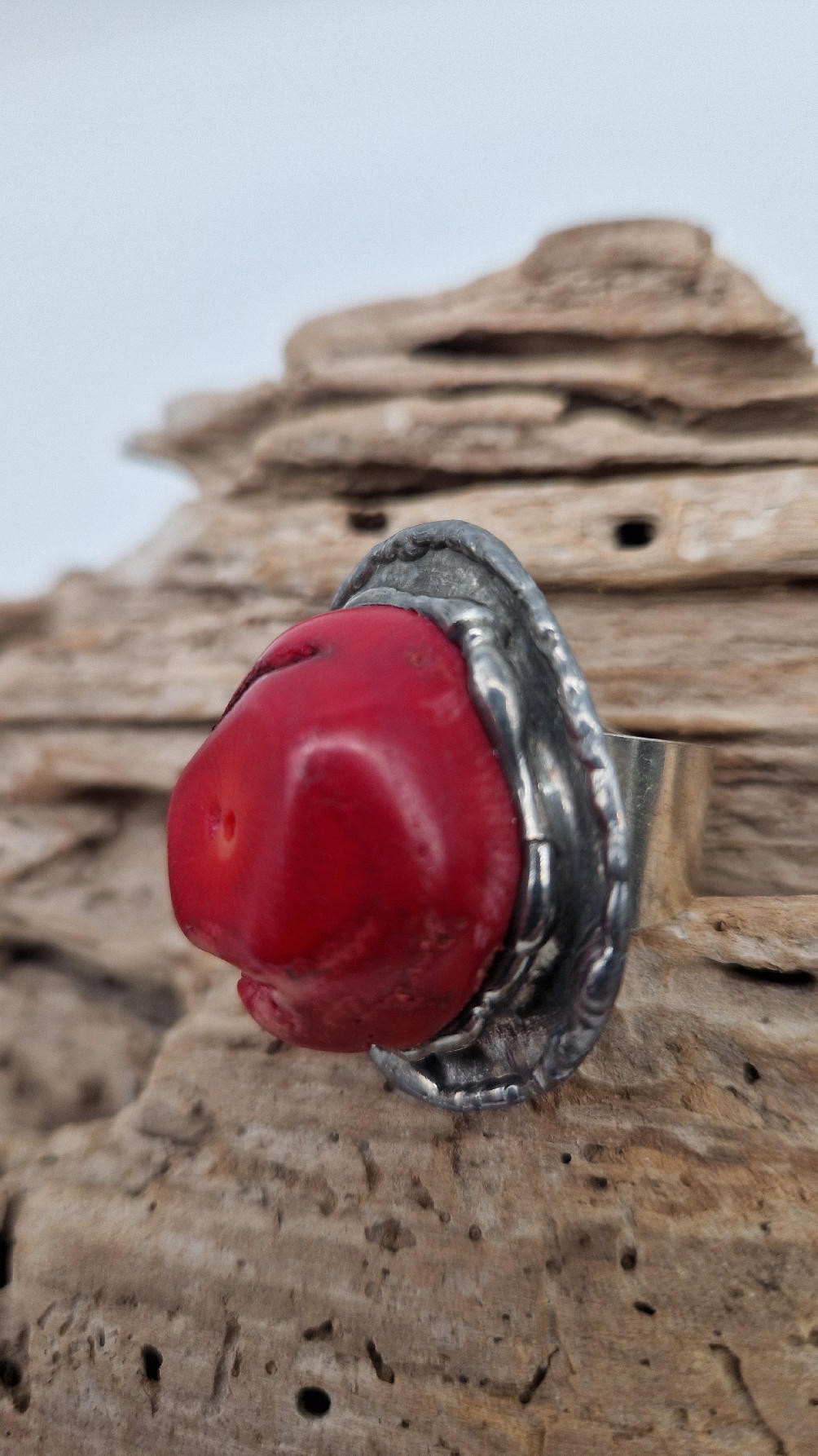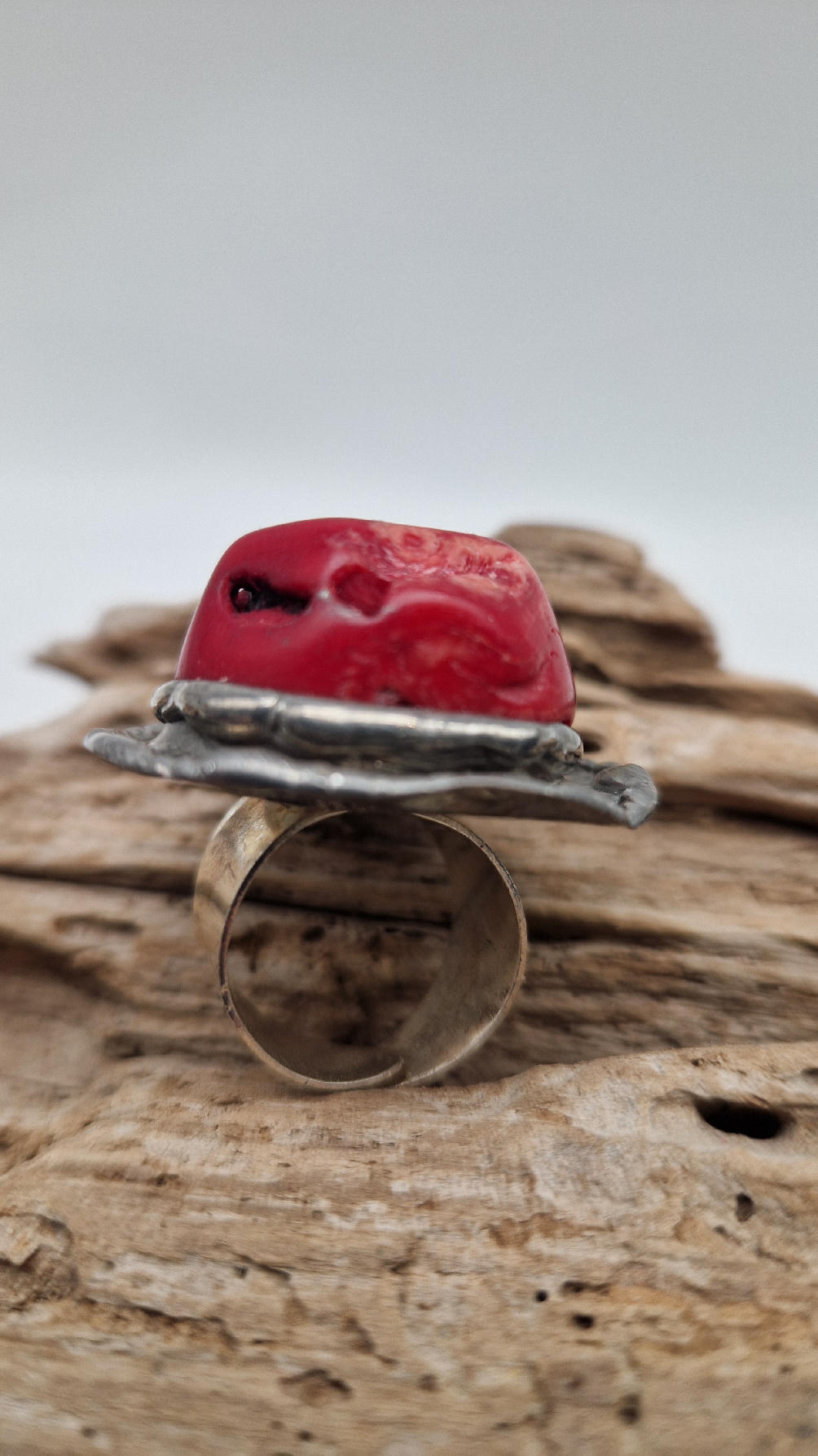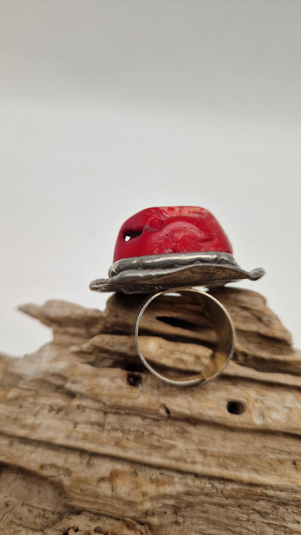 Niezwykle piękny pierścionek, którego oczkiem jest naturalny, koralowiec, a dookoła po prostu ręcznie robiona metaloplastyka. Pierścionek ma regulowaną obrączkę, więc pasuje na każdy palec…ale możesz powiesić go na łańcuszku lub rzemieniu, jeśli nie lubisz pierścionków, a podoba Ci się forma i kamień…