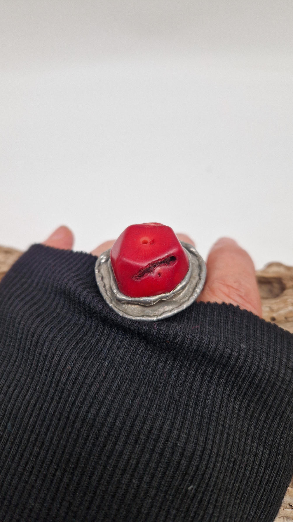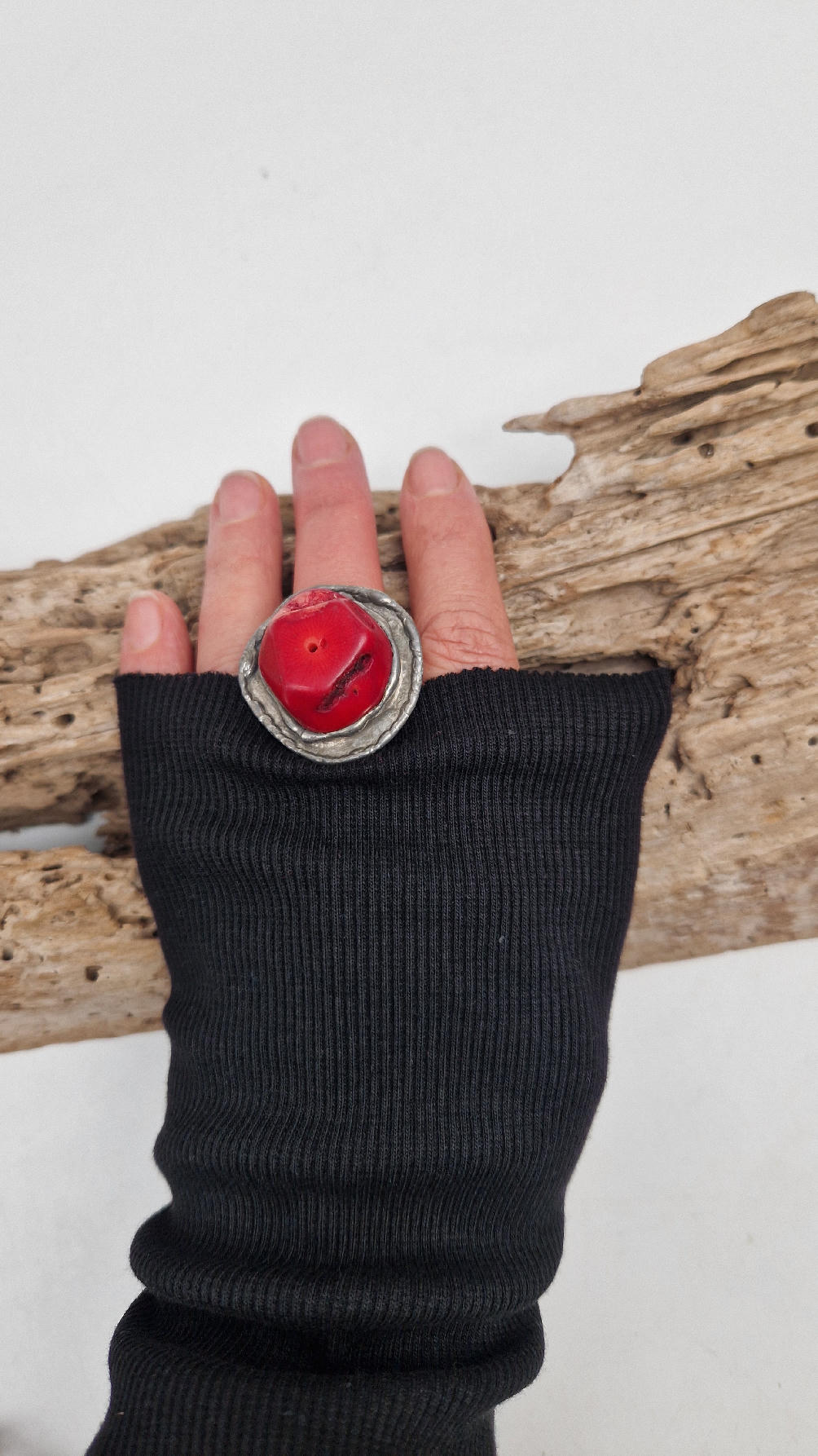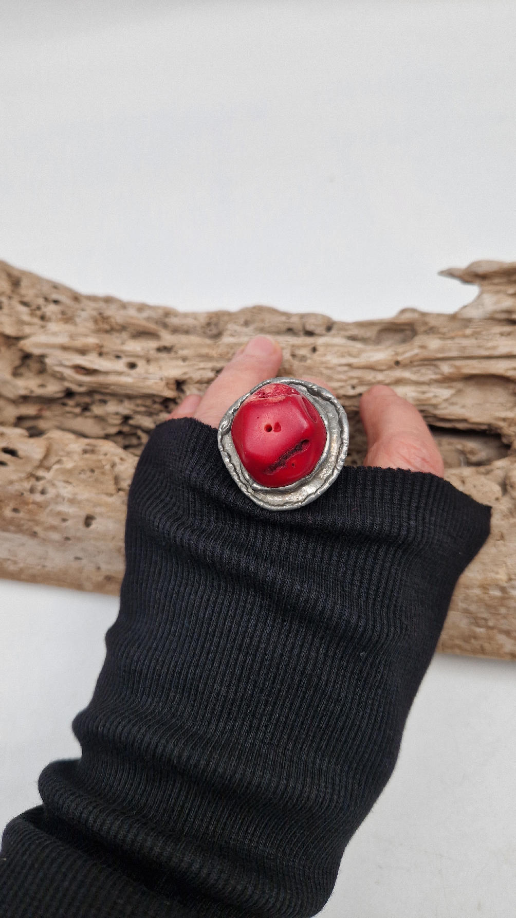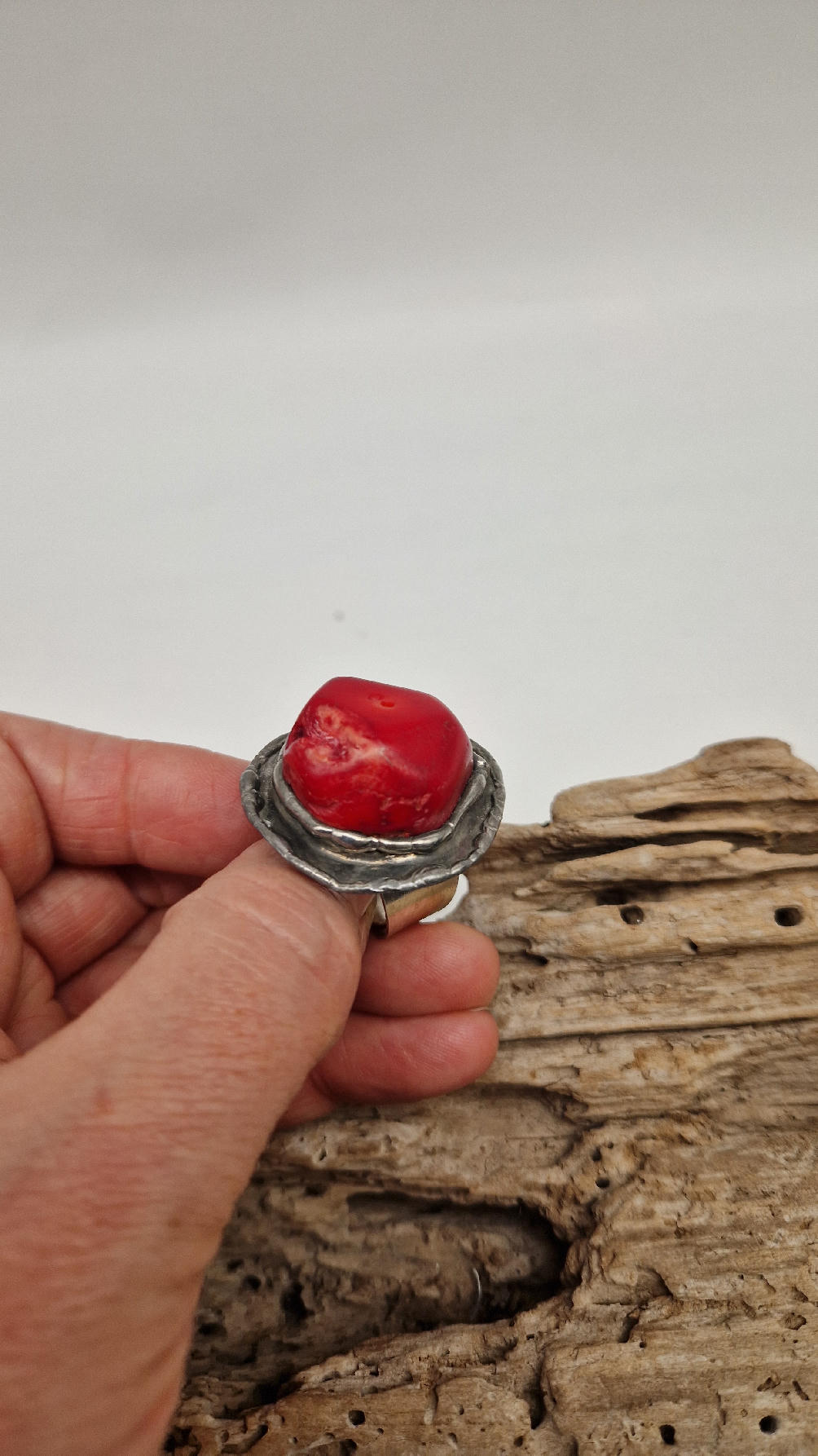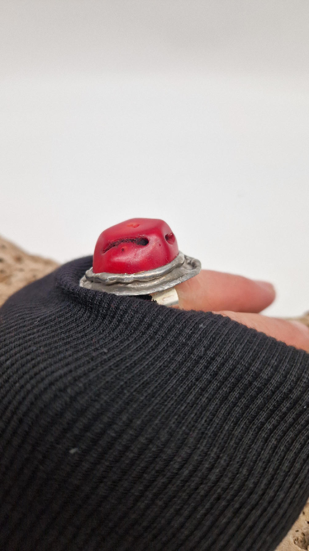 Niezwykle piękny pierścionek, którego oczkiem jest naturalny, koralowiec, a dookoła po prostu ręcznie robiona metaloplastyka. Pierścionek ma regulowaną obrączkę, więc pasuje na każdy palec…ale możesz powiesić go na łańcuszku lub rzemieniu, jeśli nie lubisz pierścionków, a podoba Ci się forma i kamień…