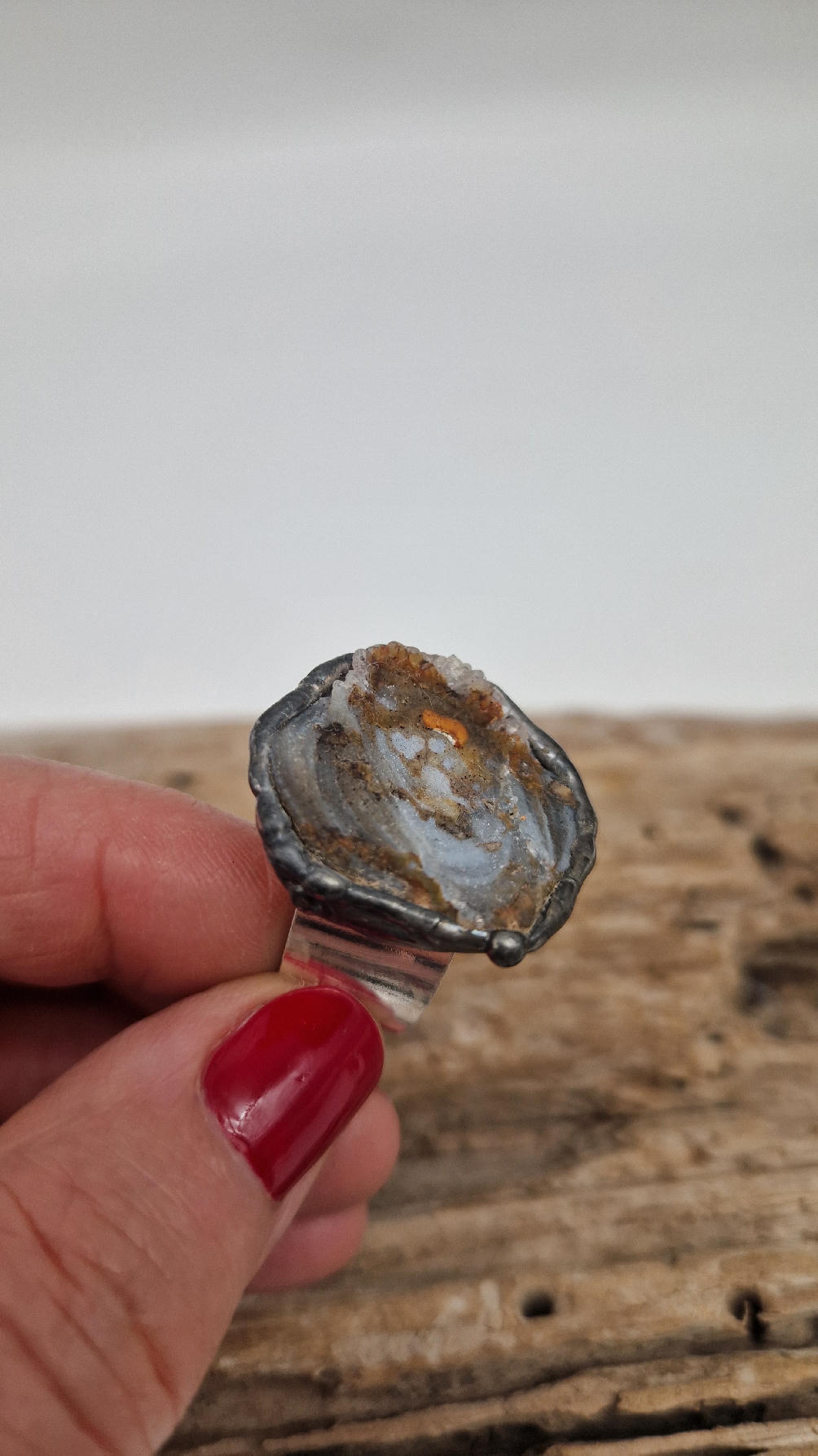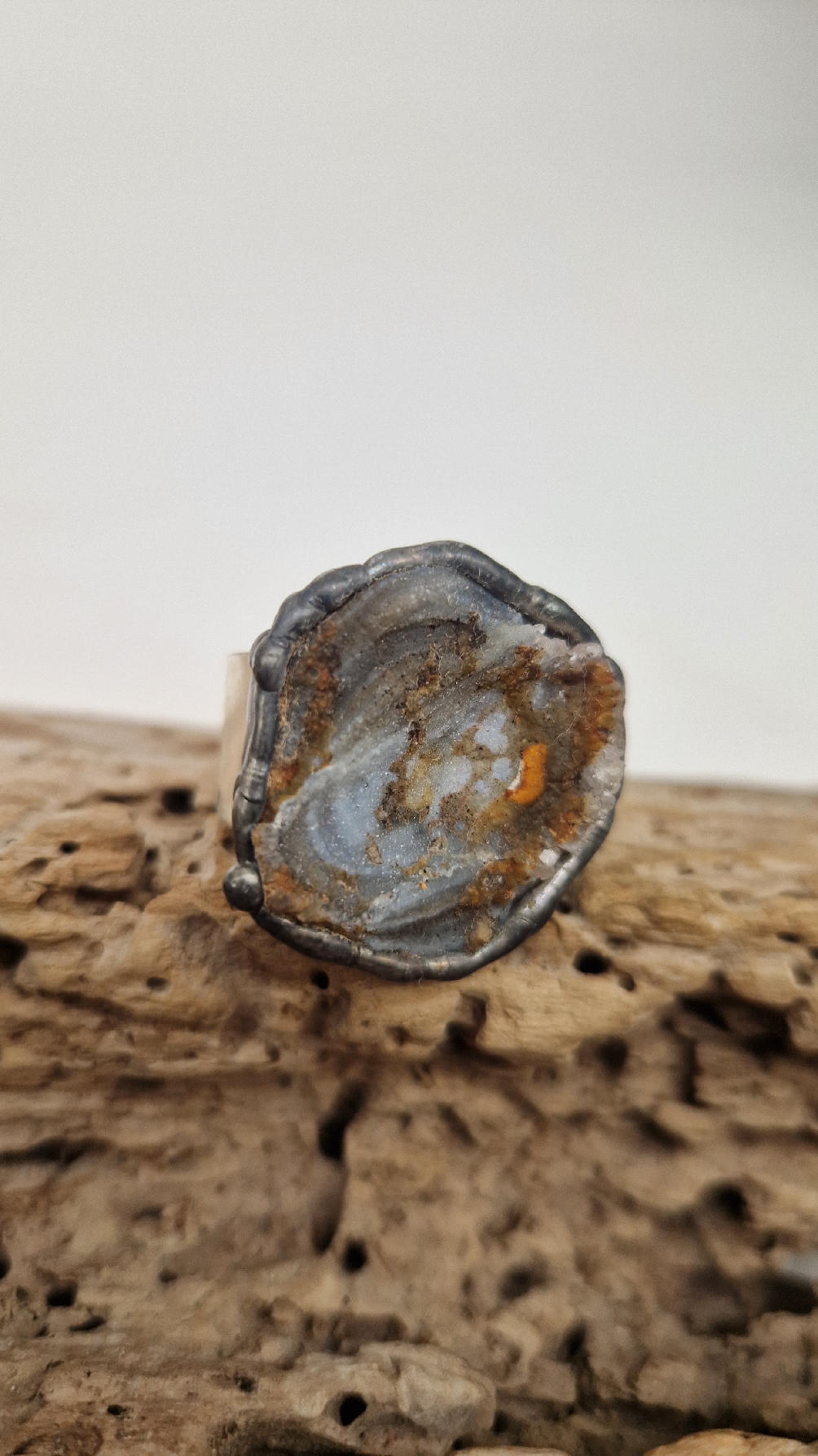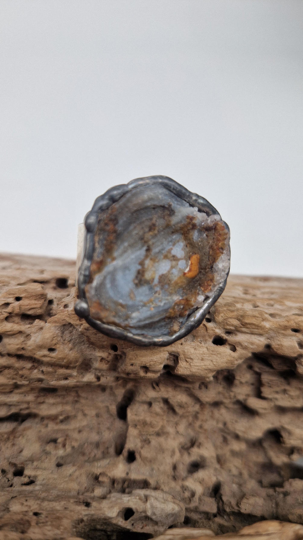 Niewielki, ale prześliczny pierścionek z chalcedonem,  który wygląda jak obraz, przenikające się szarości, błękity i rudości…stworzone przez naturę w dalekiej Brazylii, a potem subtelnie oprawione w metal…