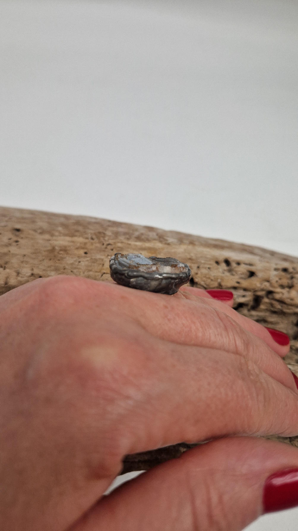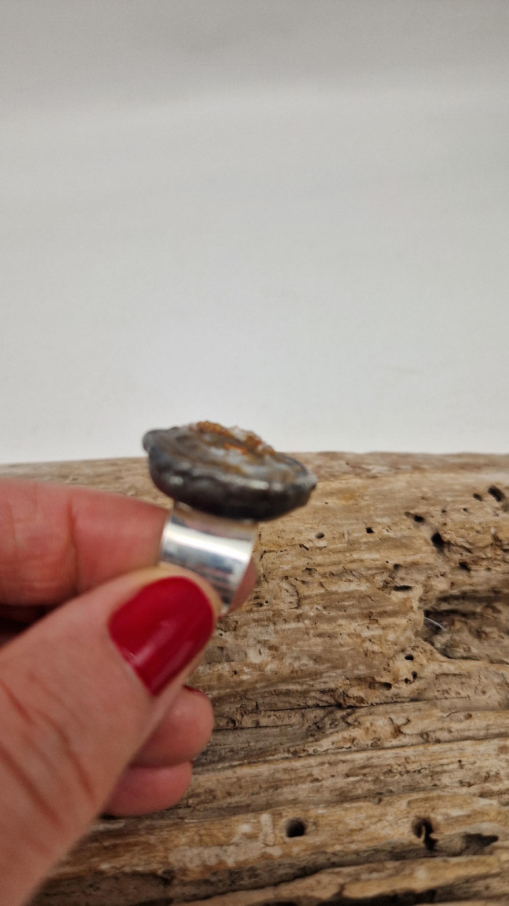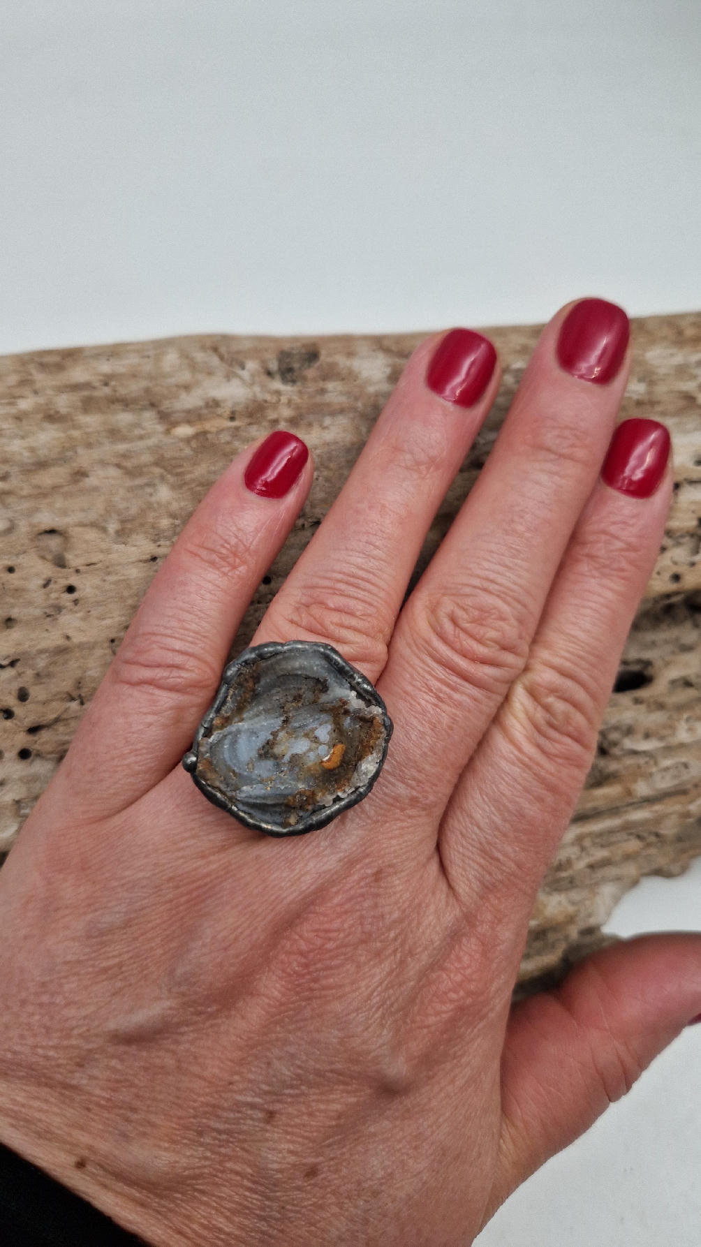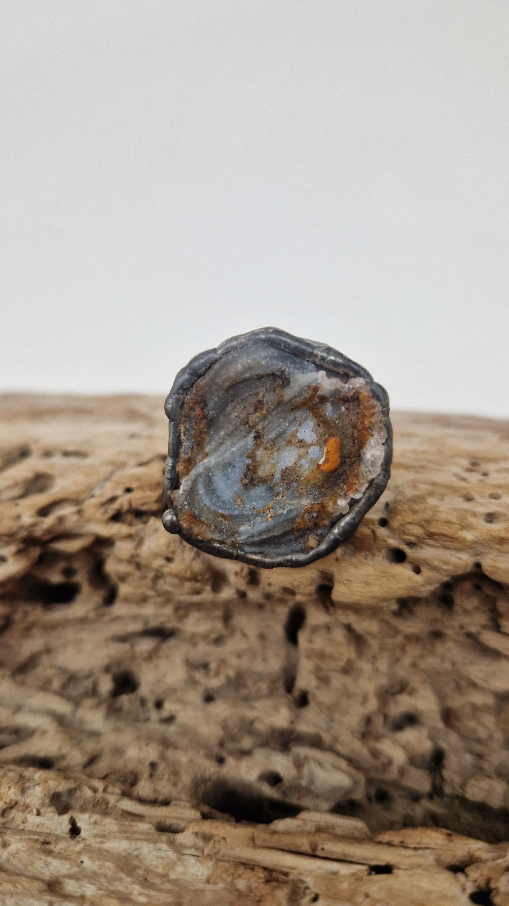 Niewielki, ale prześliczny pierścionek z chalcedonem,  który wygląda jak obraz, przenikające się szarości, błękity i rudości…stworzone przez naturę w dalekiej Brazylii, a potem subtelnie oprawione w metal…