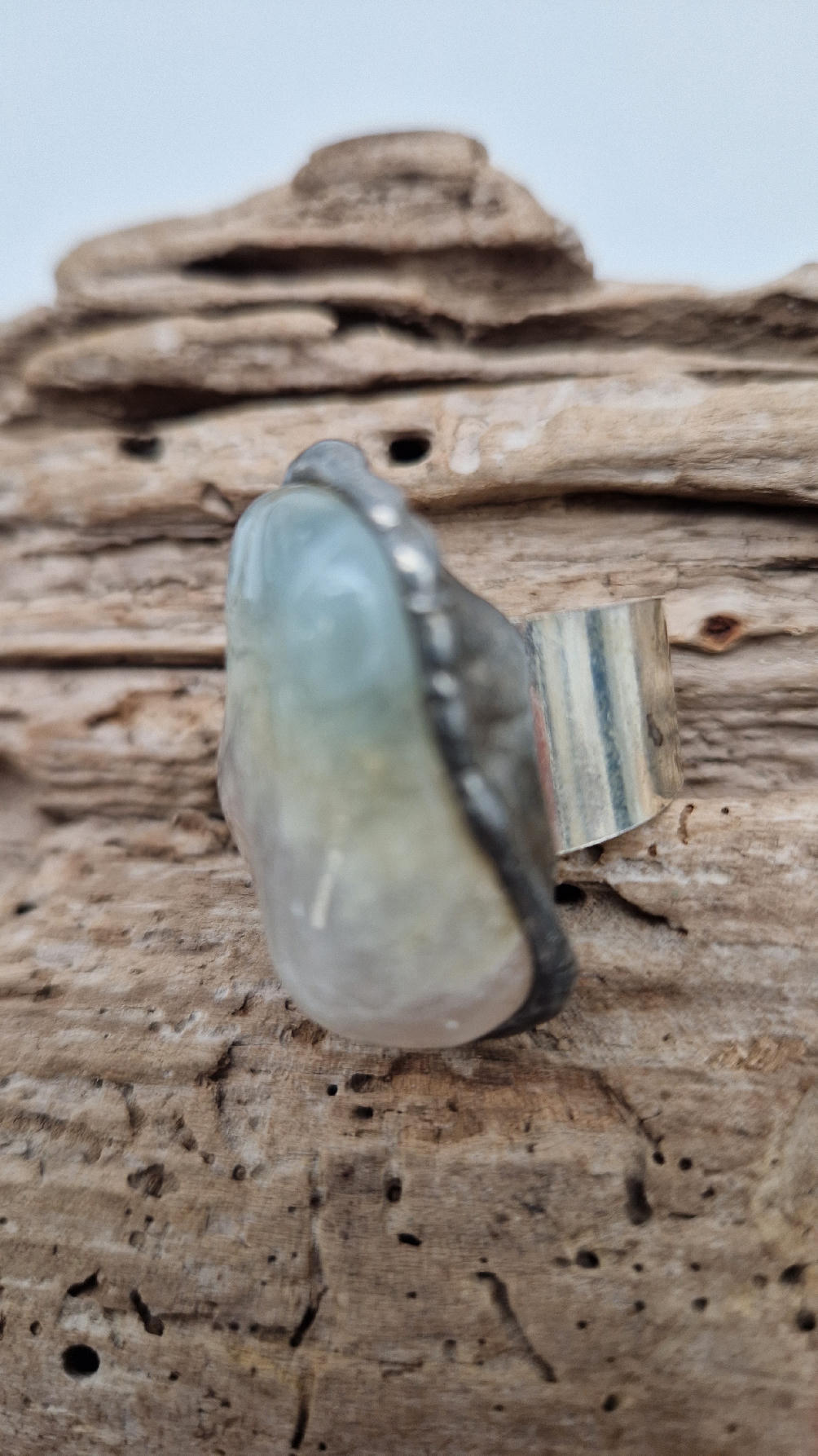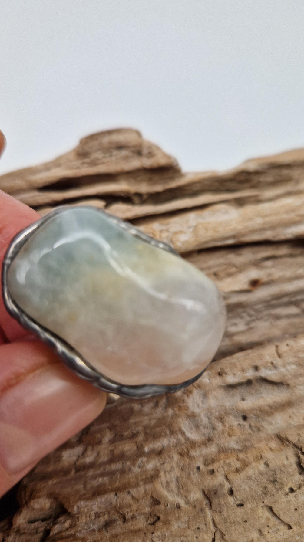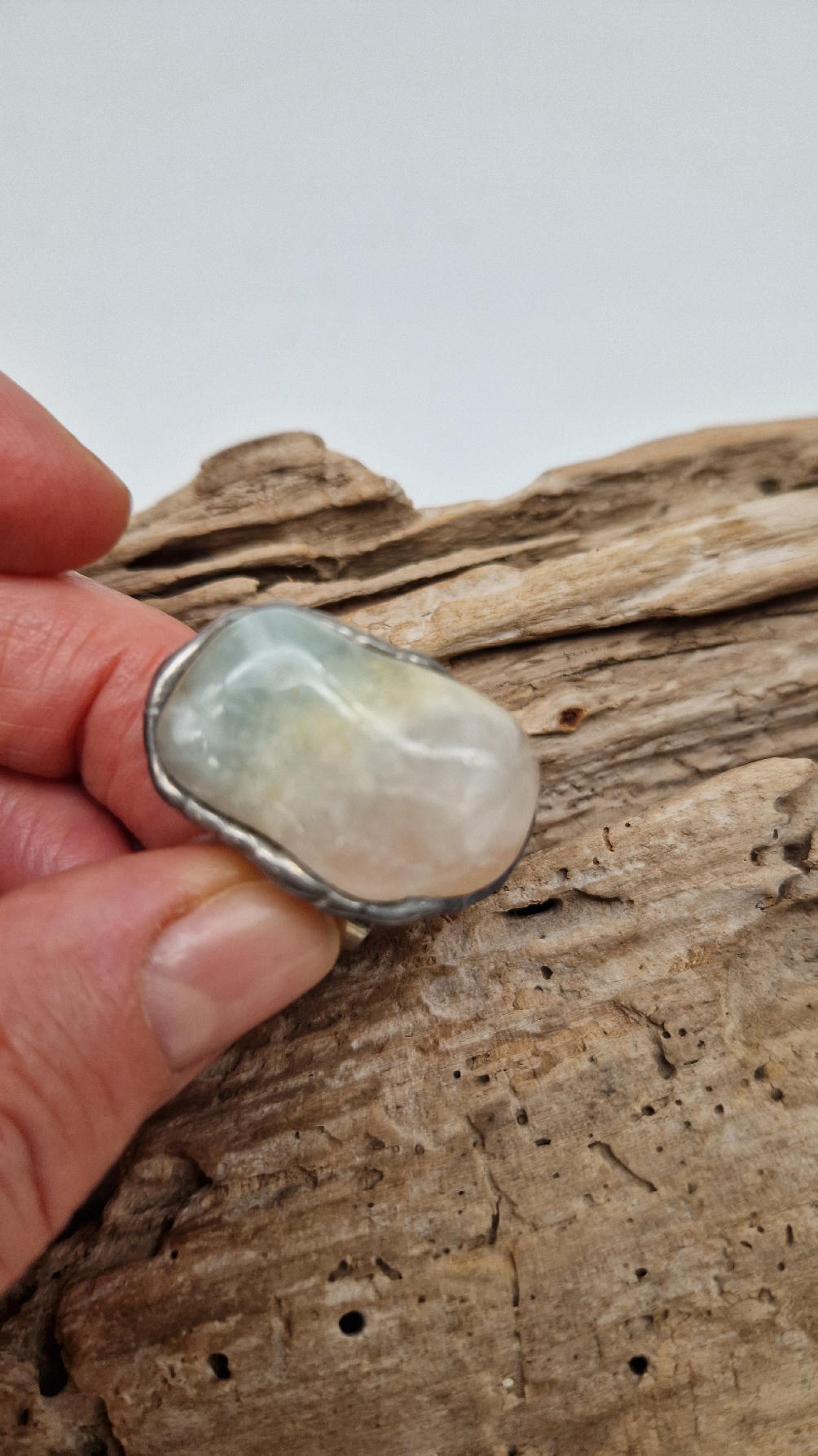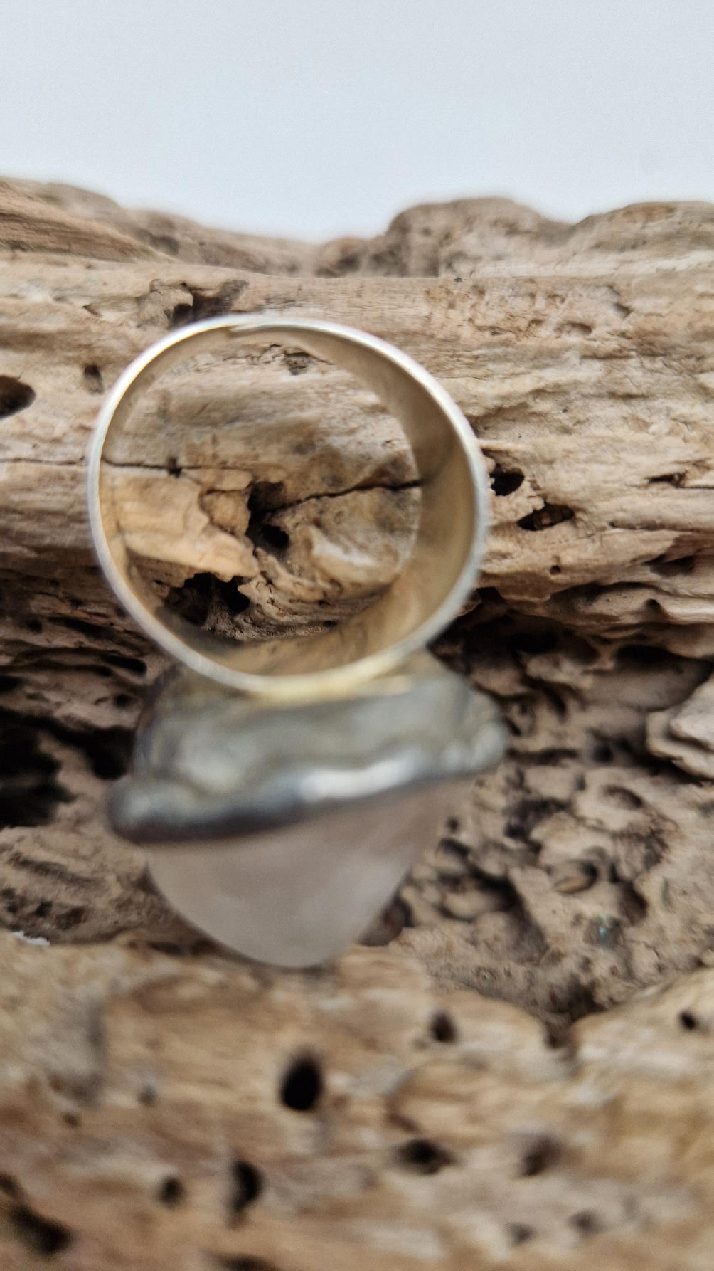 Nieduży, owalny pierścionek z owalnym białym, lekko perłowym, cieniowanym jakby oczkiem z naturalnym kamieniem .
