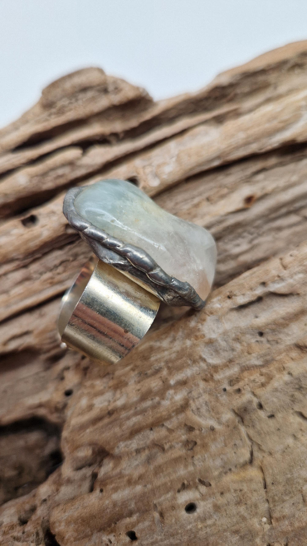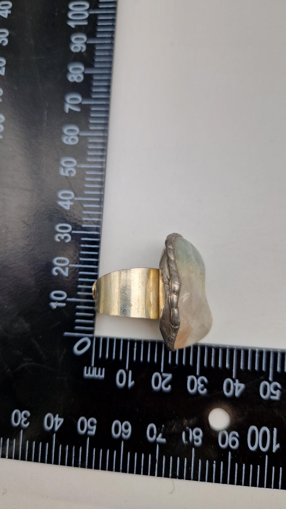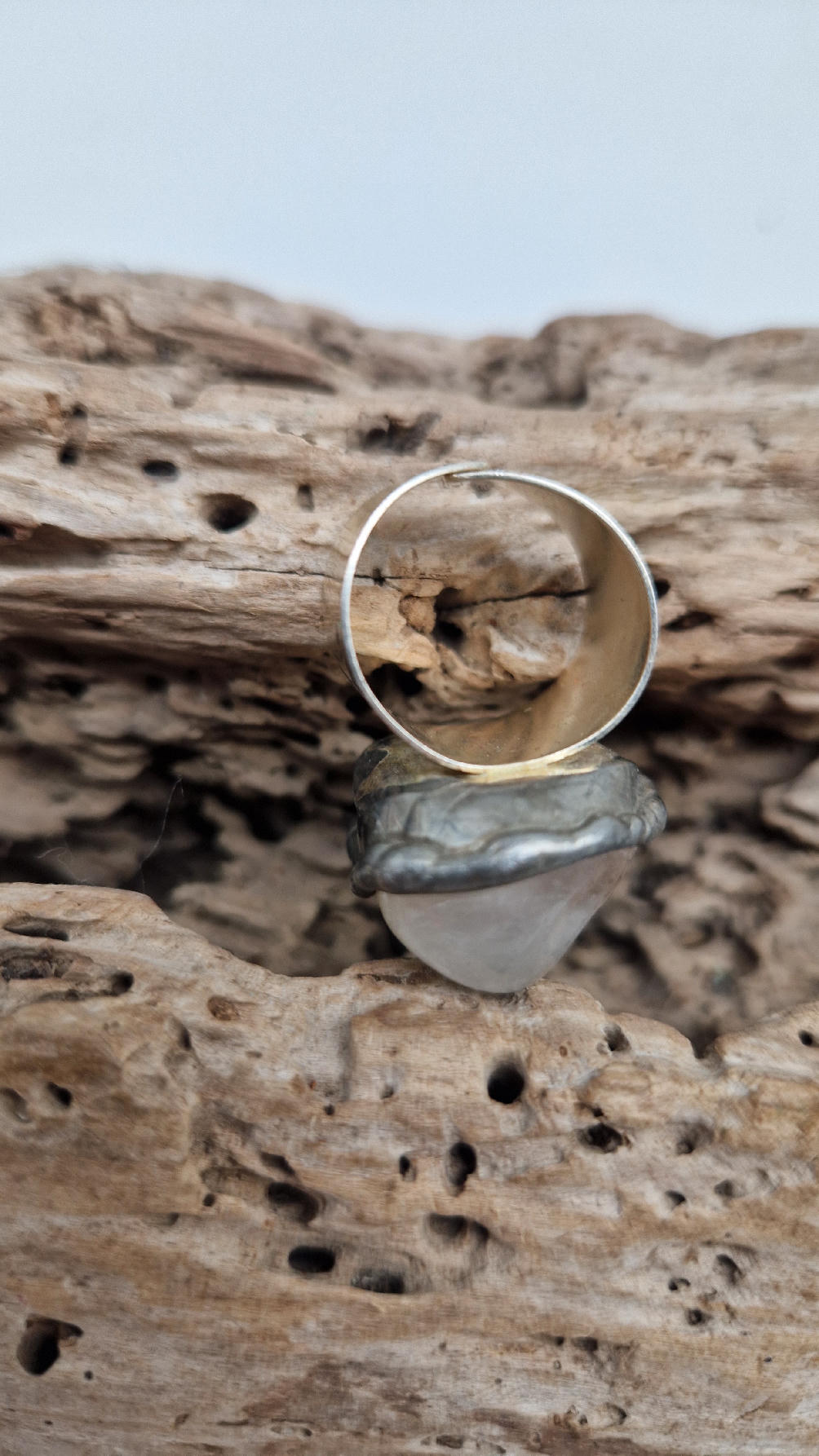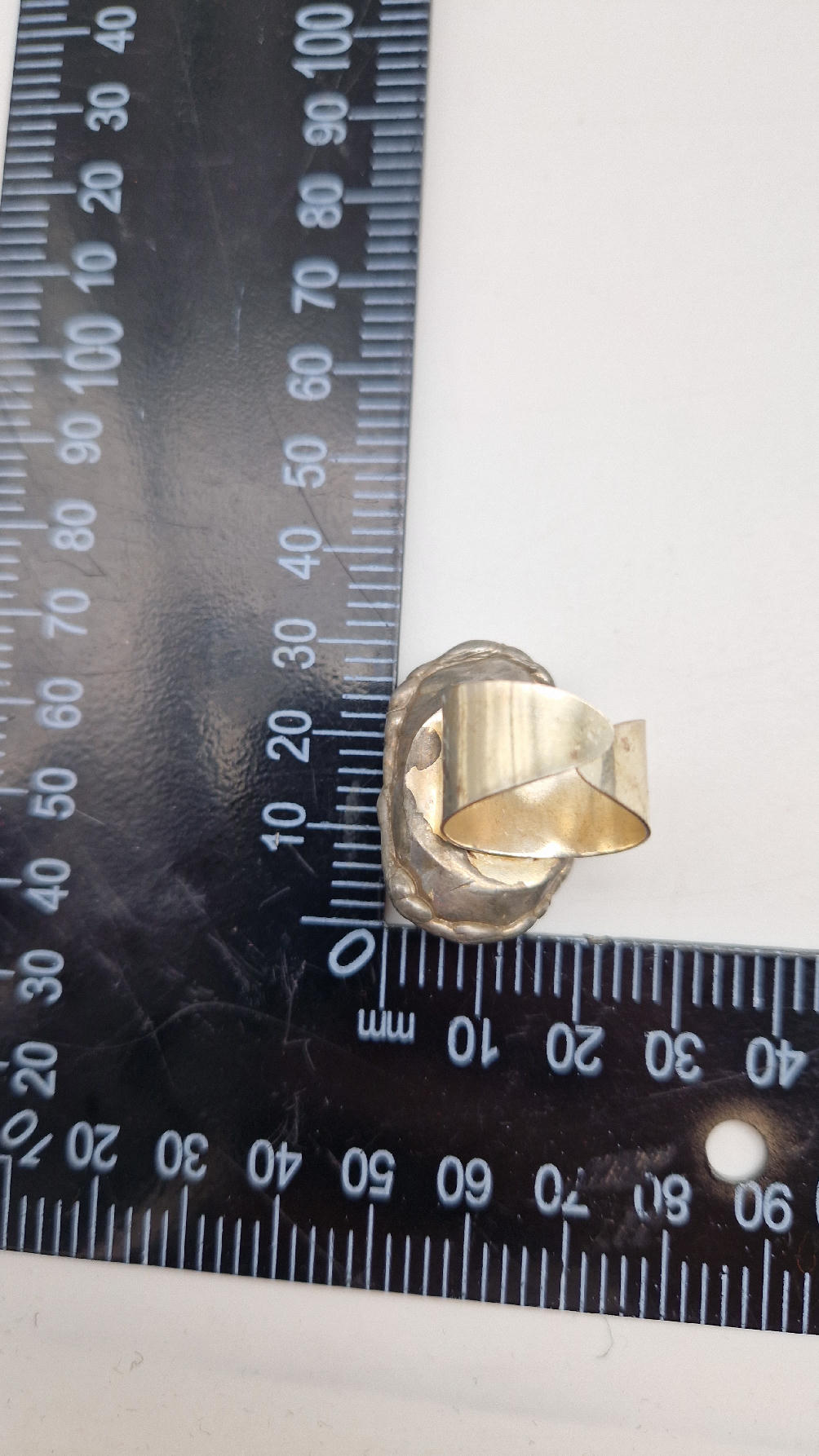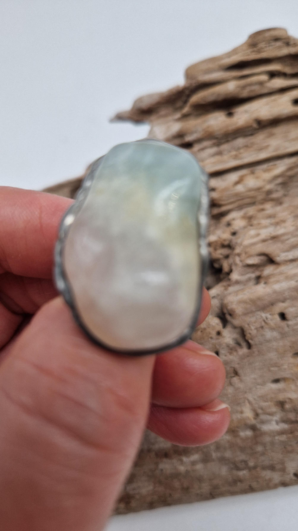 Nieduży, owalny pierścionek z owalnym białym, lekko perłowym, cieniowanym jakby oczkiem z naturalnym kamieniem .