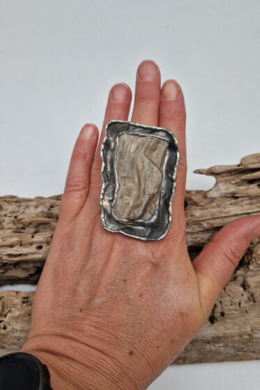 Duży, prostokątny pierścionek z prostokątnym białym, lekko perłowym oczkiem z naturalnym kamieniem o uroczej nazwie Selenit