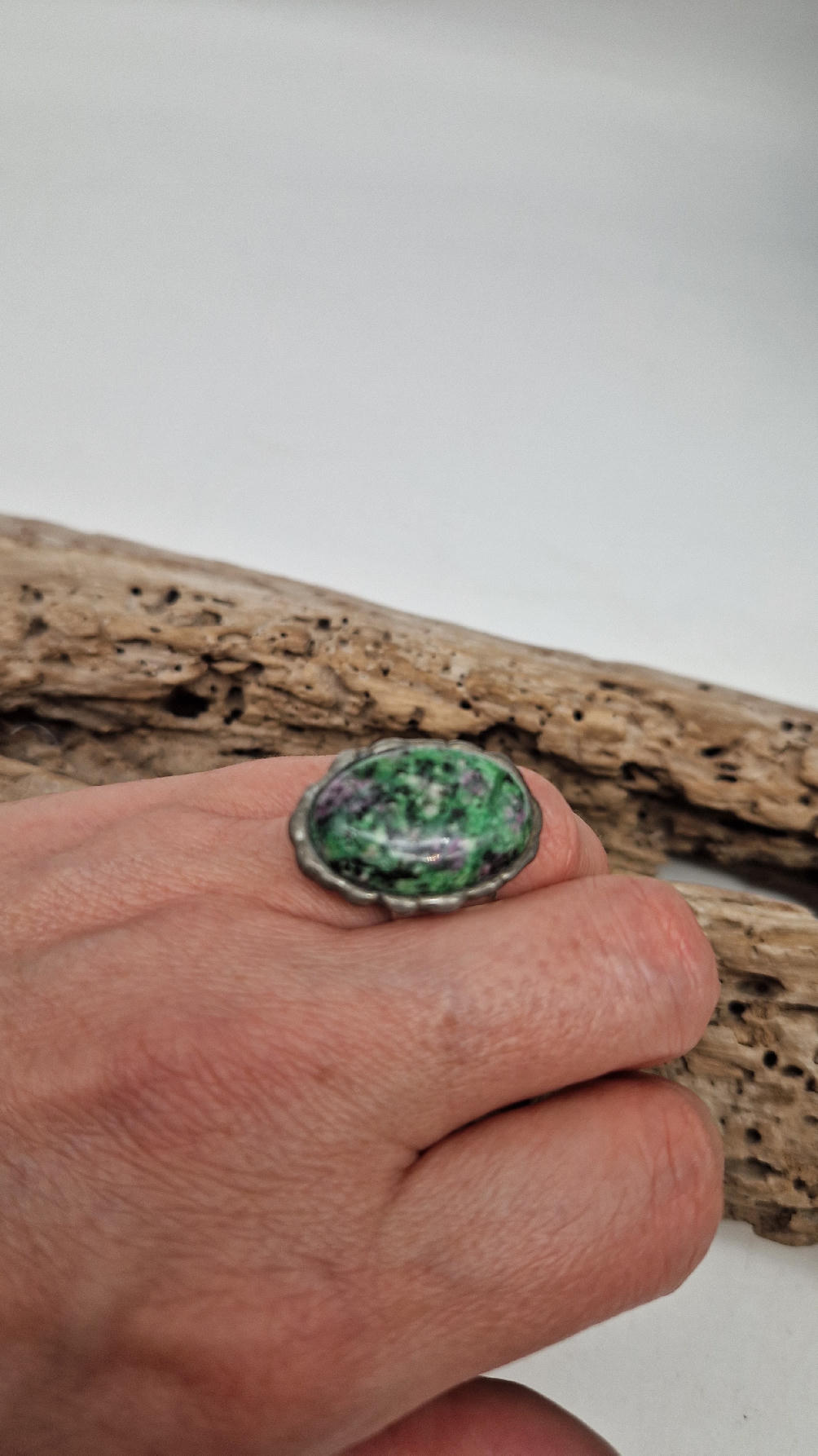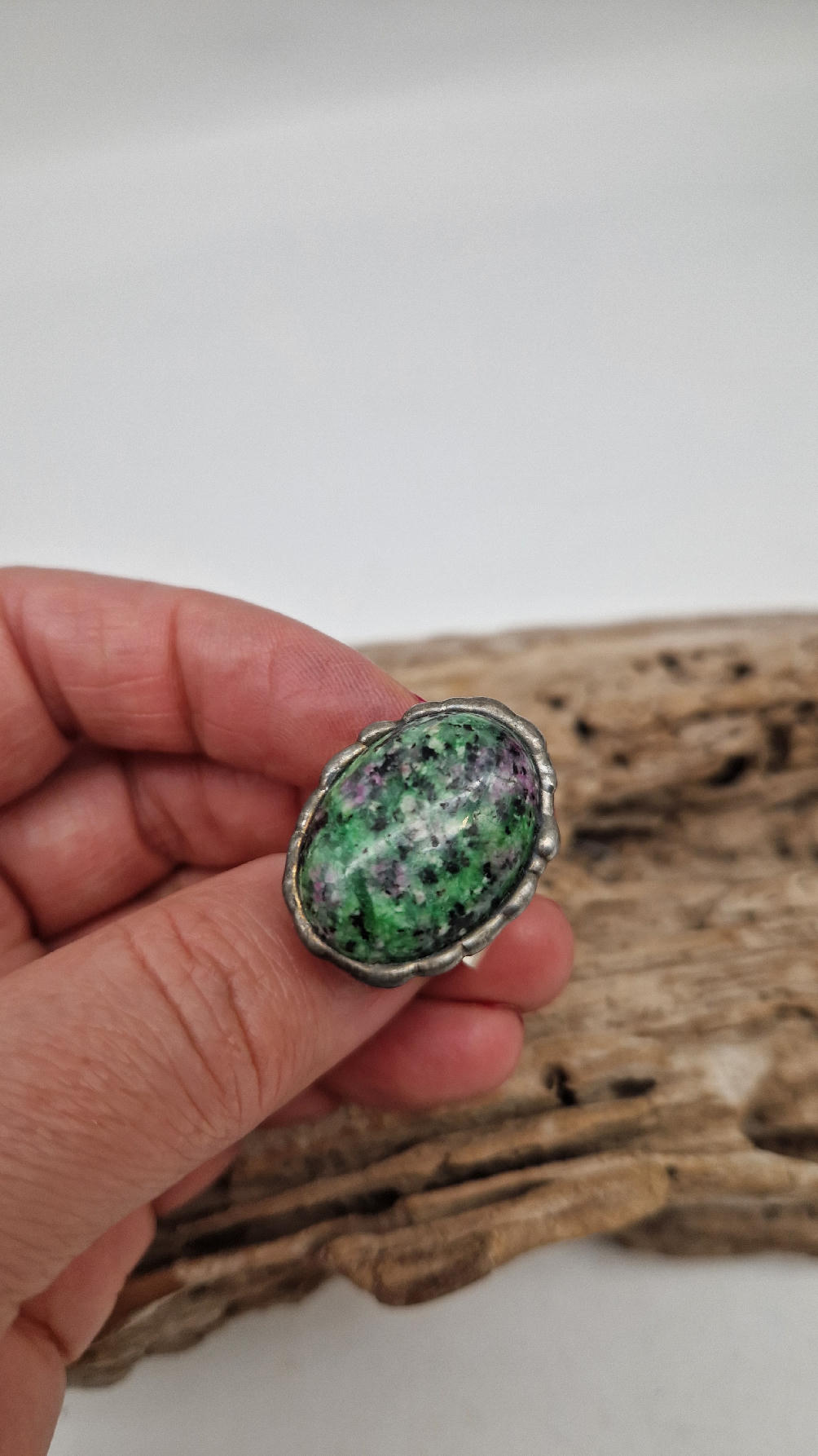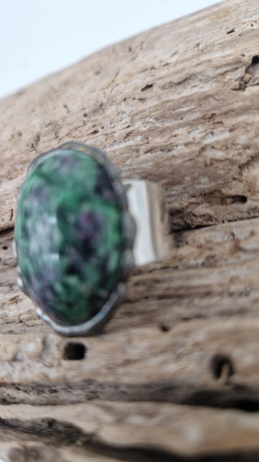 Megazielony, śliczny , owalny pierścionek… a kamień, w środku to ZOIZYT Z RUBINEM z TANZANII spodobał mi się ten głęboki zielony kolor z różowymi plamkami…oprawiony w kutą i patynowaną miedź. Piękna metaloplastyka z pięknym kamieniem . Pierścionek ma regulowaną obrączkę, więc pasuje na każdy palec…ale możesz powiesić go na łańcuszku lub rzemieniu, jeśli nie lubisz pierścionków, a podoba Ci się forma i kamień…
