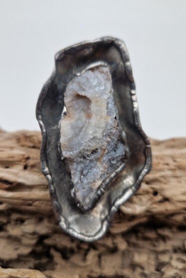 Agat w niezwykłym kolorze, a dookoła po prostu ręcznie robiona metaloplastyka. Pierścionek ma regulowaną obrączkę, więc pasuje na każdy palec…ale możesz powiesić go na łańcuszku lub rzemieniu, jeśli nie lubisz pierścionków, a podoba Ci się forma i kamień…
