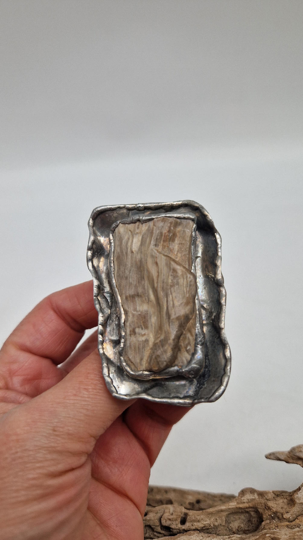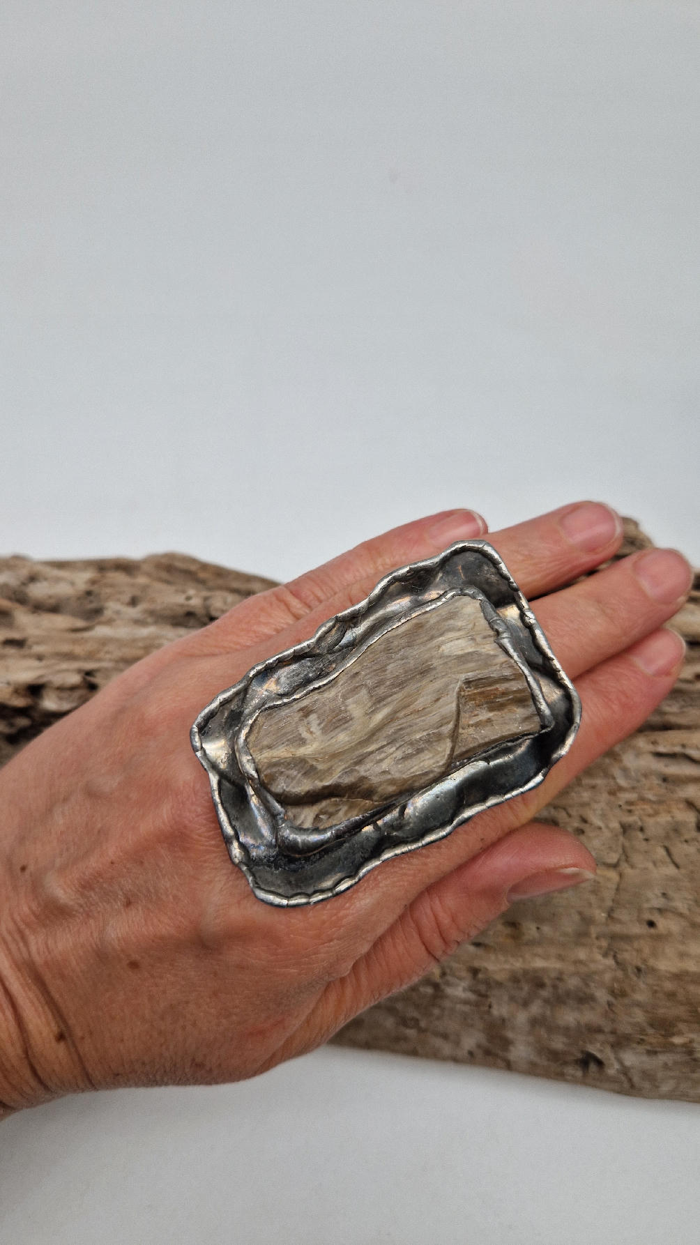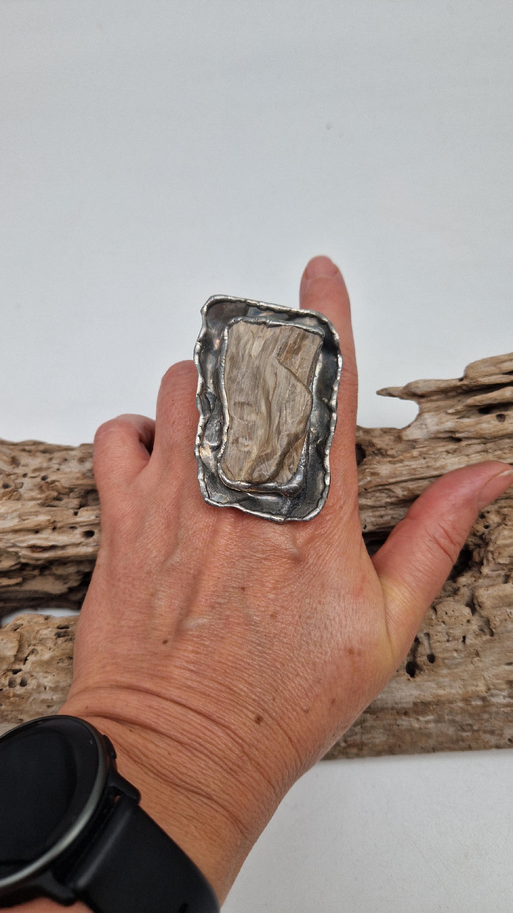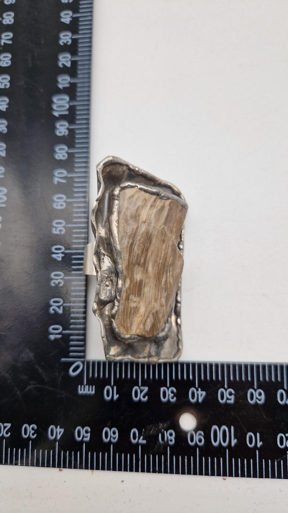 Niezwykle piękny, bardzo duży prostokątny pierścionek, którego oczkiem jest piękny, nieregularny i nieoszlifowany kawałek skamieniałego drewna z polskiego roztocza, z urozmaiconym przekrojem, w kolorze cappuccino, oprawiony w kutą i patynowaną miedź. Piękna metaloplastyka z pięknym kamieniem . Pierścionek ma regulowaną obrączkę, więc pasuje na każdy palec…ale możesz powiesić go na łańcuszku lub rzemieniu, jeśli nie lubisz pierścionków, a podoba Ci się forma i kamień…