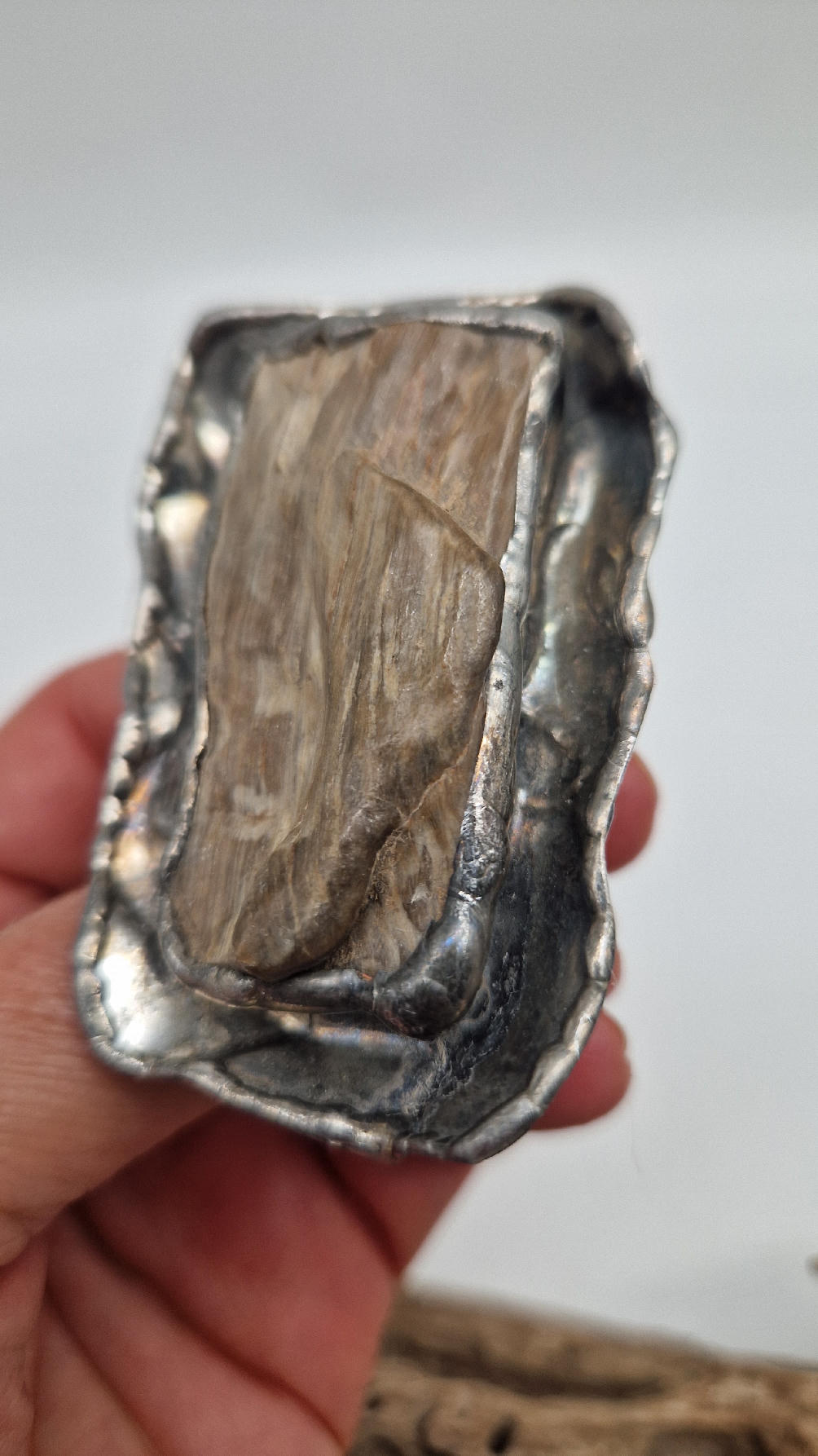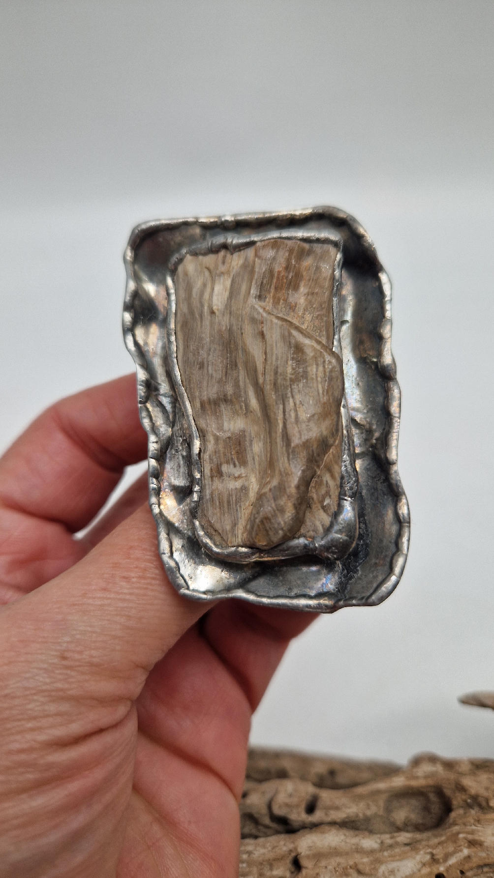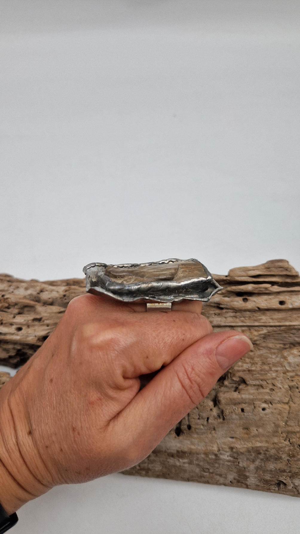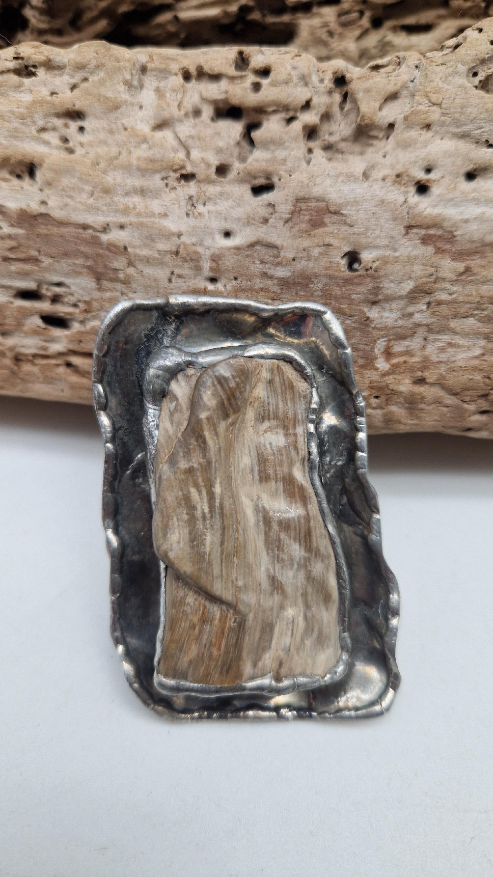 Niezwykle piękny, bardzo duży prostokątny pierścionek, którego oczkiem jest piękny, nieregularny i nieoszlifowany kawałek skamieniałego drewna z polskiego roztocza, z urozmaiconym przekrojem, w kolorze cappuccino, oprawiony w kutą i patynowaną miedź. Piękna metaloplastyka z pięknym kamieniem . Pierścionek ma regulowaną obrączkę, więc pasuje na każdy palec…ale możesz powiesić go na łańcuszku lub rzemieniu, jeśli nie lubisz pierścionków, a podoba Ci się forma i kamień…