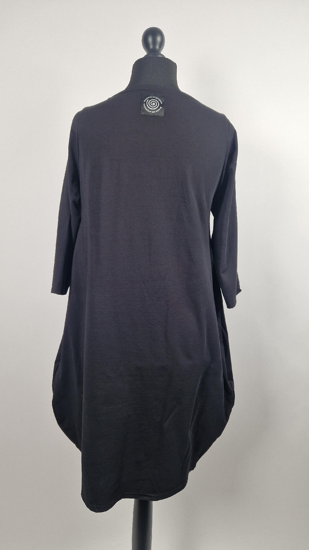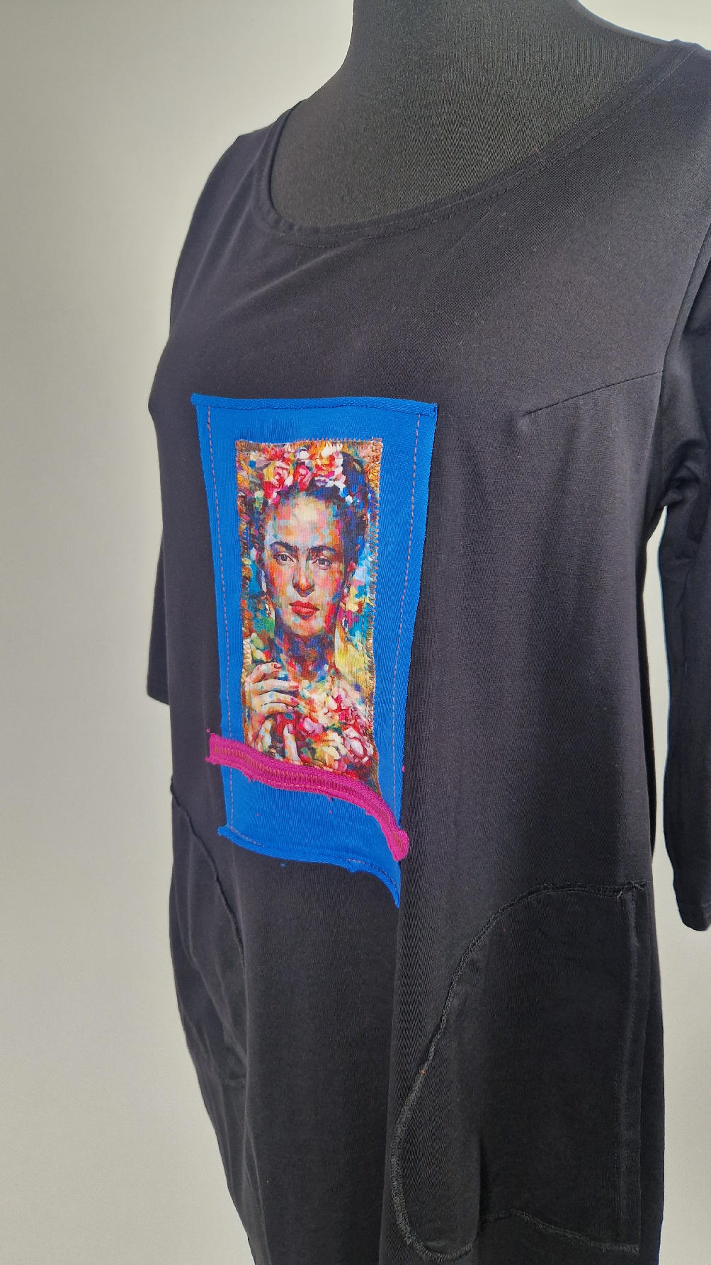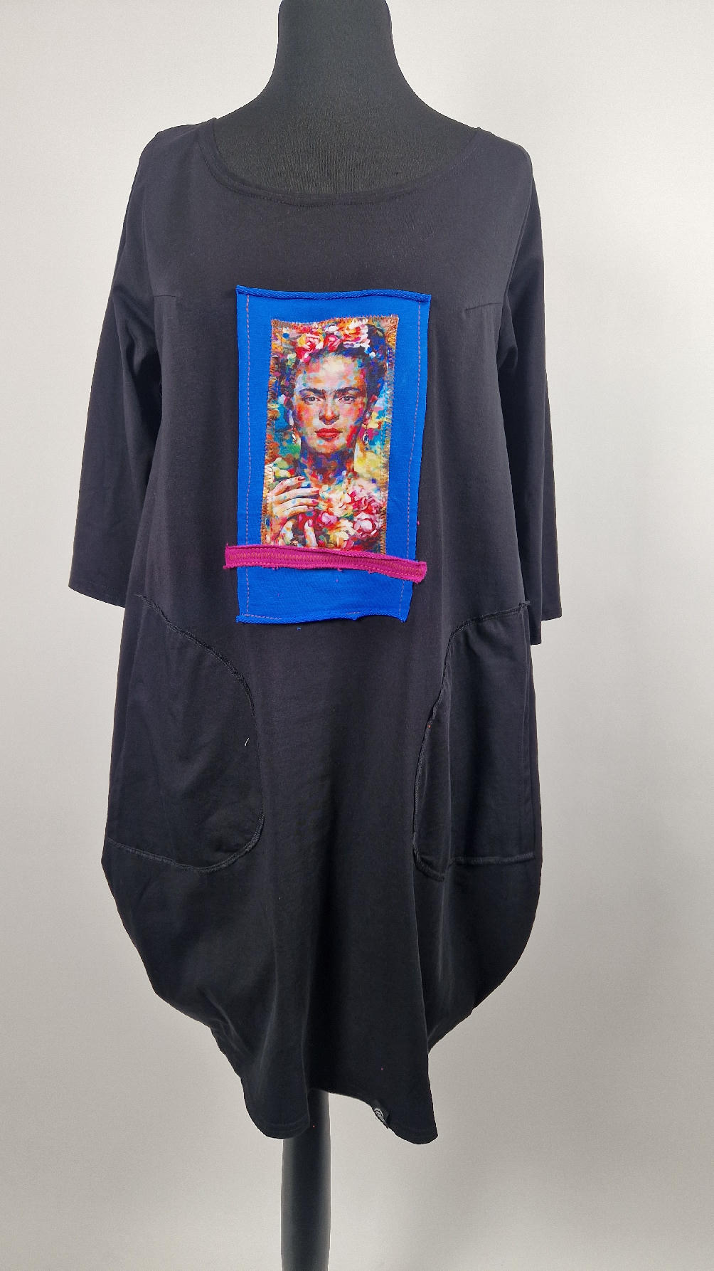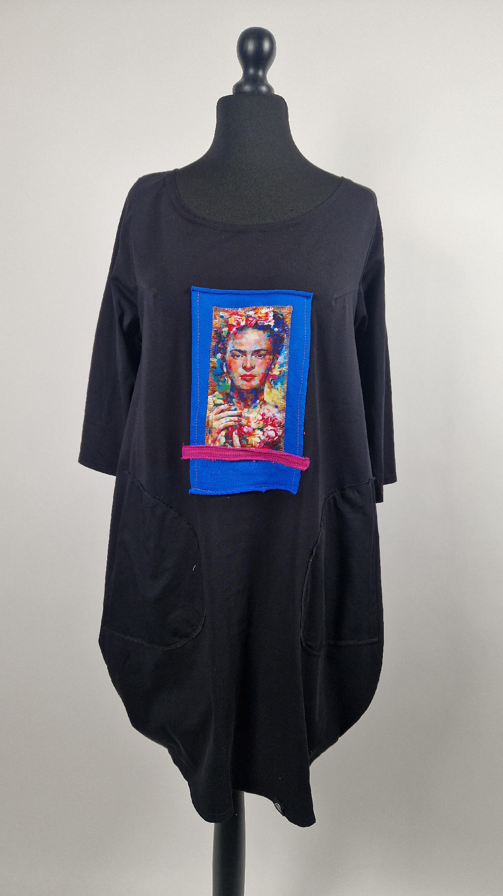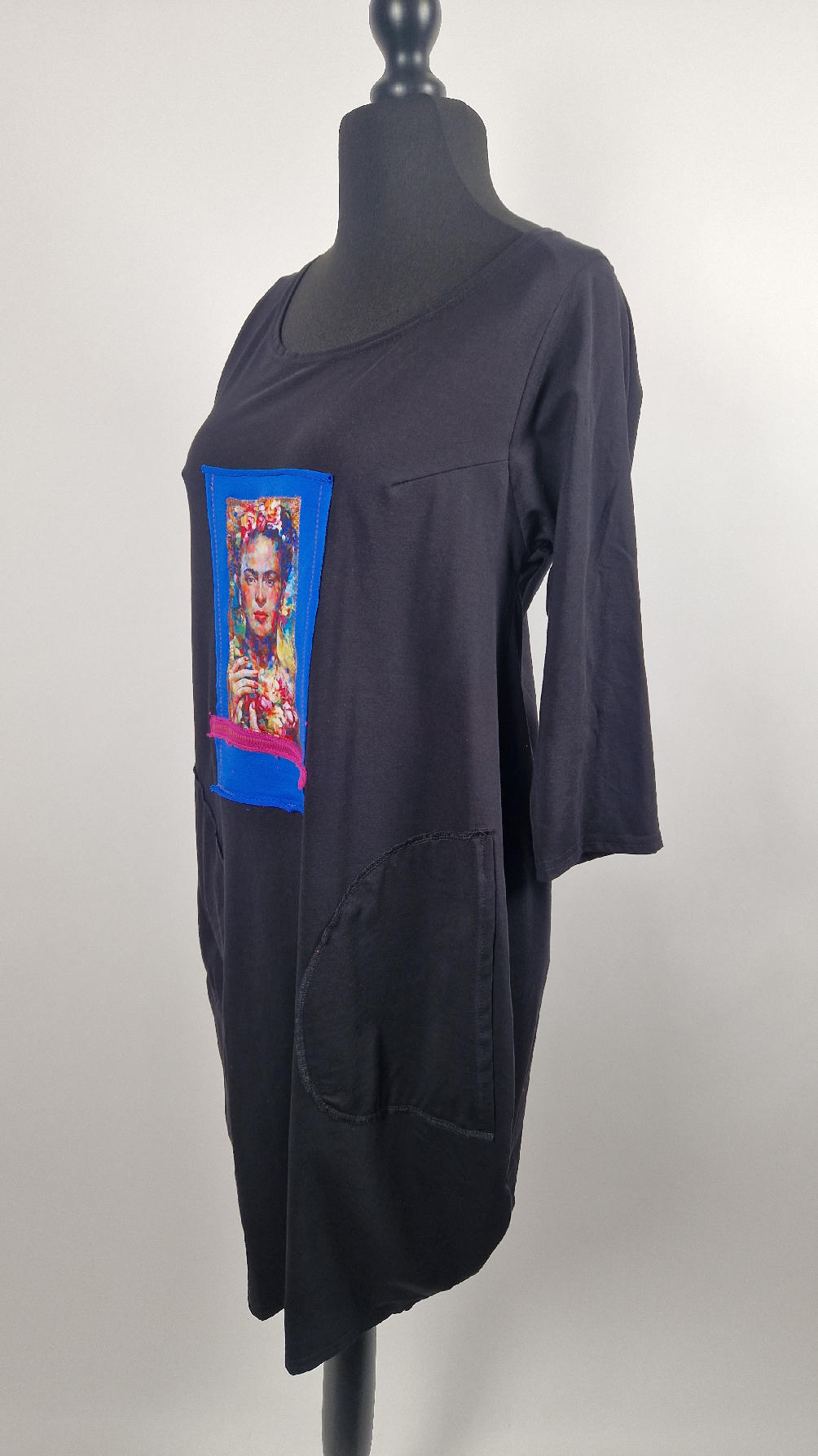 Czarna sukienka z rękawem 3/4 z unikatową aplikacją, z portretem Fridy, uszyta z miękkiej bawełny typu jersey w kształcie, który pięknie ubierze Twoją sylwetkę, podkreślając to co trzeba lekko i luźno opływając pas i biodra; Każda aplikacja , każdy kolaż jest wykonany ręcznie, z różnych tkanin, koronek i cosiów. Każda sukienka jest niepowtarzalna, bo każdy kolaż jest inny.