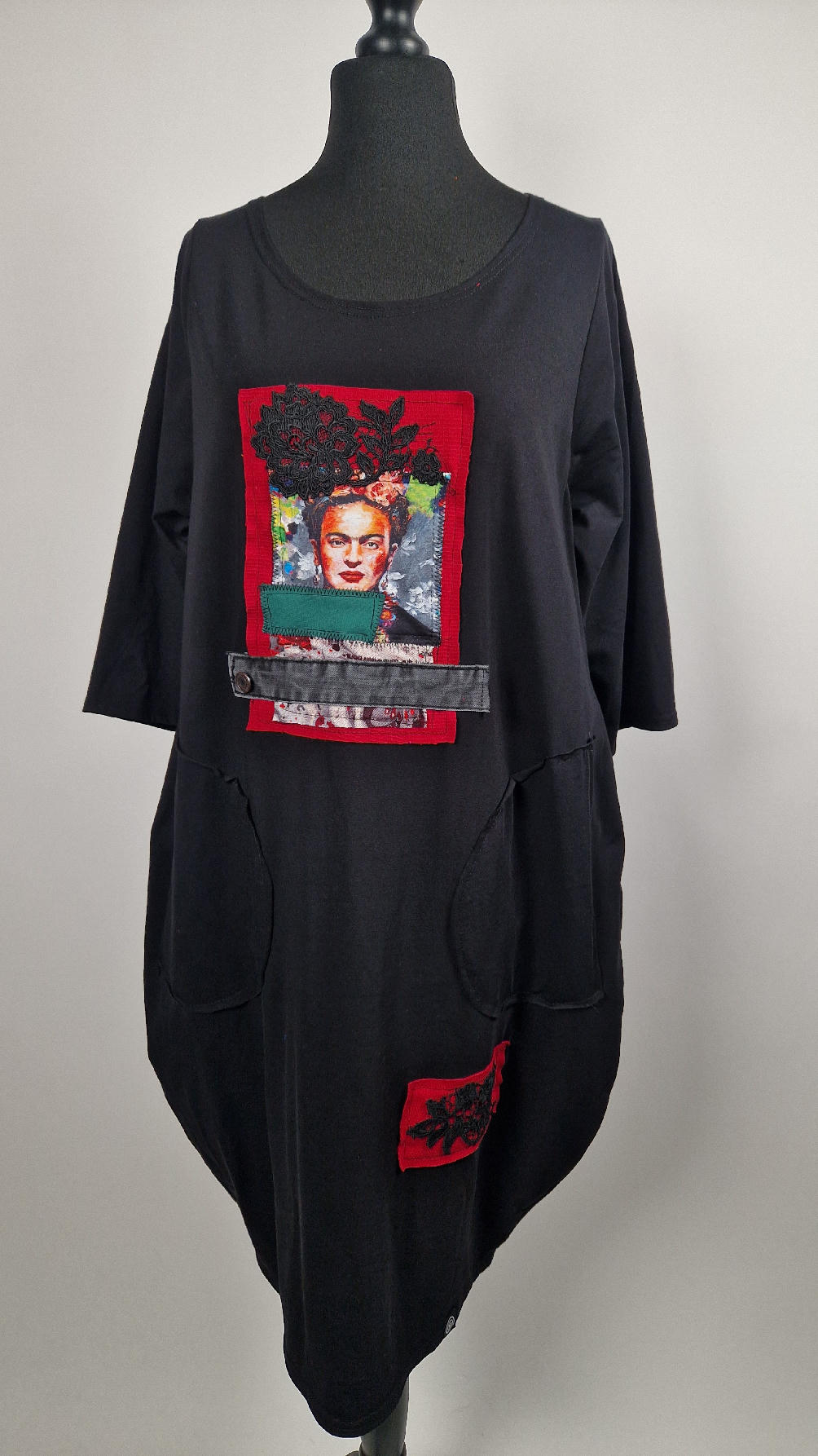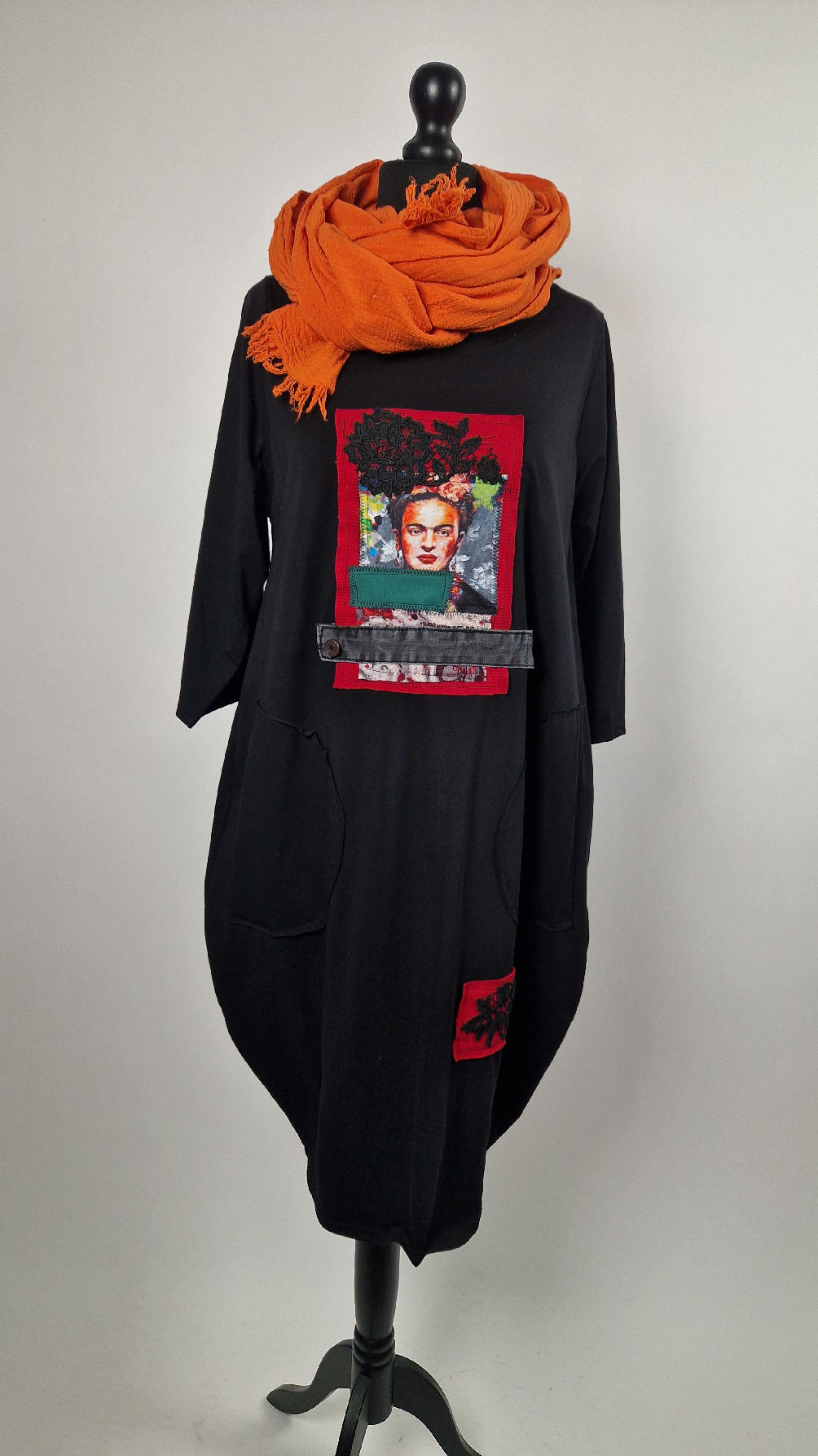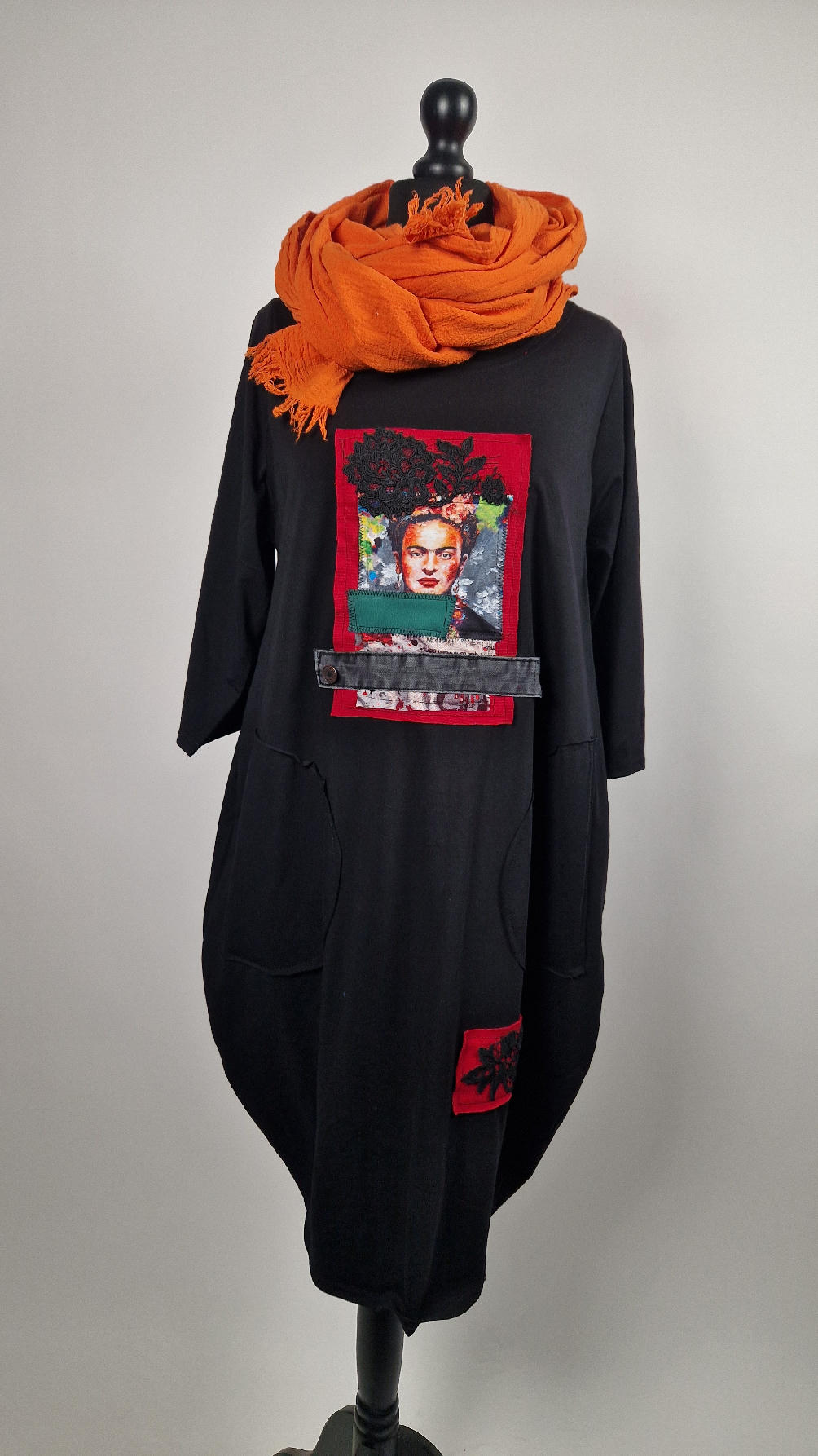 Bawełniana sukienka, w kształcie, który pięknie ubierze Twoją sylwetkę, podkreślając to co trzeba, lekko i luźno opływając pas i biodra; z rękawem 3/4, z dużymi , wygodnymi kieszeniami, w których możesz schować dłonie. Z przodu duża aplikacja, kolaż z portretem Fridy. Każdy kolaż jest jeden i nie będzie drugiej identycznej sukienki.