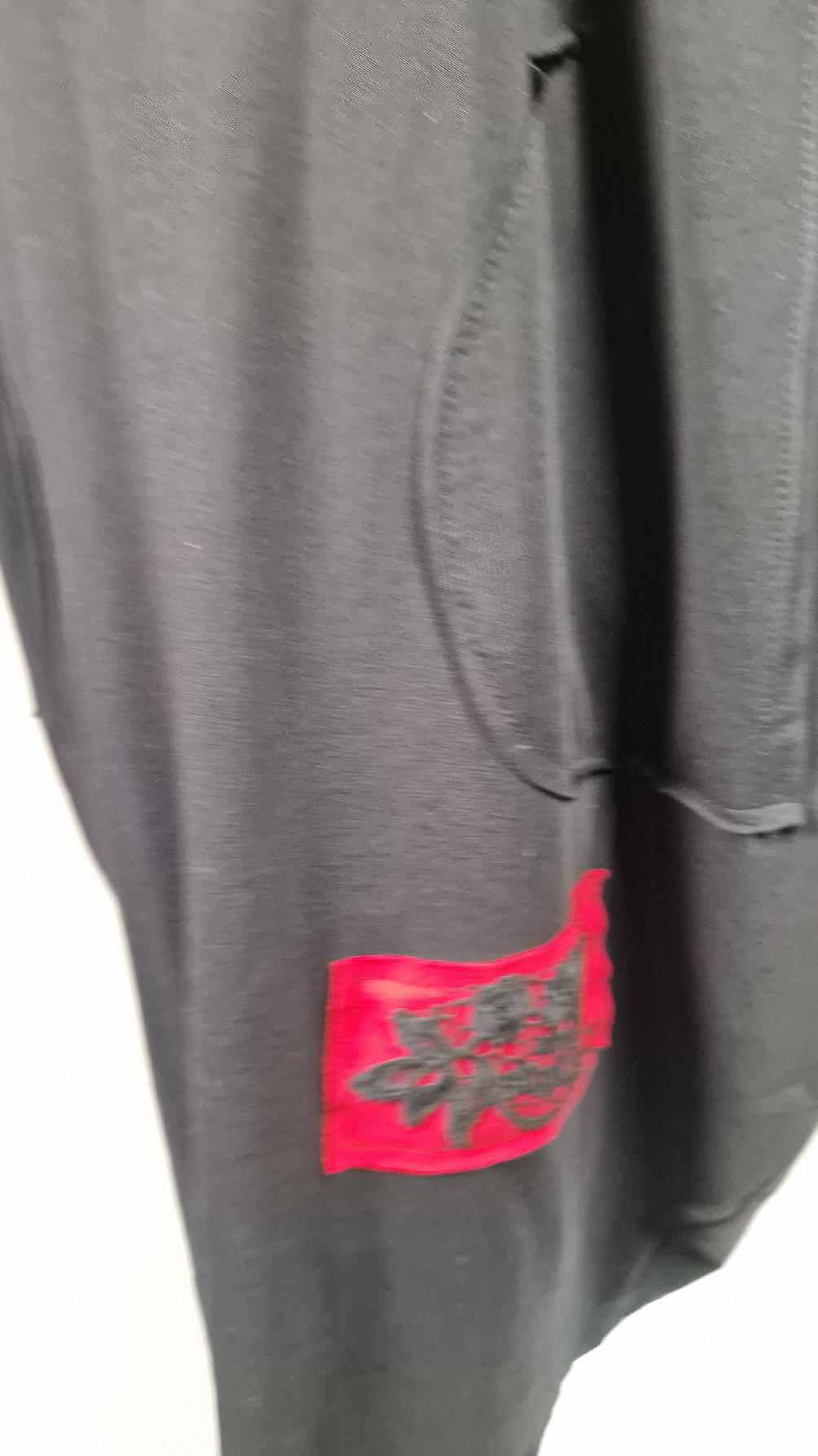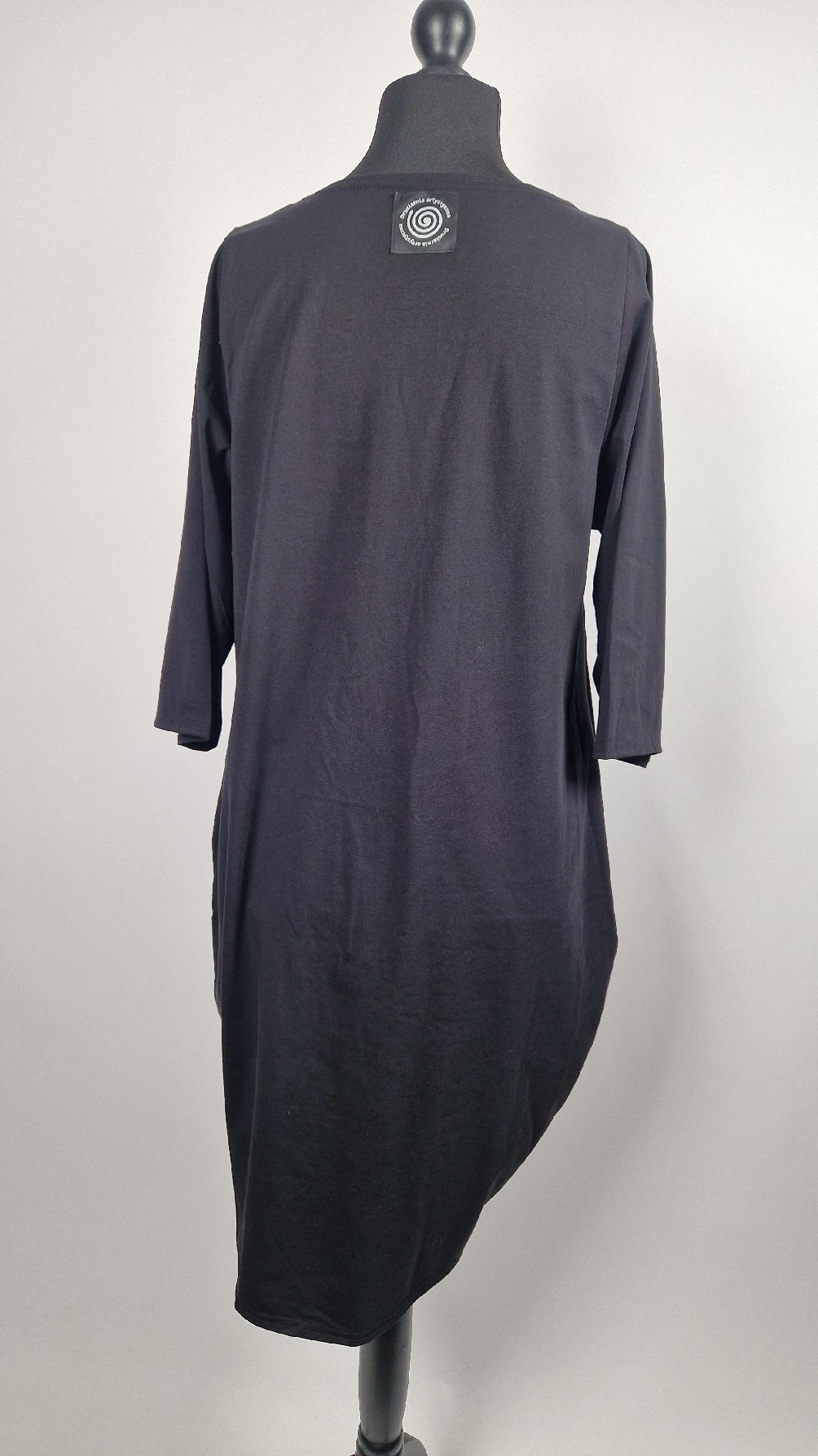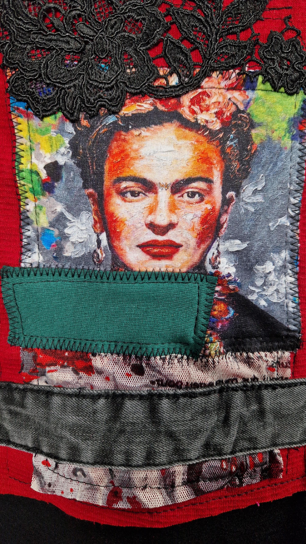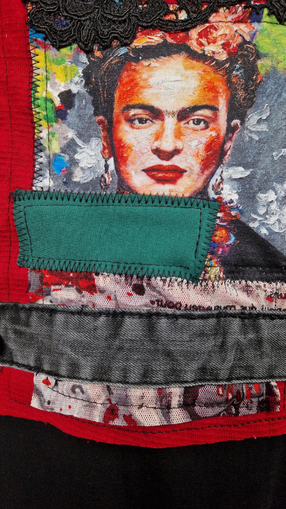 Bawełniana sukienka, w kształcie, który pięknie ubierze Twoją sylwetkę, podkreślając to co trzeba, lekko i luźno opływając pas i biodra; z rękawem 3/4, z dużymi , wygodnymi kieszeniami, w których możesz schować dłonie. Z przodu duża aplikacja, kolaż z portretem Fridy. Każdy kolaż jest jeden i nie będzie drugiej identycznej sukienki.