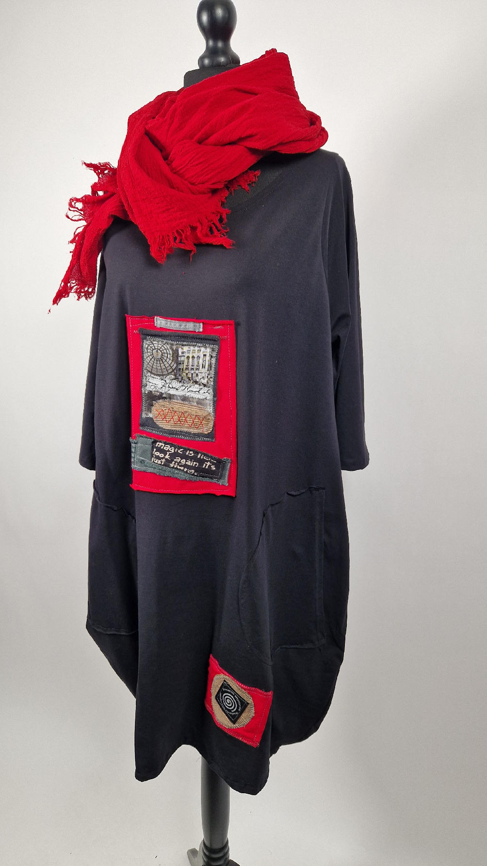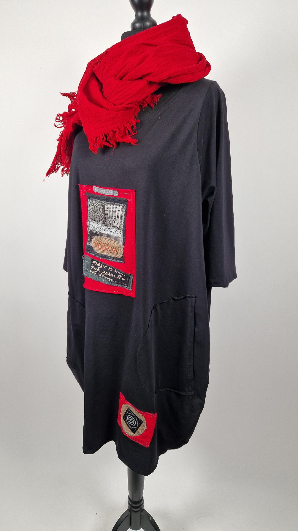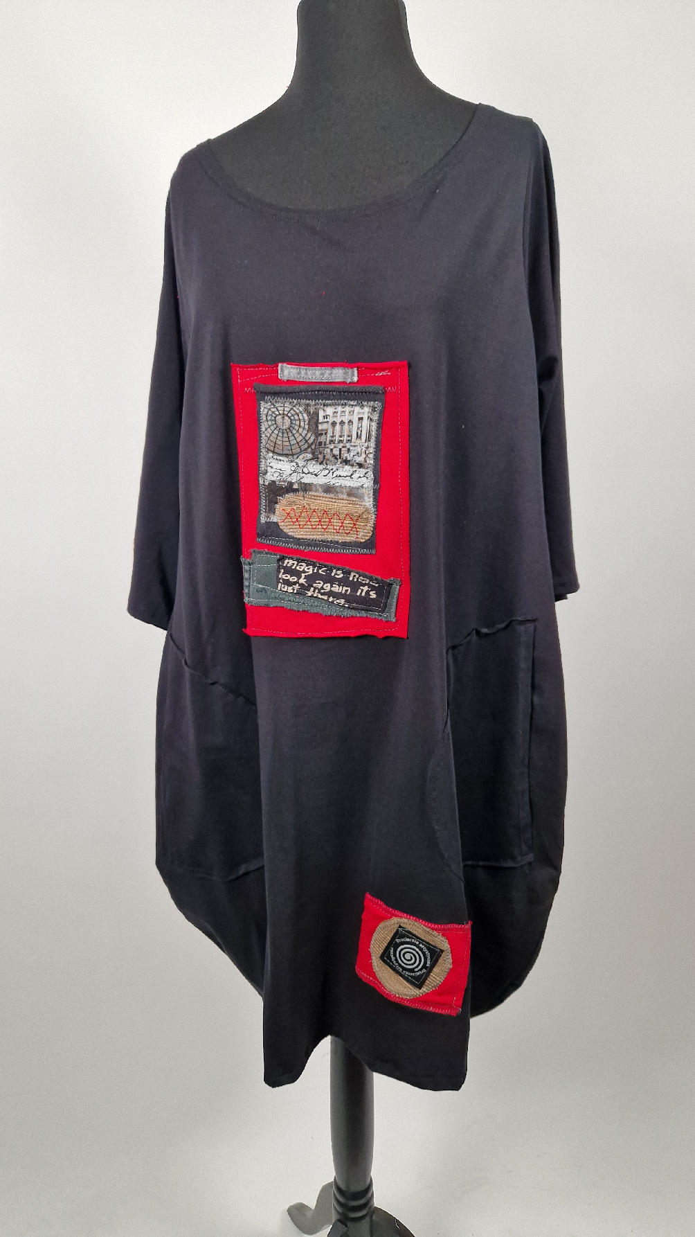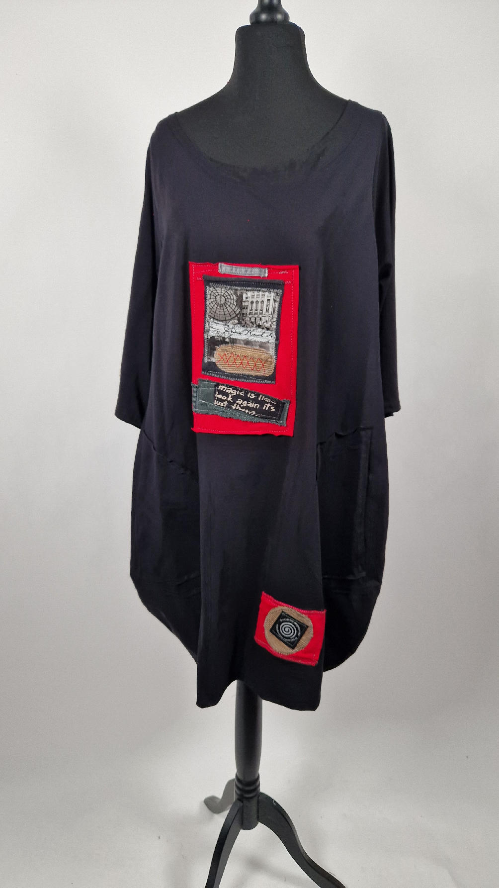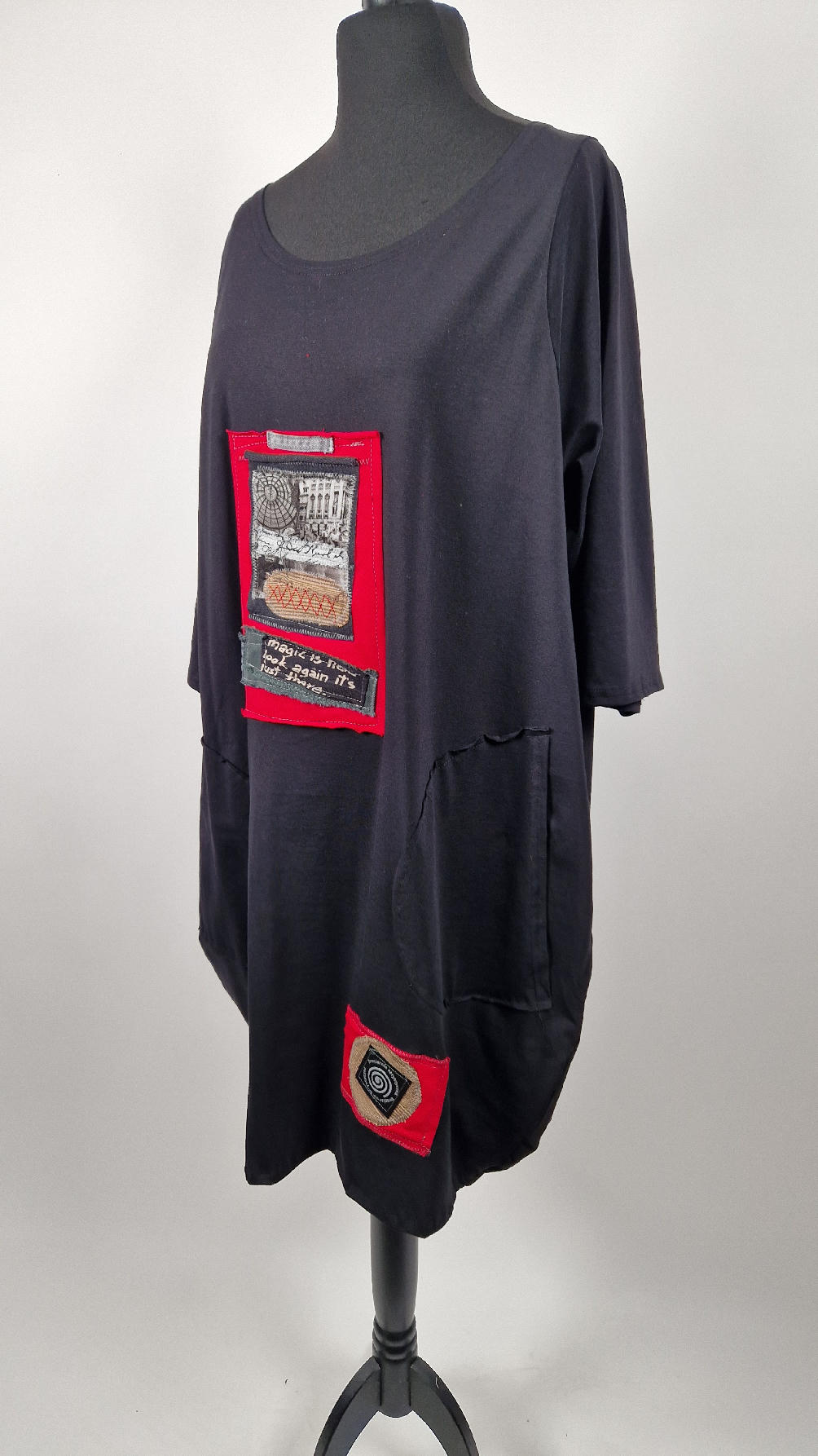 Czarna sukienka z unikatowa aplikacją uszyta z bawełny typu jersey, uniwersalna i całoroczna, z rękawem 3/4…z przodu aplikacja-kolaż tkanin, unikatowy i jedyny dla każdej sukienki…Twoja sukienka jest wyjątkowa…poza tym bardzo wygodna i zgrabna i pokochasz ją od pierwszego zobaczenia.