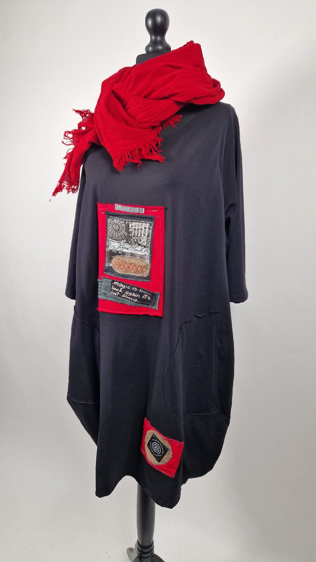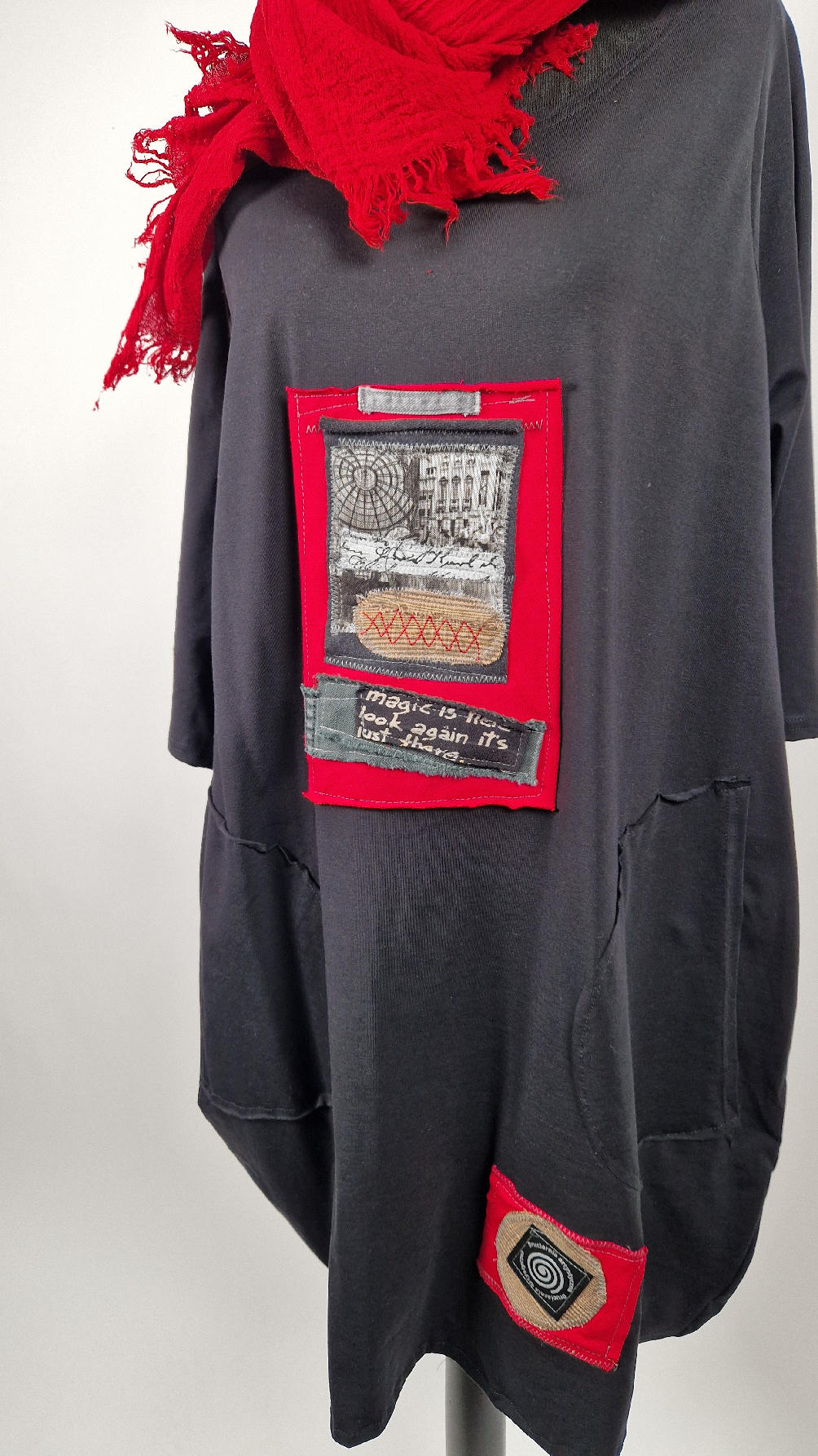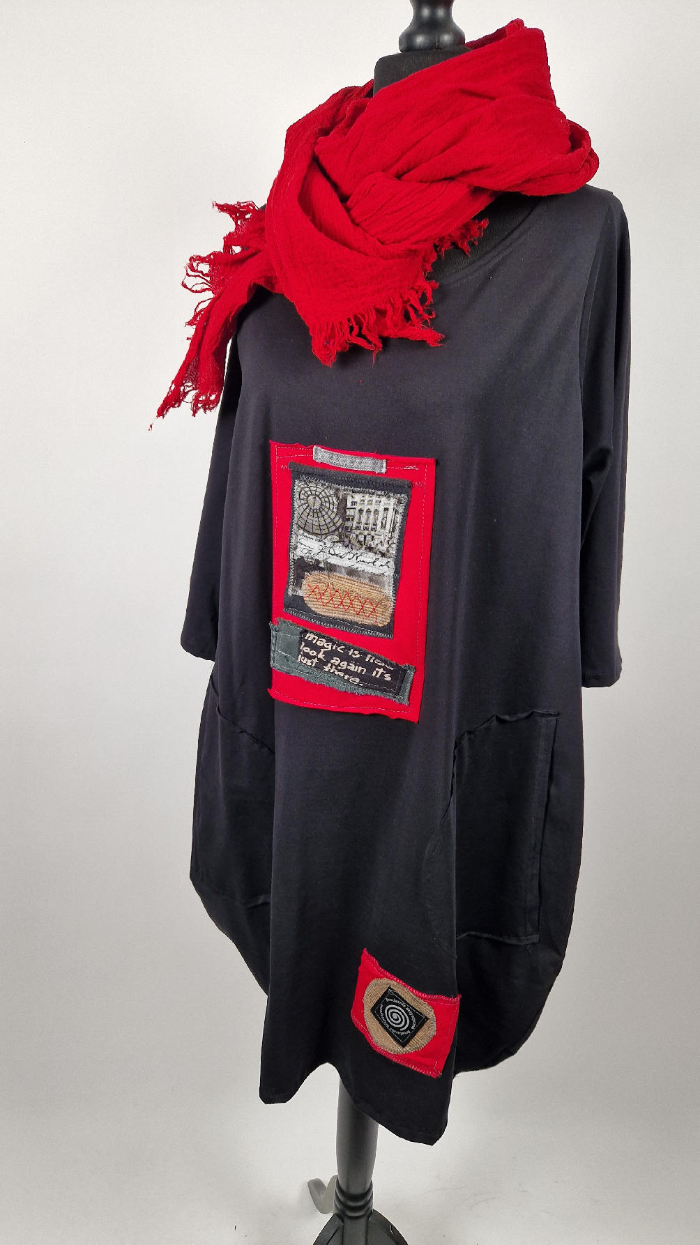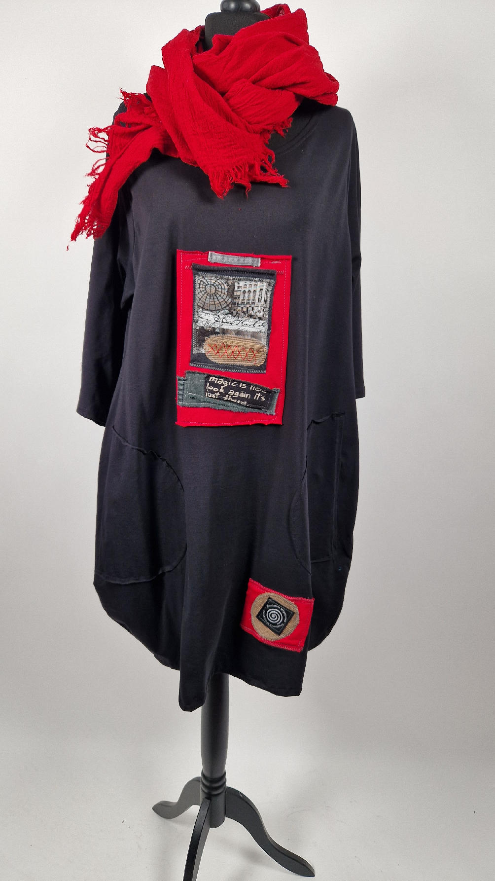 Czarna sukienka z unikatowa aplikacją uszyta z bawełny typu jersey, uniwersalna i całoroczna, z rękawem 3/4…z przodu aplikacja-kolaż tkanin, unikatowy i jedyny dla każdej sukienki…Twoja sukienka jest wyjątkowa…poza tym bardzo wygodna i zgrabna i pokochasz ją od pierwszego zobaczenia.