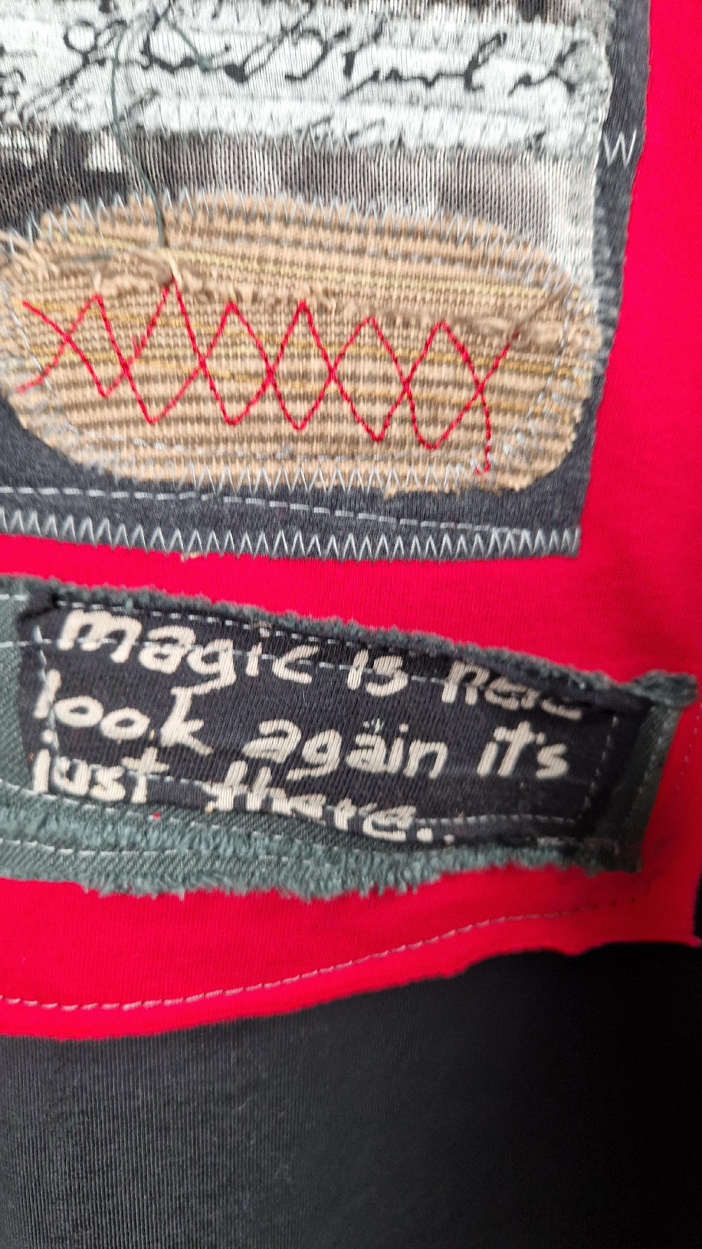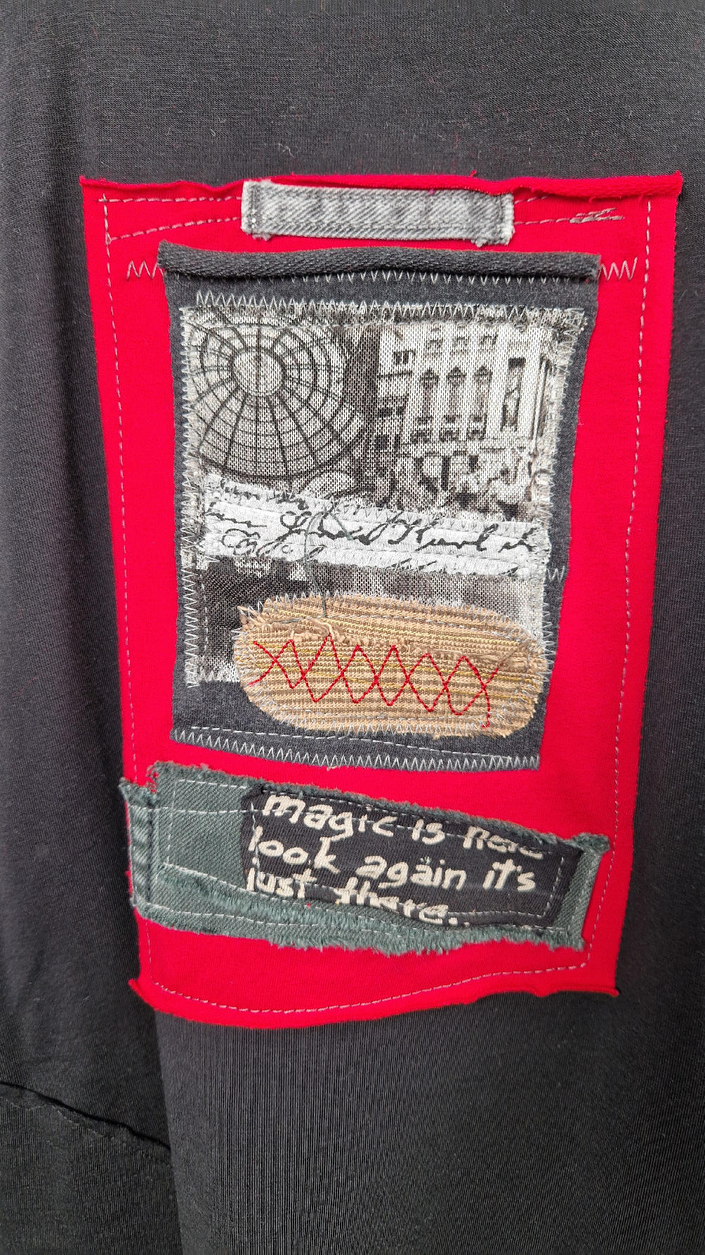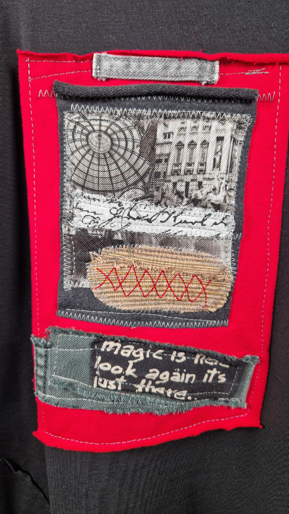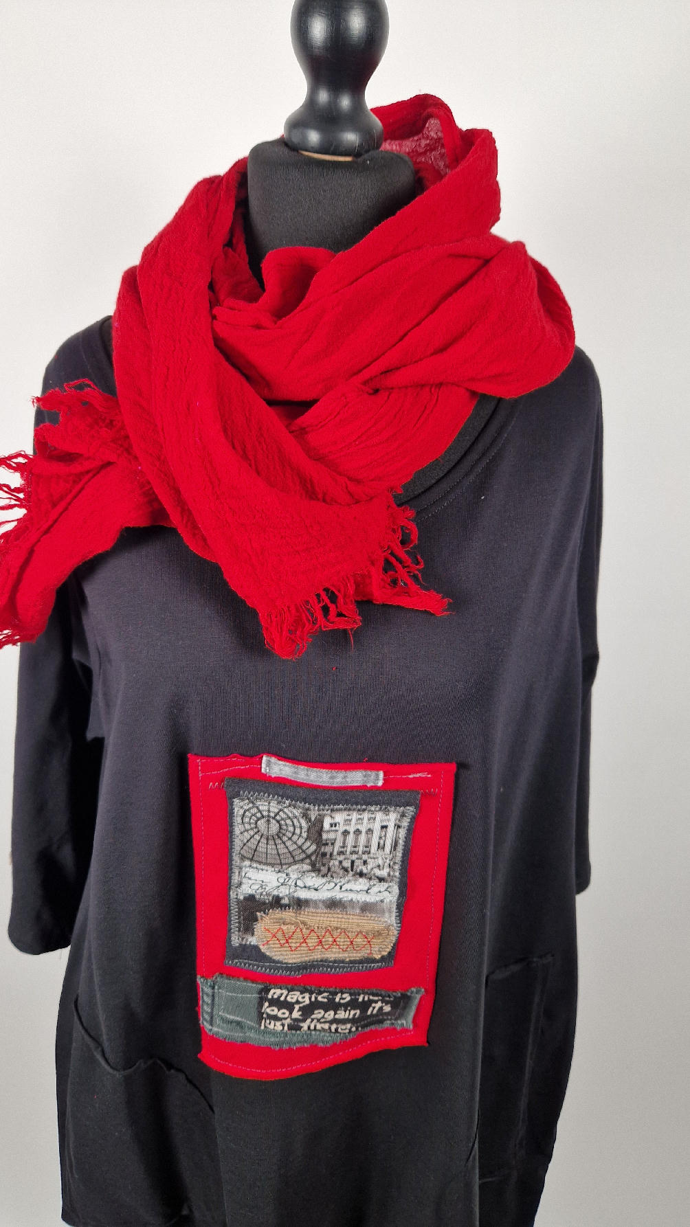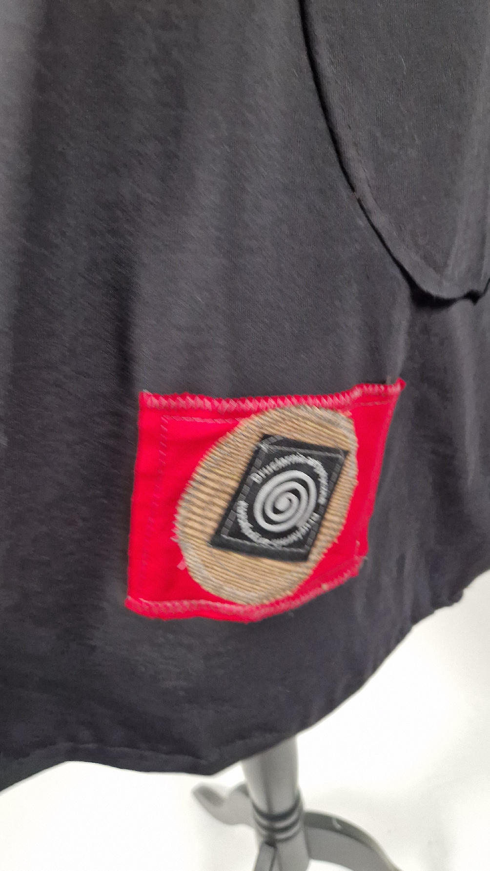 Czarna sukienka z unikatowa aplikacją uszyta z bawełny typu jersey, uniwersalna i całoroczna, z rękawem 3/4…z przodu aplikacja-kolaż tkanin, unikatowy i jedyny dla każdej sukienki…Twoja sukienka jest wyjątkowa…poza tym bardzo wygodna i zgrabna i pokochasz ją od pierwszego zobaczenia.